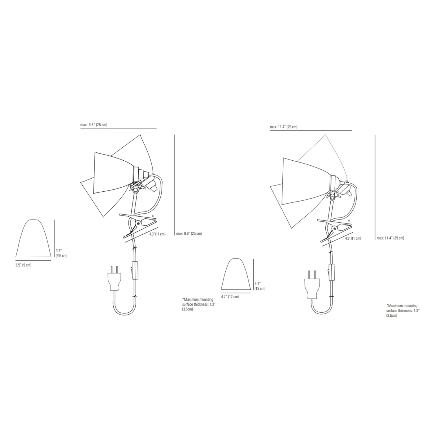 The Hector Dome Clip Table Lamp is a British design classic, perfect in any room of your home. Head can adjust to direct light wherever you need it. Maximum mounting surface is 1.3 inches thick. On/Off Switch is 14 inches from the base of the lamp.