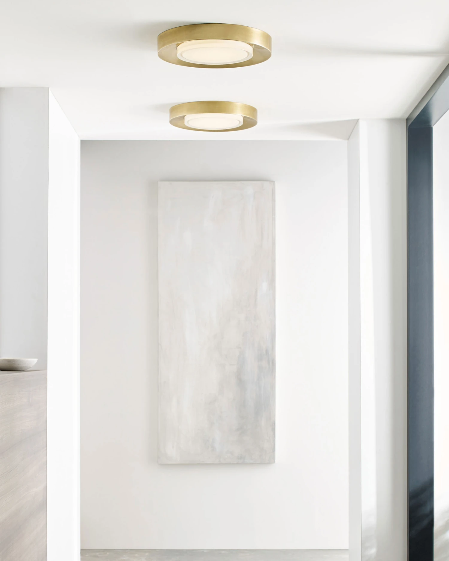 The Hilo Flush Mount features a metal round body with a glass shade. Can be ceiling or wall mounted.