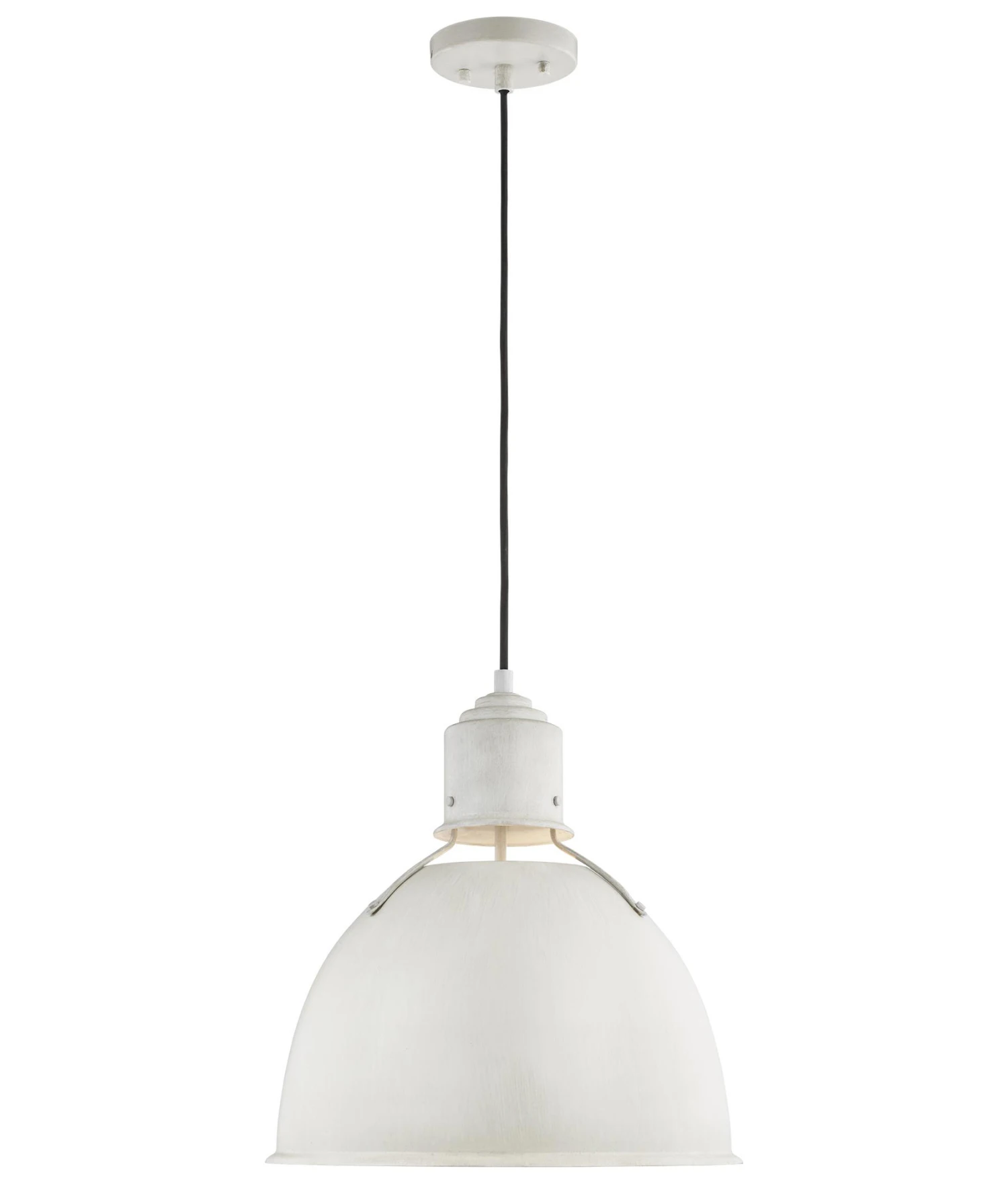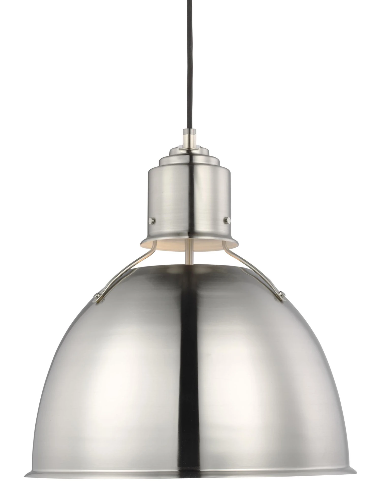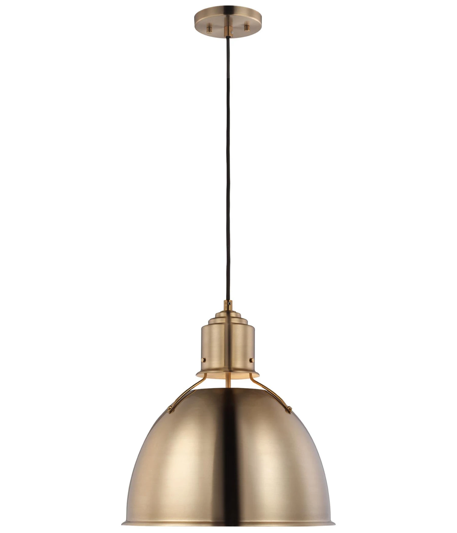 The Huey Pendant brings a clean industrial vibe to your interior space. The dome shaped shade opened at the top and seems to be held by a claw, allowing light from both directions. Available in Brushed Nickel, Satin Brass, Midnight Black, and Antique White finishes. Sloped ceiling mounting hardware included. Canopy: 4.875 inch diameter. Damp location rated. ETL listed
