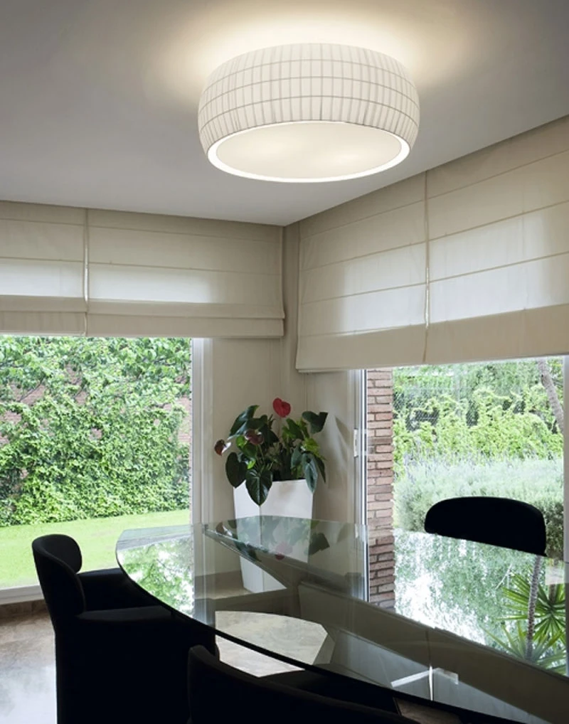 Isamu Ceiling Light features a bookbinding tape fabric shade with a polycarbonate diffuser.