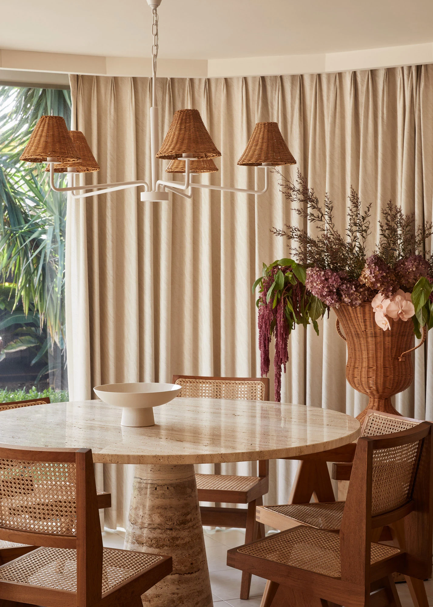 The Issa Chandelier has a natural style that’s ahead of the curve, with slender, hooked arms that hold a woven rattan shade that lets a soft light filter through. The aged brass or textured white finish is the perfect complement to the natural shade and adds to the fixture’s overall earthy feel.