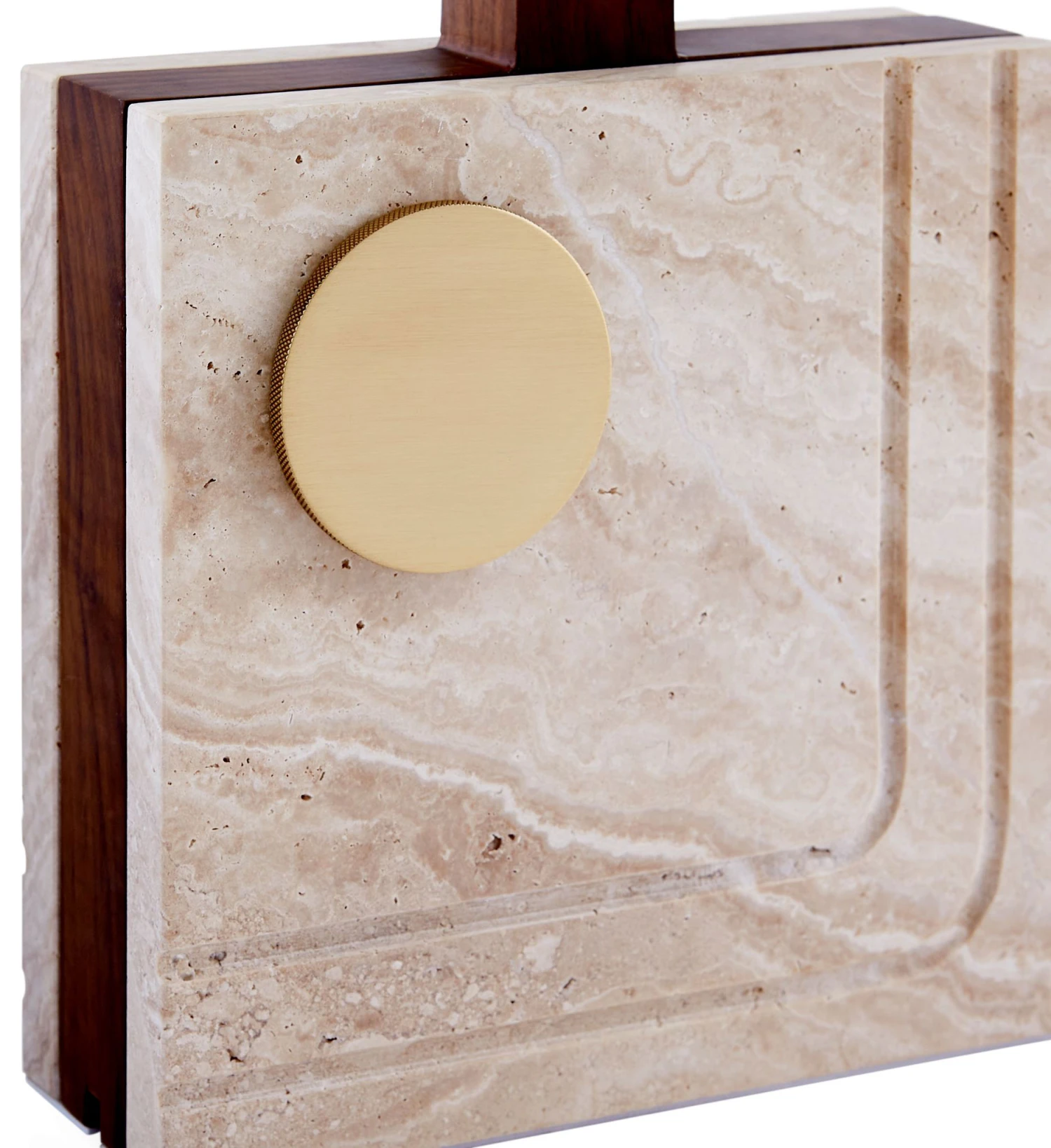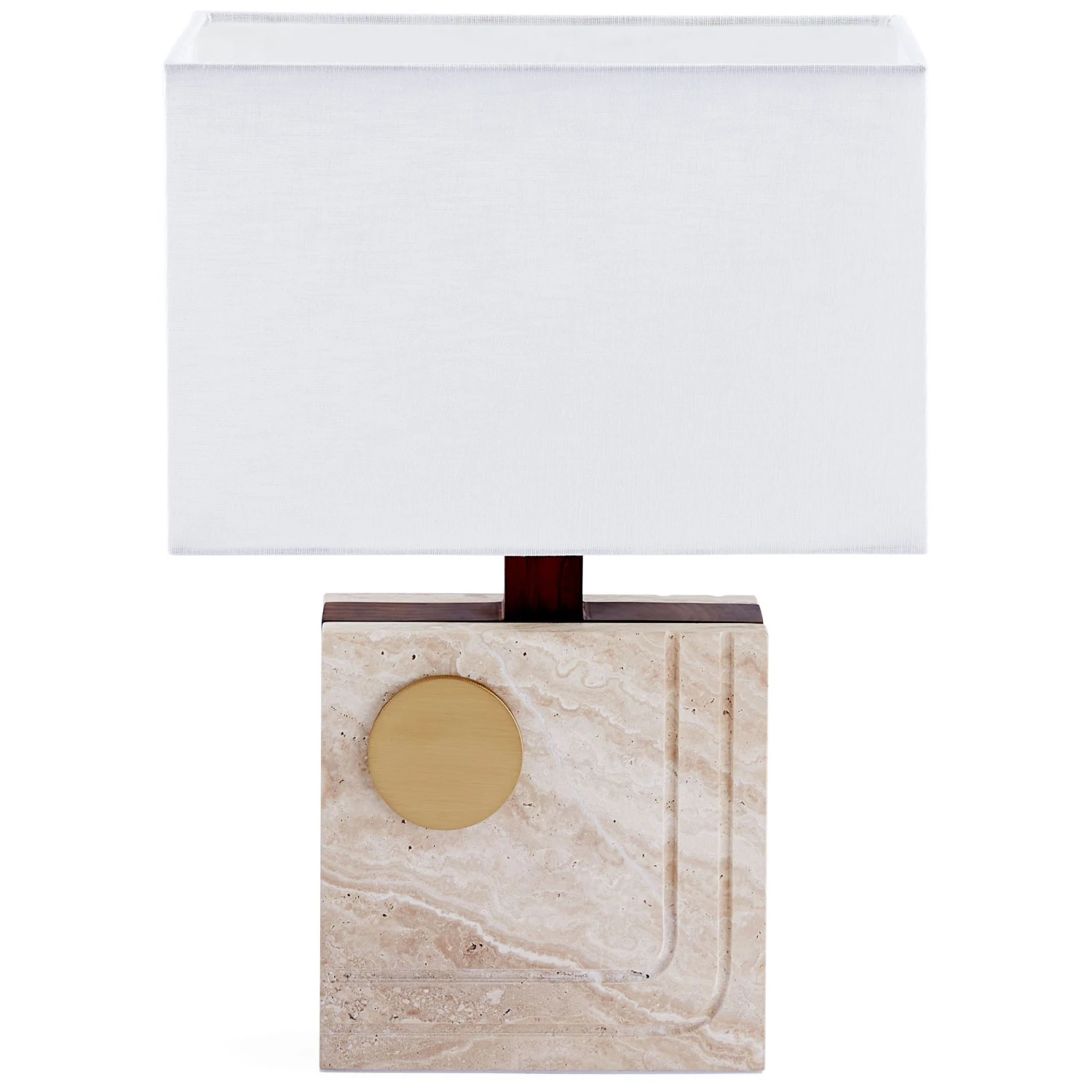 The Topanga Square Table Lamp merges modern shapes with rich materials to create a striking, mid-century inspired piece. The travertine stone and walnut base features natural variations that contrast with the clean geometric lines of the linen shade and circular brass accent. The warm materials make Topanga a natural fit on any surface. Includes full range dimmer switch.