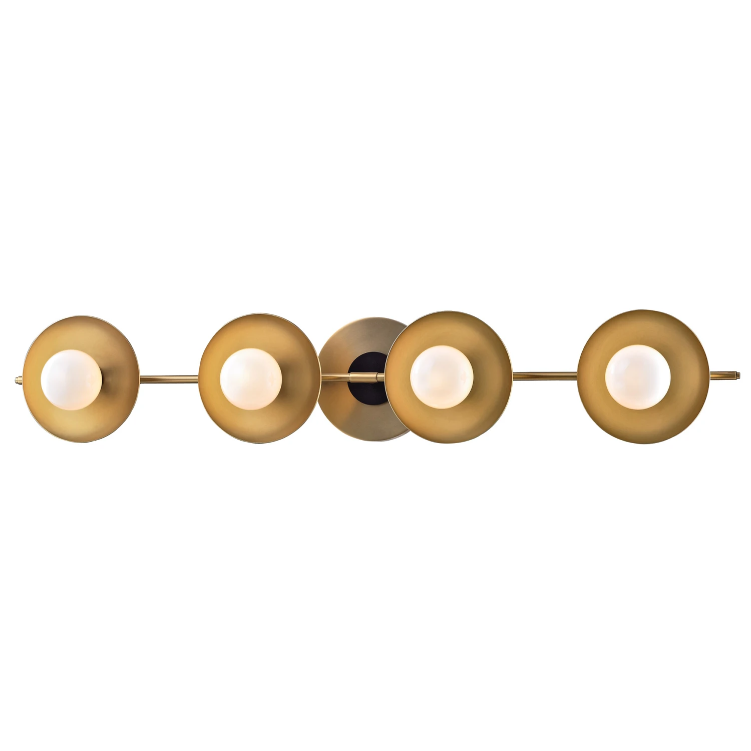 The futuristic yet mid-century Julien Bathroom Vanity Light features a Polished Nickel or Aged Brass finish with Opal glass shades. Available with two, three, or four lights. Installs vertically or horizontally.