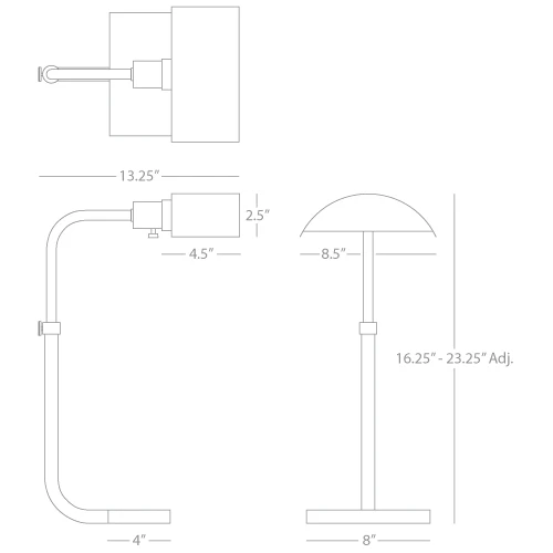 Koleman Adjustable Task Table Lamp features a Deep Patina Bronze, Aged Brass, or Polished Nickel finish. Height is adjustable for virtually any task. One 60 watt, 120 volt B10 candelabra base bulb is required, but not included. Switch is located on the socket. Comes with an 8 foot cord. UL listed. 8.5 inch width x 16.25 – 23.25 inch height x 13.25 inch depth.
