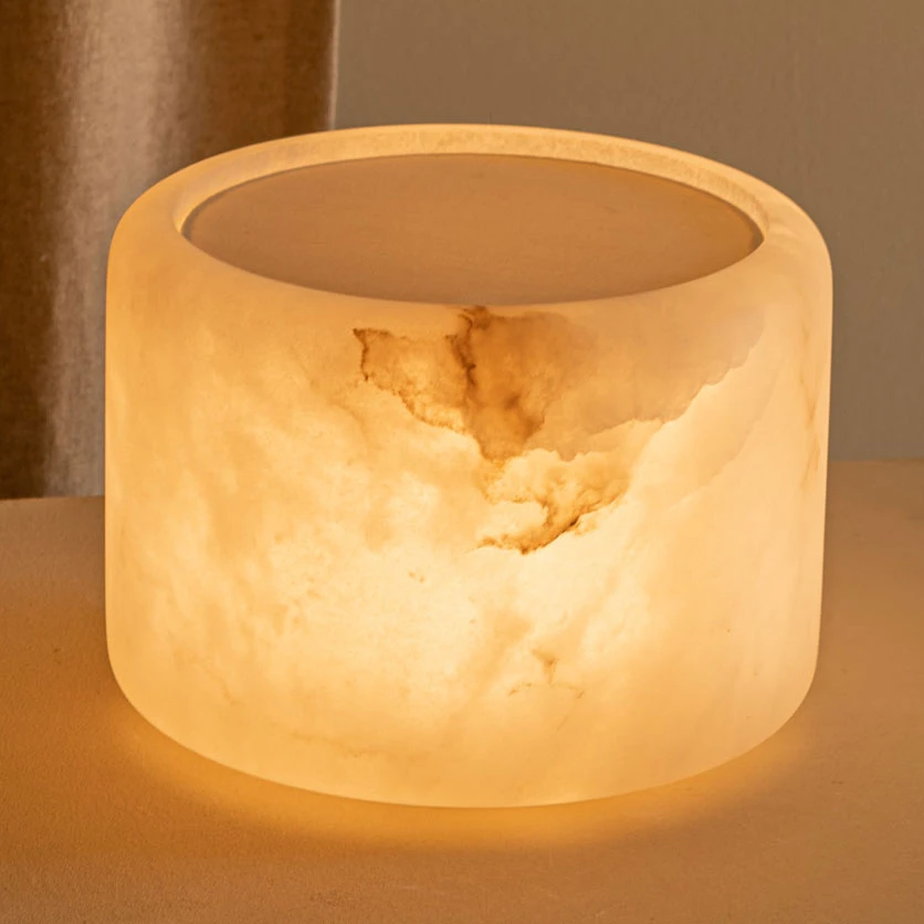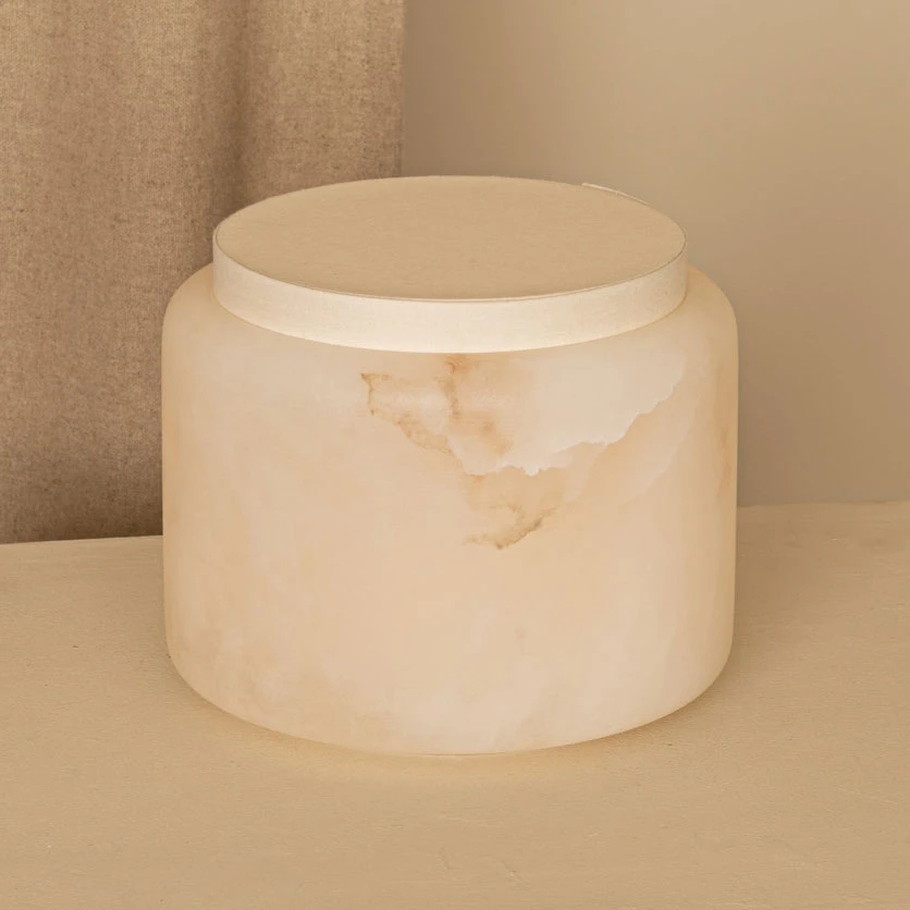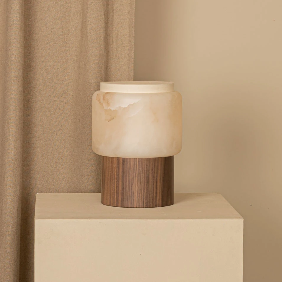 The Lanterno Portable Table Lamp is a modern reimagining of traditional Asian lanterns with a rechargeable battery and integrated LED light source. The light source shines through the white alabaster and cotton shade to produce a warm, diffused glow. A removeable wooden base provides additional height when needed and enhances the design with a rich natural texture.