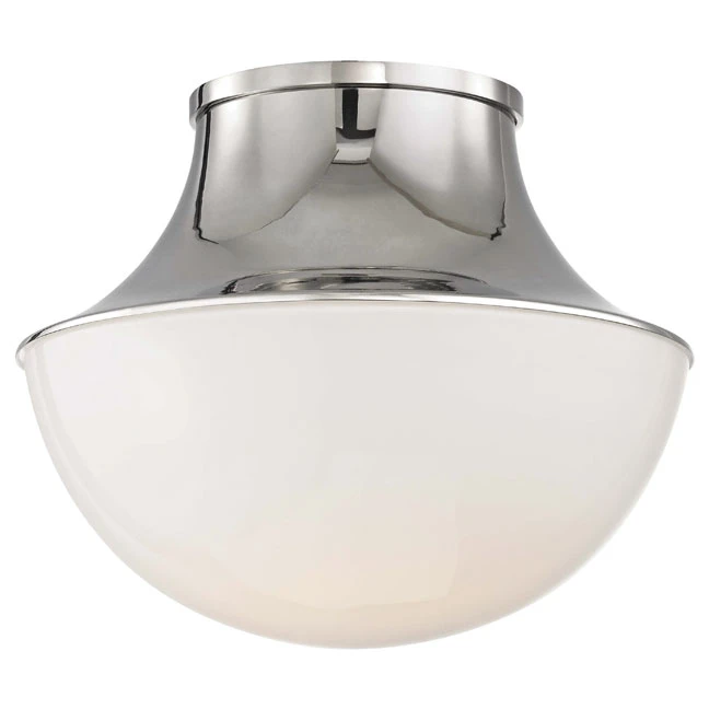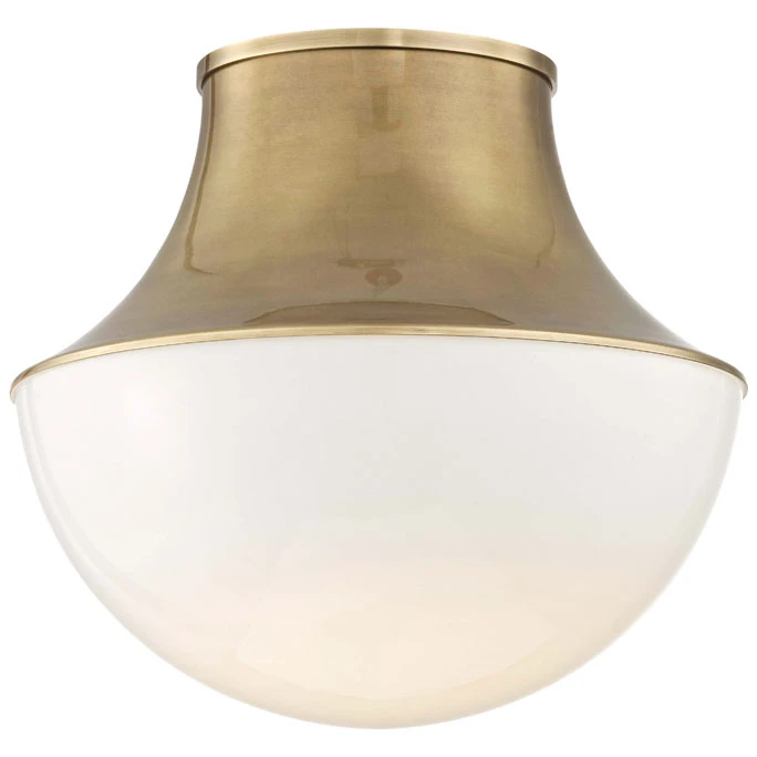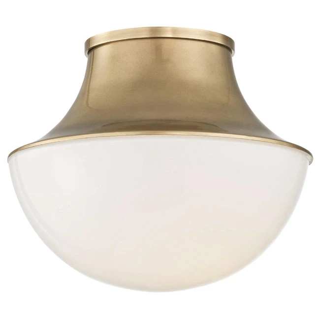 The Lettie Ceiling Flush Mount features an Opal glass demi-globe diffuser with an Old Bronze, Aged Brass, or Polished Nickel finish and is available in two sizes.