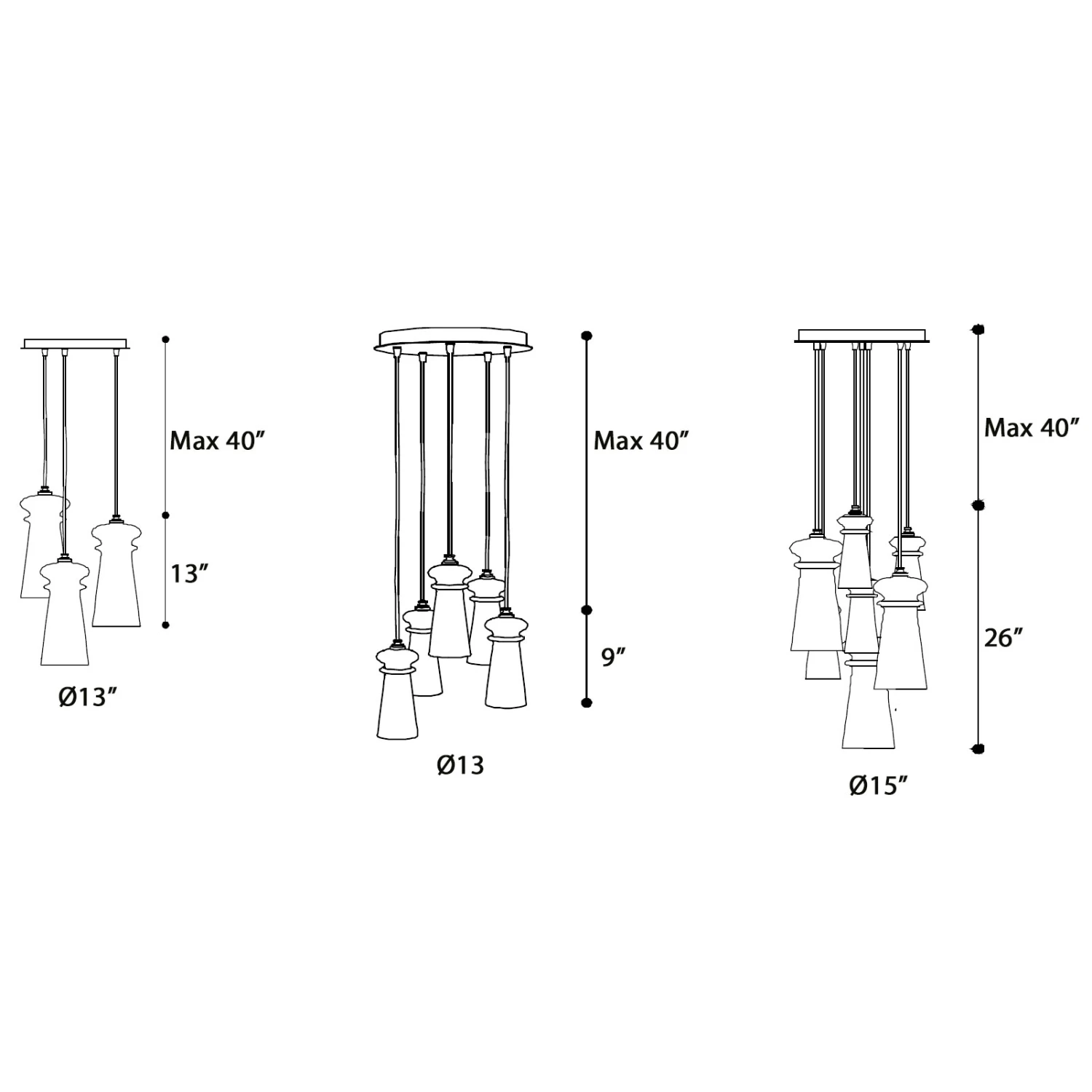 The Licio Multi Light Pendant offers a sleek, versatile design that will tie into a number of interiors seamlessly, featuring an array of conical Clear glass shades paired with inverted candlesticks within, finished in Brushed Copper, Light Gold, or Shiny Nickel. Available with 3, 5, or 7 lights. CE and cUL listed.
