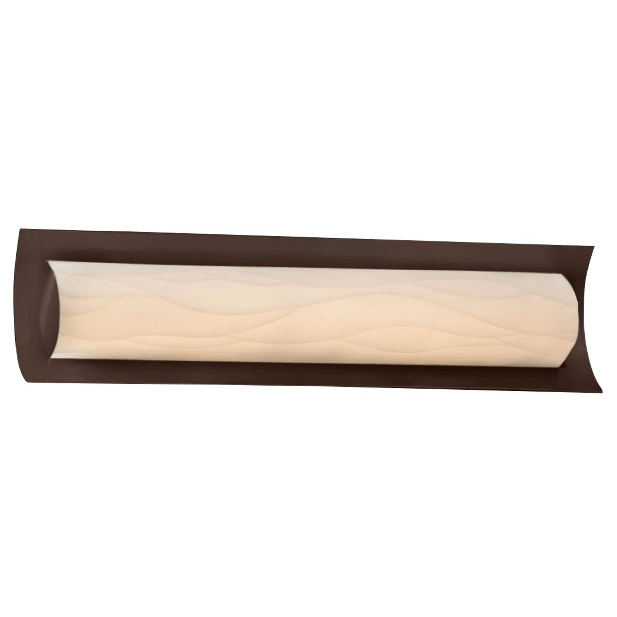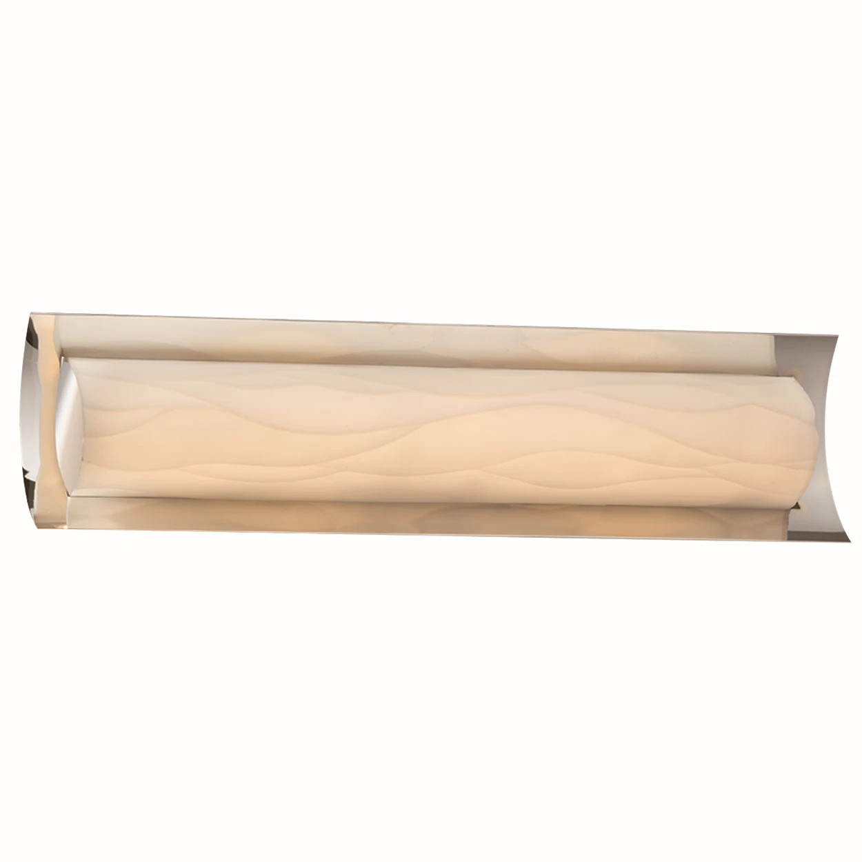 Lineate 22 inch Bathroom Vanity Light features an etched Waves or Sawtooth porcelain diffuser with a Polished Chrome, Matte Black, Brushed Nickel, or Dark Bronze finish. Integrated 19 watt 120 volt 90CRI, 3000K LED light source. May be installed horizontally or vertically. 21.5 inch width x 5 inch height x 2.5 inch depth. UL listed for damp locations. ADA Compliant.