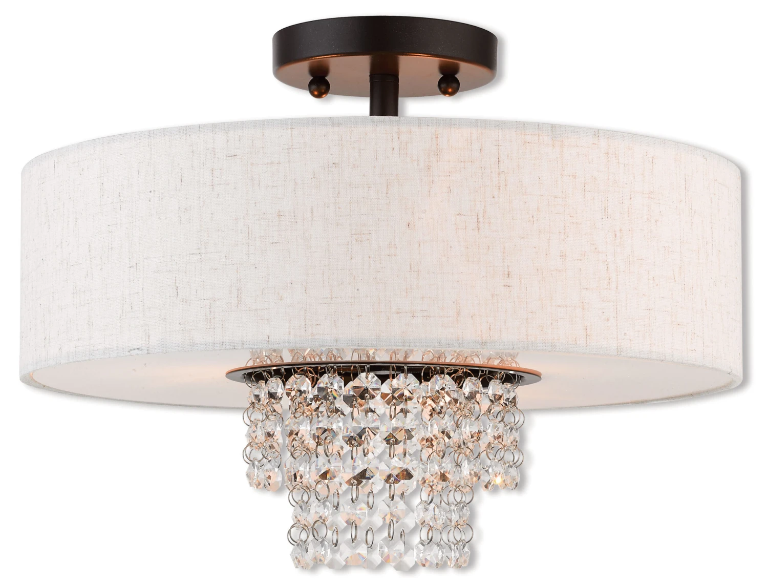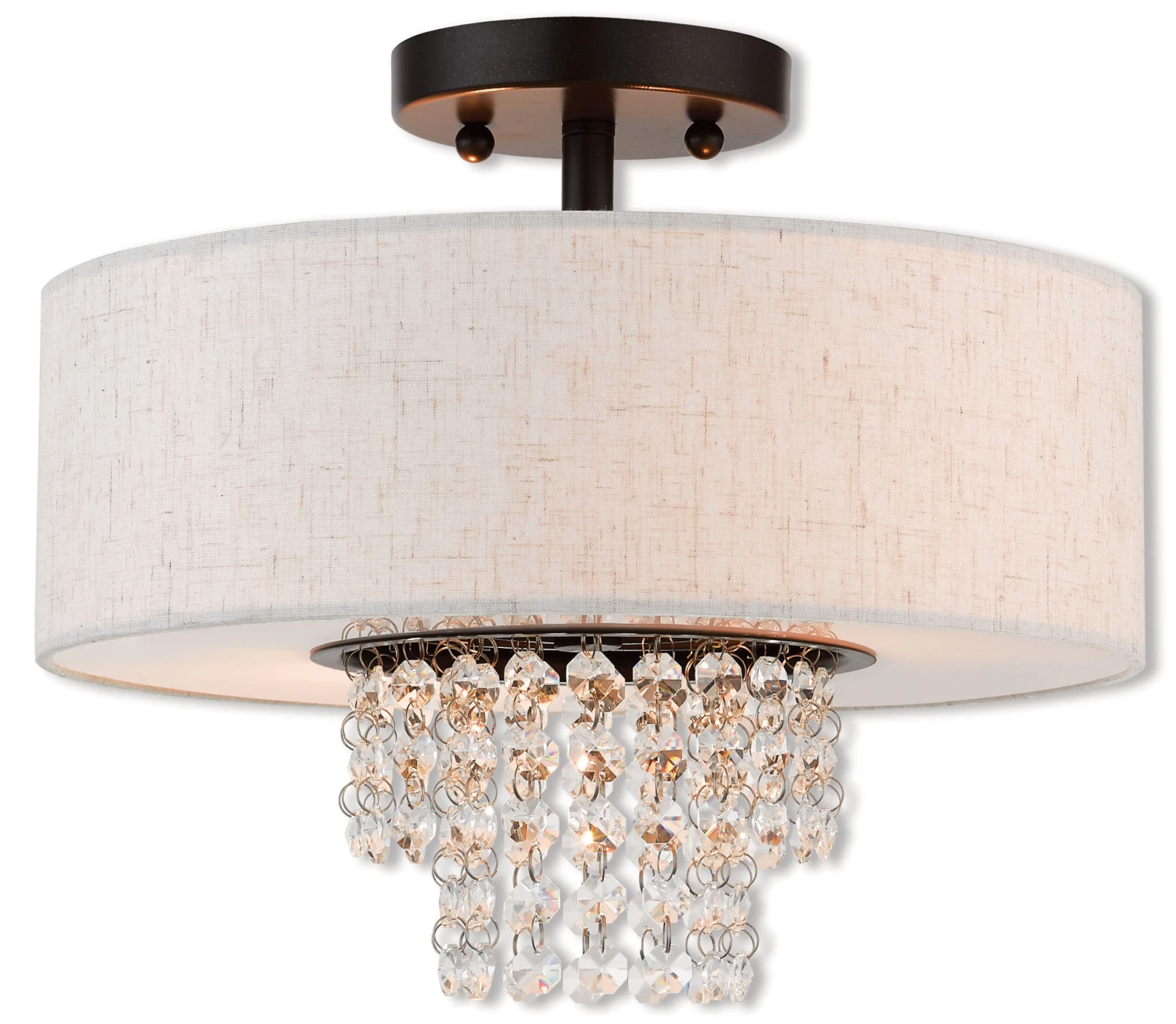 The Carlisle Semi Flush Ceiling Light is a contemporary piece, perfect in any room of your home. Strands of Crystals hang from the inner frame to reflect light. Available with an Oatmeal fabric shade and English Bronze finish. 4.75 inch diameter round canopy. UL listed.
