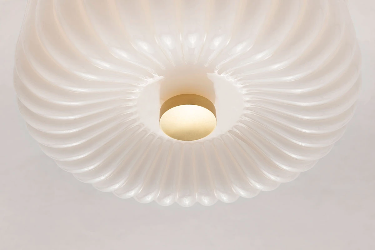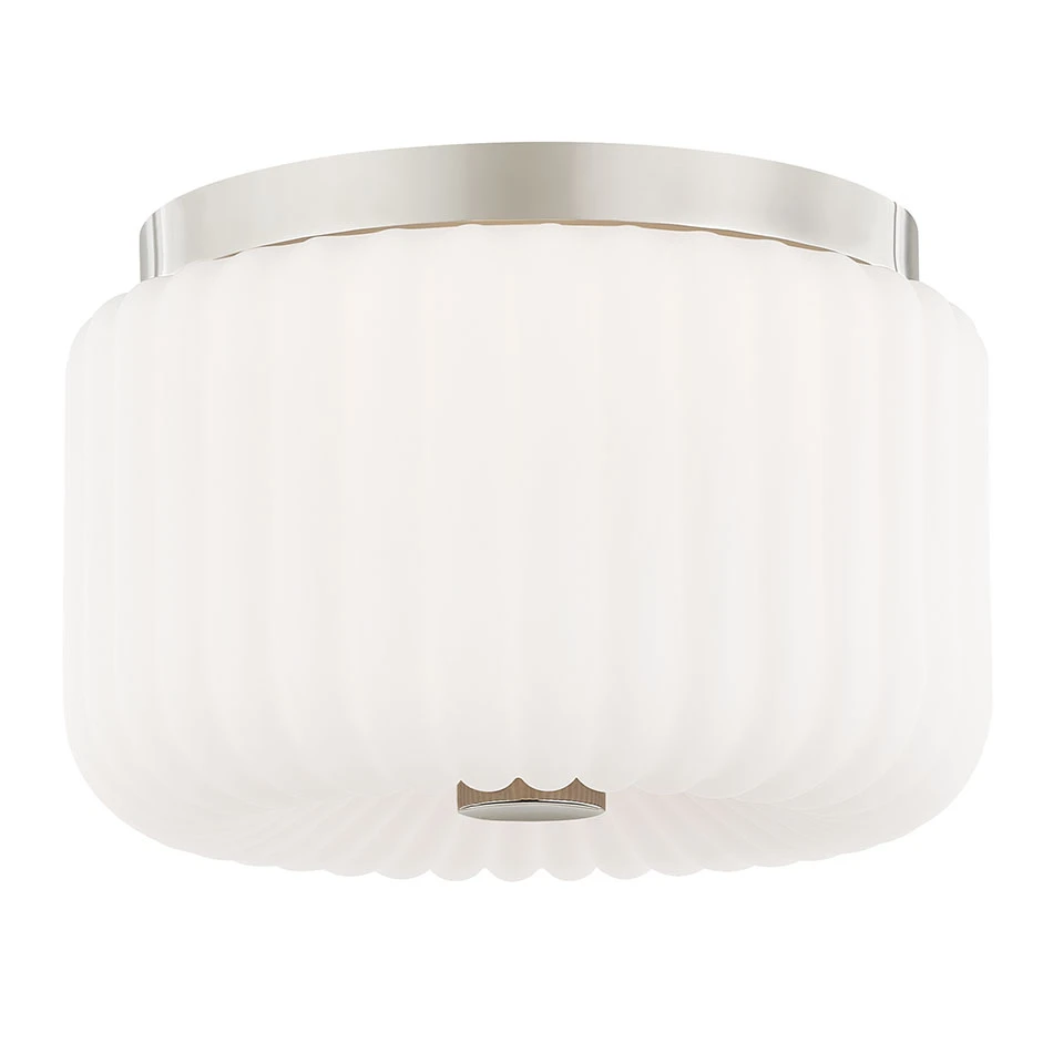 The Lydia Flush Mount offers a chic, vintage inspired look that features a ribbed Opal glossy glass drum shade set into an Aged Brass or Polished Nickel finished frame with matching finial. UL and cUL listed for damp locations.
