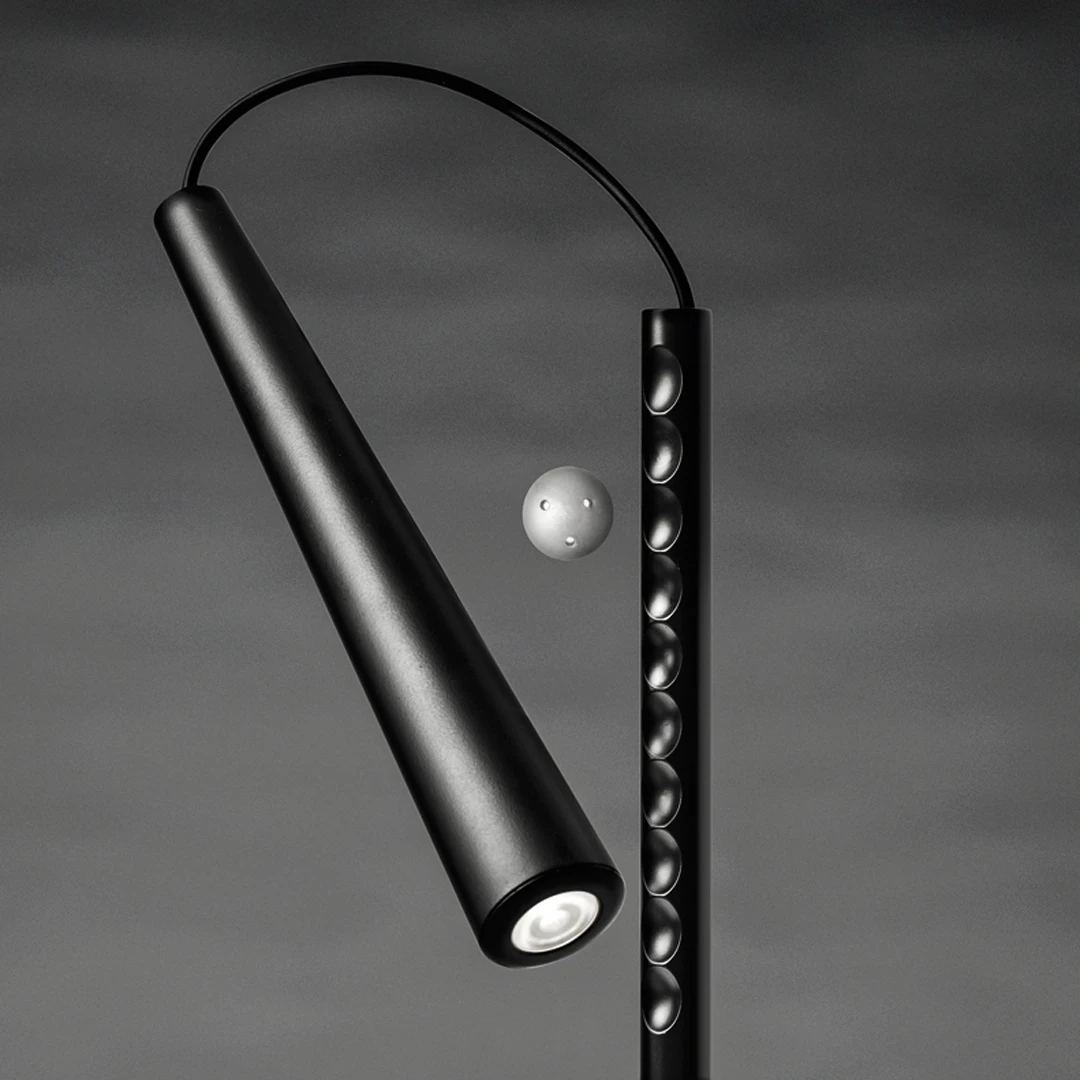 The Magneto Floor Lamp is an essential and functional lamp featuring an invisible power: the magnetic field of a magnet. A spherical magnet combines a support rod with a round base and a compact LED light source affording the utmost versatility of movement along the rod. The intense, concentrated light may be directed downward onto a small area for task lighting or it can be directed upward to create an interesting atmosphere.