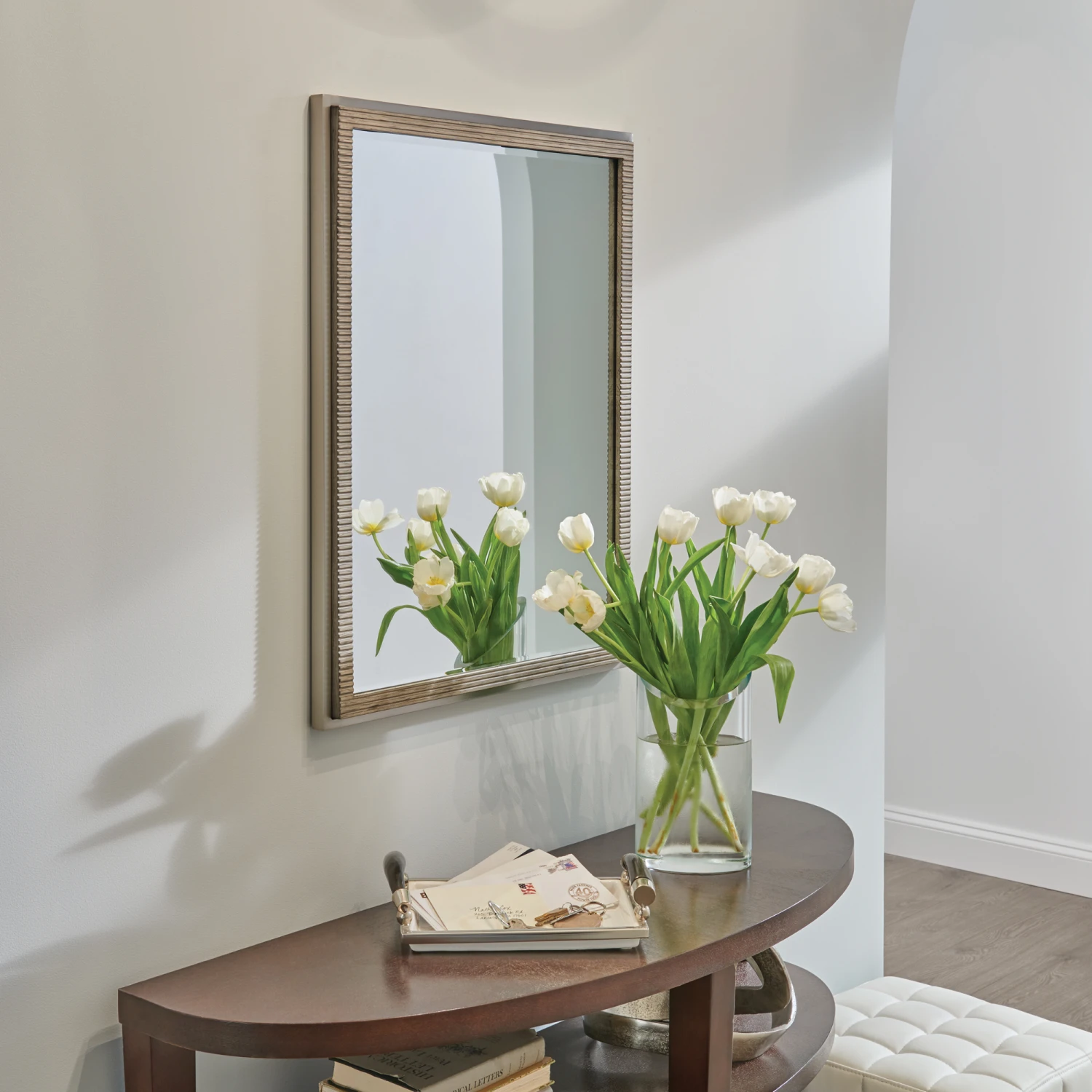 The Millwright Wall Mirror features a Distressed Antique Gray or Rubbed Gray finish.