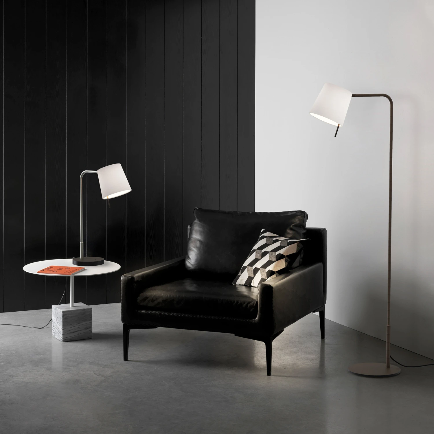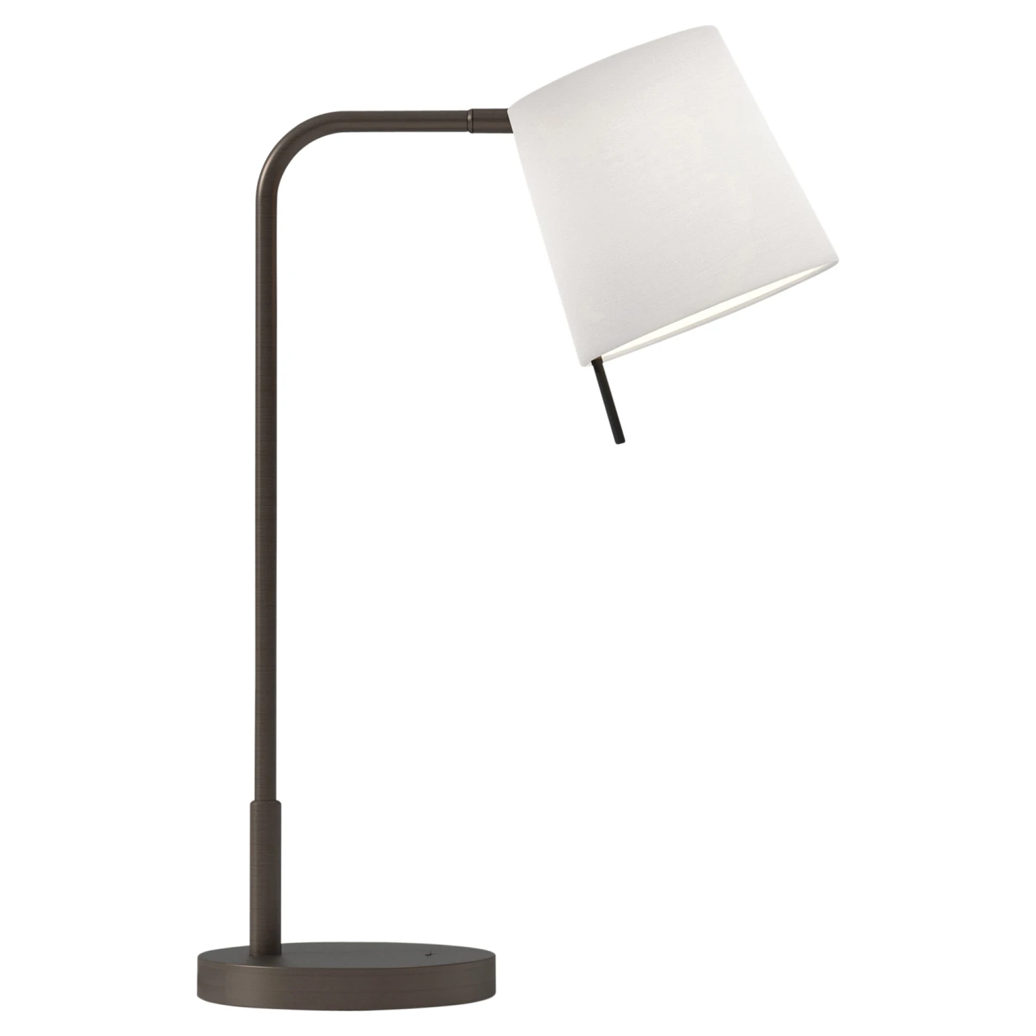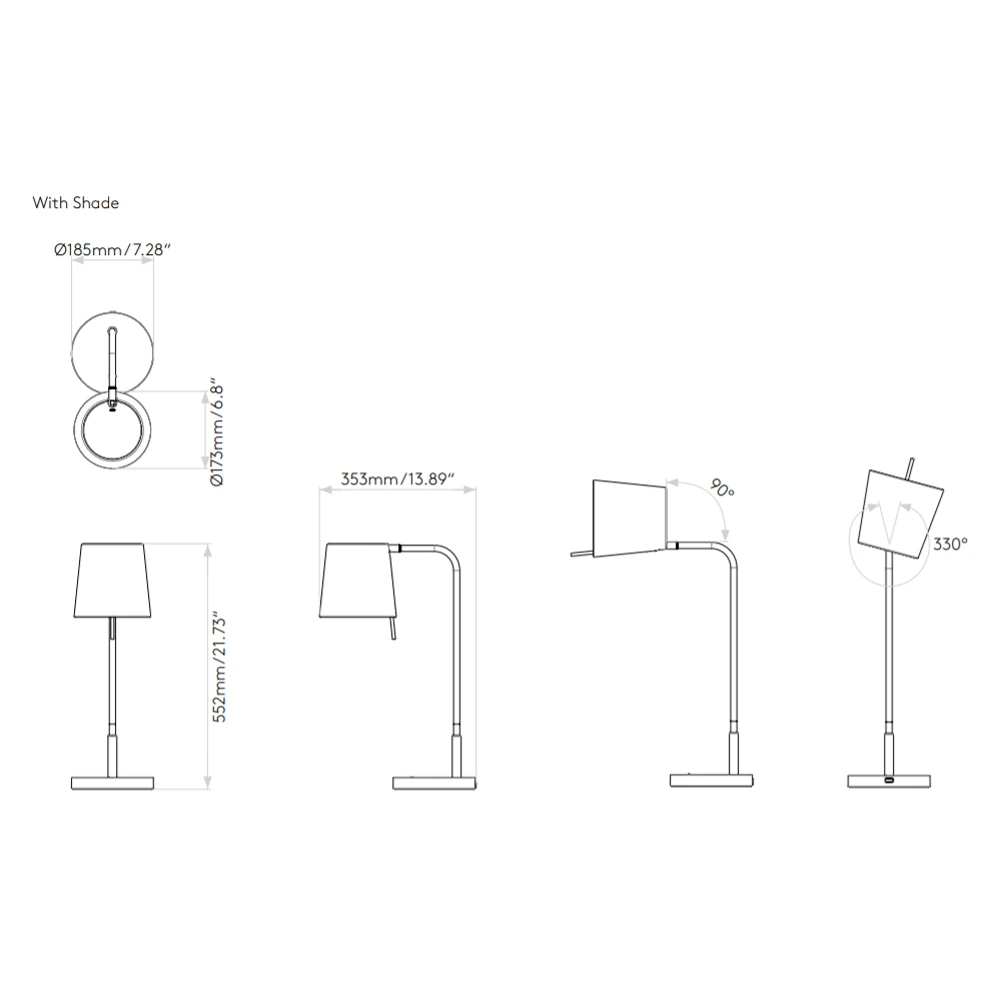 The Mitsu Table Lamp features a clean and simple design with a Matte Nickel or Bronze finish complemented by a small cylinder shaped fabric shade. Tilt adjustable angle 90 degrees. Rotation adjustable angle 330 degrees. On/off switch on cord.