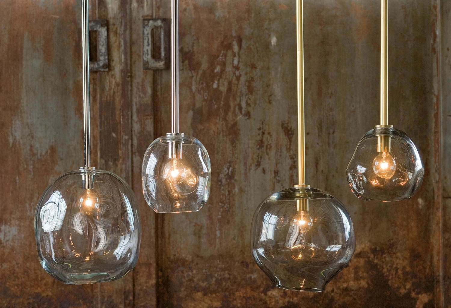 The Molten Pendant is an eye catching organic form that is suspended from a metal rod. The molten glass has an inherent beauty of variation in texture and size in this stunning modern piece. Available with Smoke glass/Natural Brass finish. CSA and UL listed.