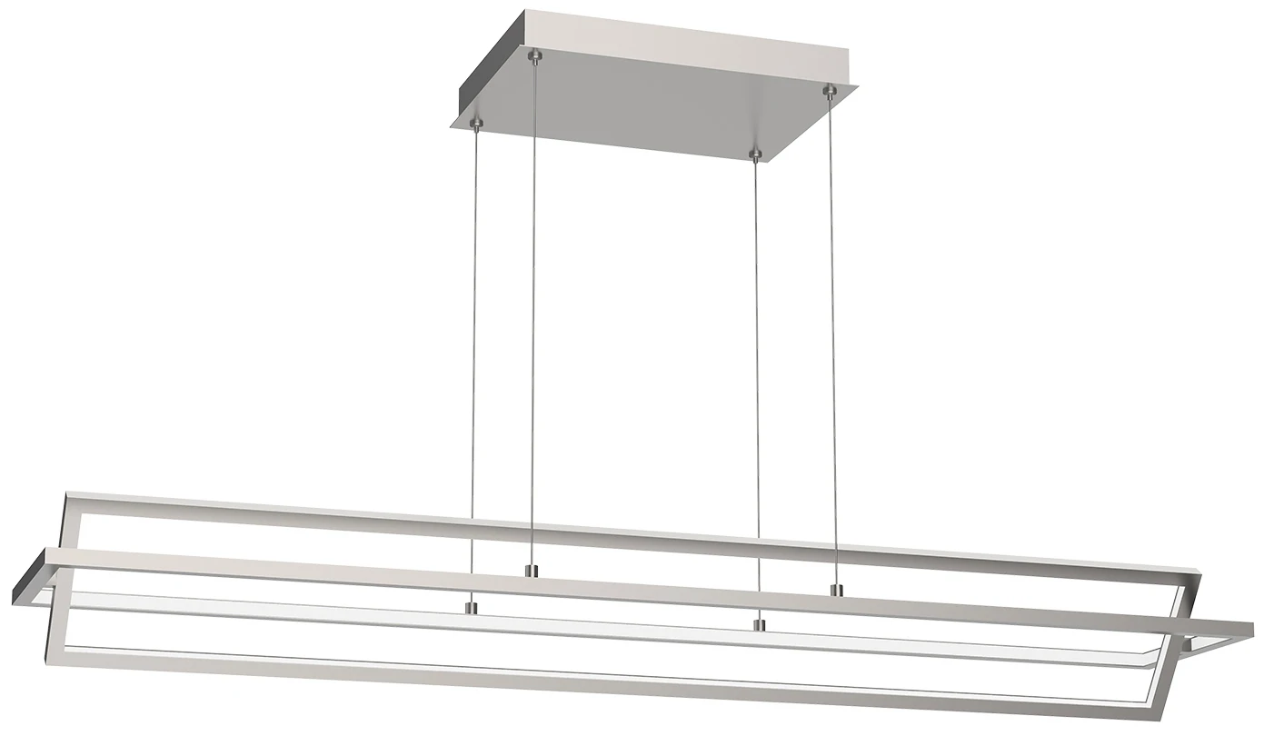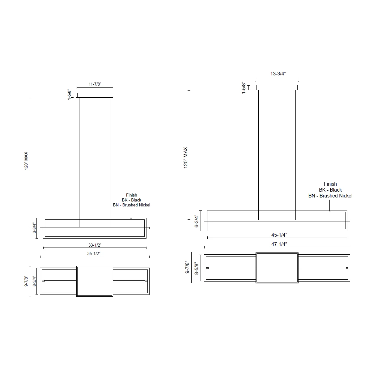 The Mondrian Rectangle Pendant is composed of rectilinear frames of light. The illuminated borders surround an open void, create an illusion of levitation. The airy design and negative space allow the fixture to visually blend into the environment. Finished in Black or Brushed Nickel with Frosted acrylic and available in two sizes. Includes 120 inch adjustable cable. Dimmable with a triac or low voltage electronic dimmer, not included. Canopy sizes shown on the line drawing. ETL listed.