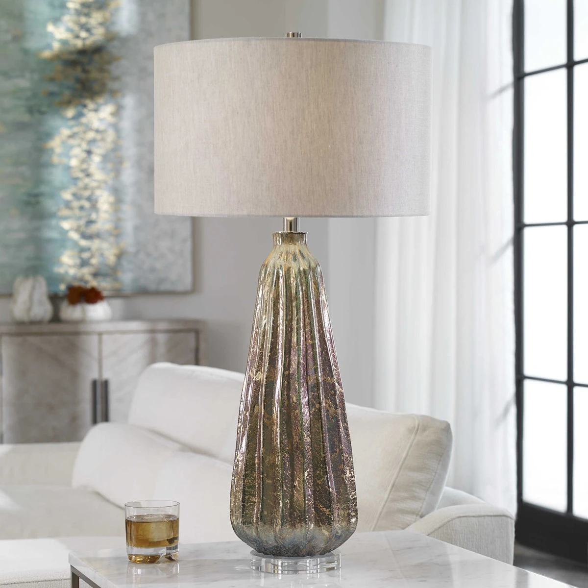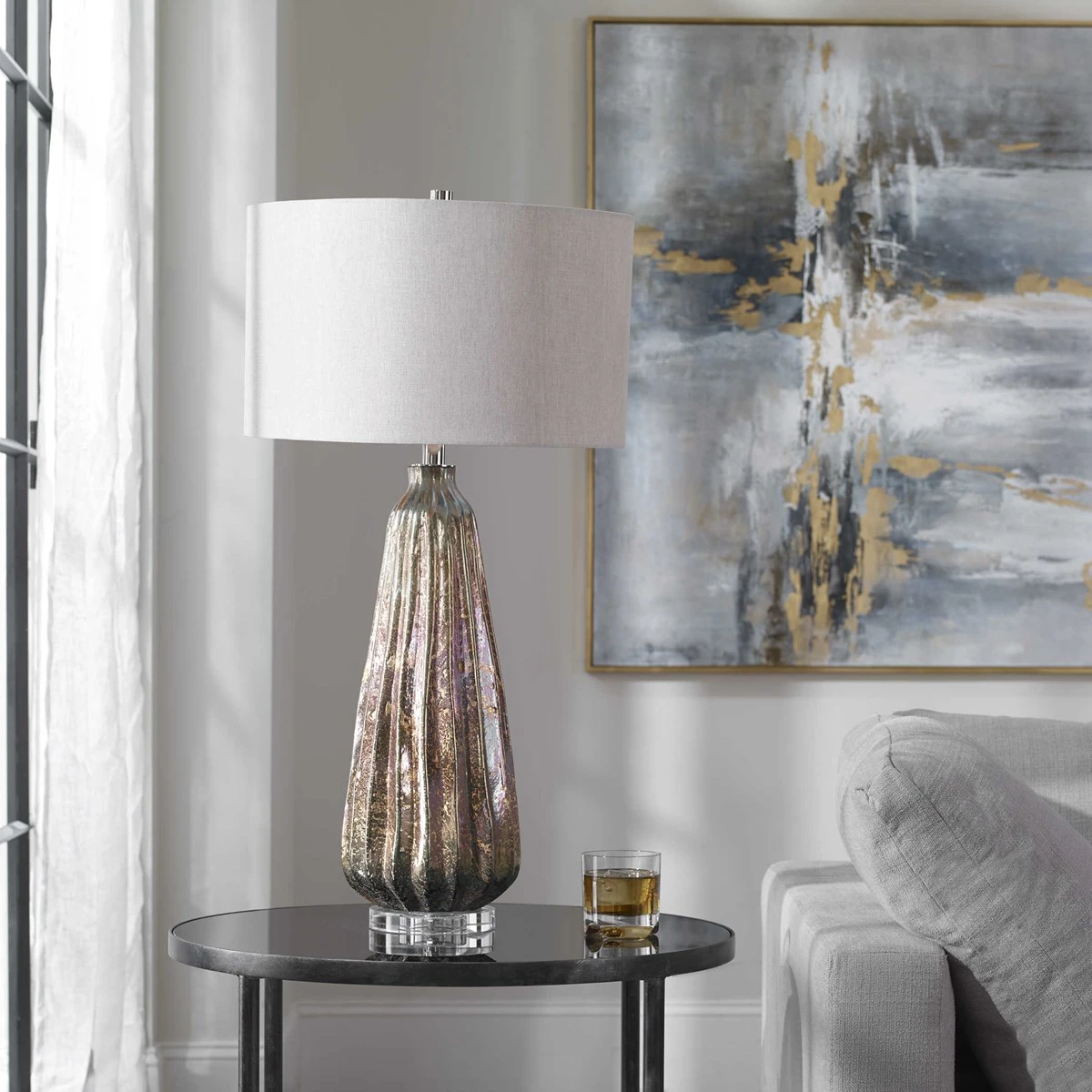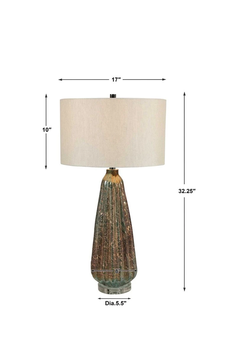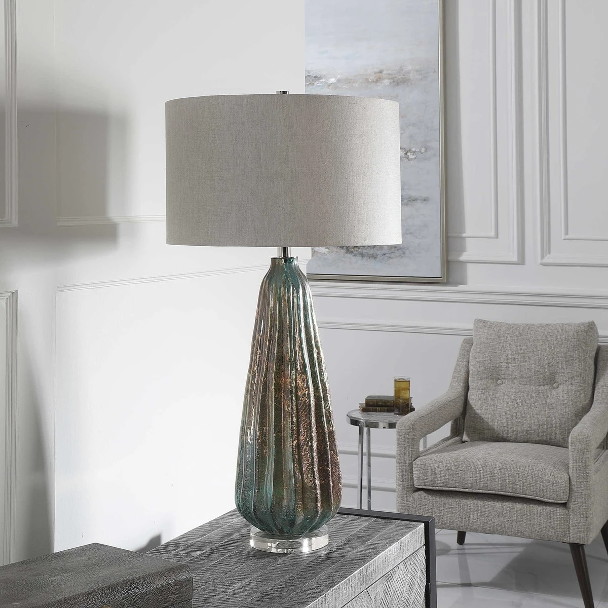 The Mondrian Table Lamp features an elegant and sophisticated style with a thick crystal foot and polished nickel details. Available with a Rust and light blue finish complemented by a Light Gray linen shade. Includes a 3-way socket switch. UL listed.