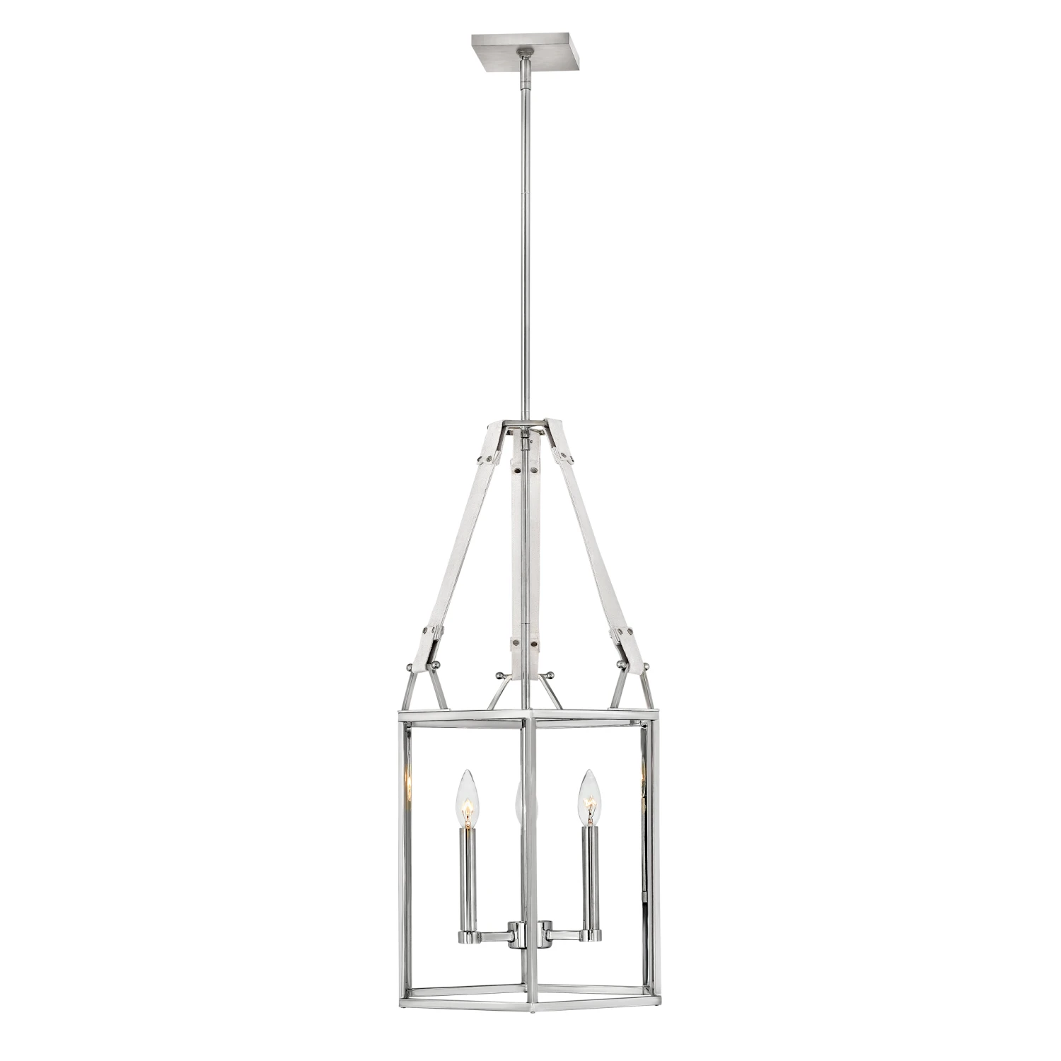 The Monroe Chandelier takes a chic stance on contemporary lighting. A unique hexagonal cage with crisp welded corners is suspended by Suede straps to add a bohemian flare to the mix. Place the Monroe in the living room, dining room, or anyplace where a statement piece is needed. Finished in Heritage Brass or Polished Nickel. Available in 3 or 6 light configurations. Includes one 6 inch stem and two 12 inch stems. UL and CSA listed.