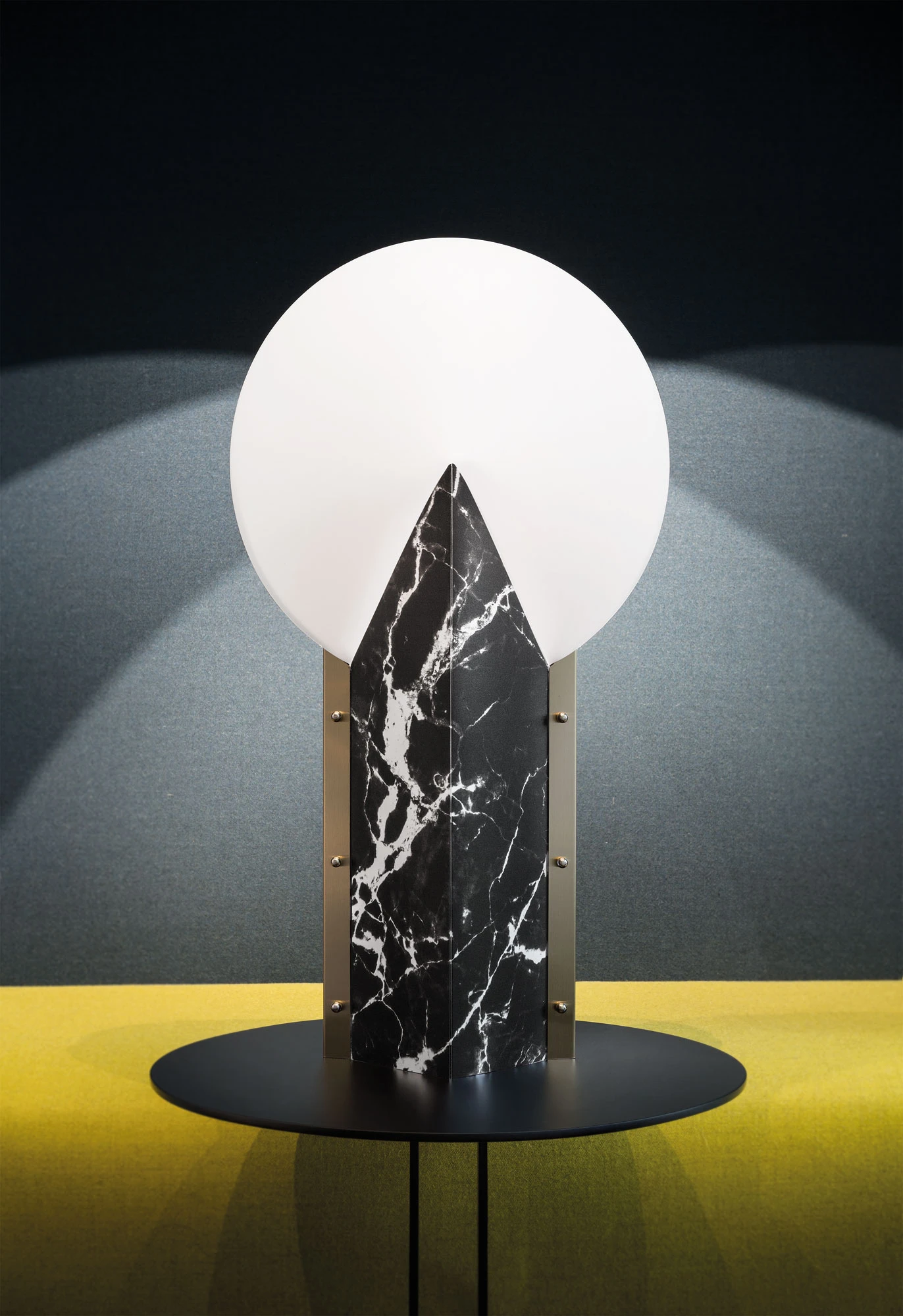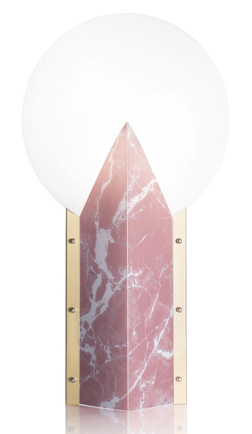 Moon Table Lamp, designed by the Slamp Creative Department, is a fresh original design with an avant-garde, geometric lines. The interesting chromatic blends, make this perfect in any room of your home. Available with a White diffuser and a marbled White, Black, or Pink base trimmed in gold. Comes with an 8 foot cord. ETL listed.