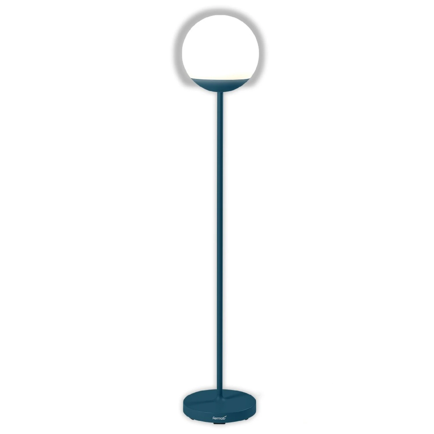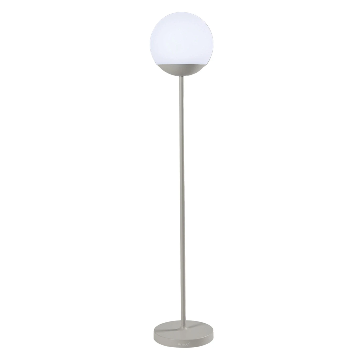 The Mooon! Floor Lamp brings a sleek, minimalist style to light your outdoor space. Standing at 53inch high, this stunning lamp turns on by touch under the sphere and has two light settings, each available in two intensities (warm white 3000K (100% and 50%) and cool white 6000K (100% and 50%)). The rechargeable lamp stand runs 7-13 hours and has a charging base that the lamp sits on. Touch-operated control or remotely using the integrated Bluetooth system compatible with the Fermob Lighting app.