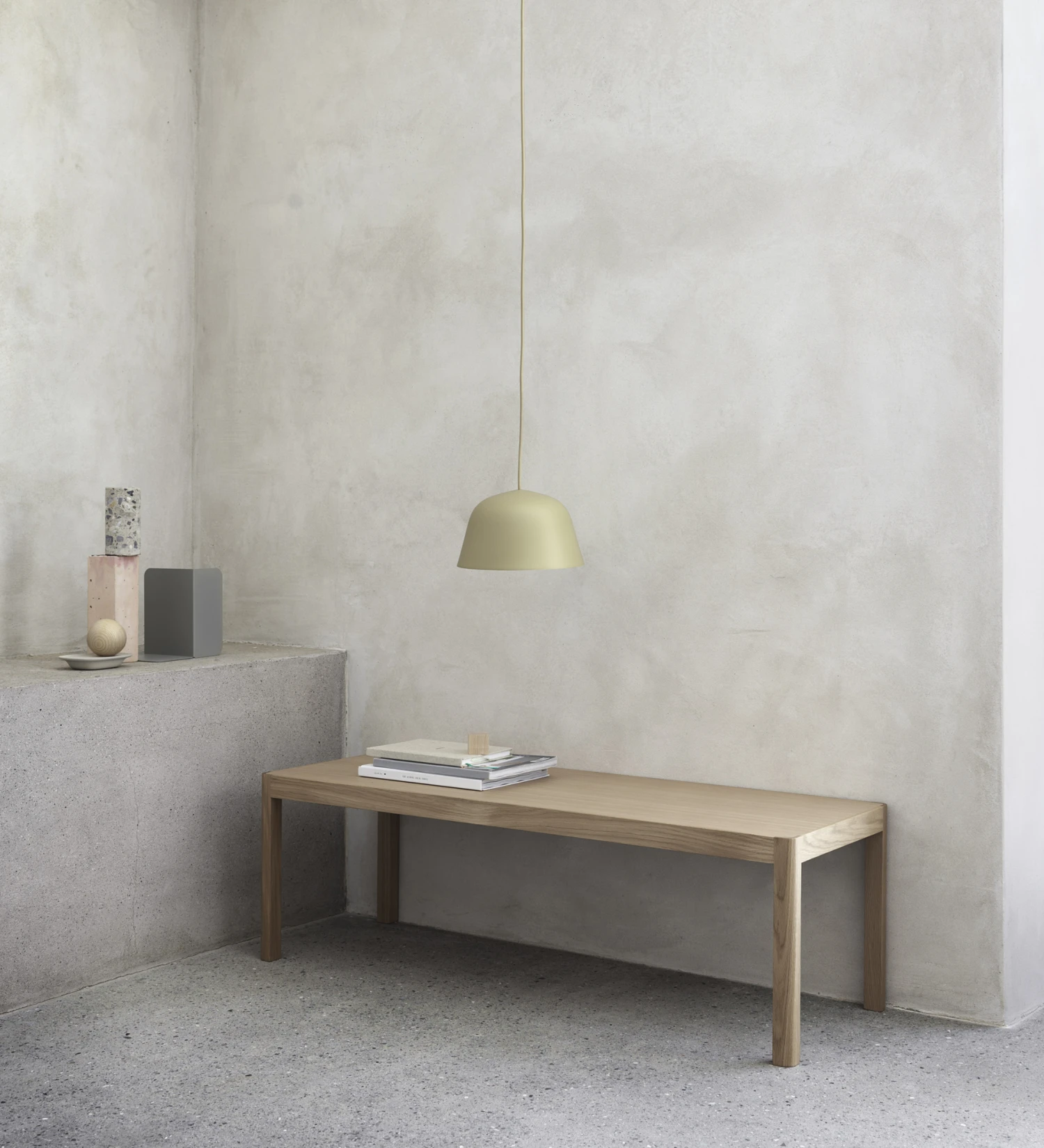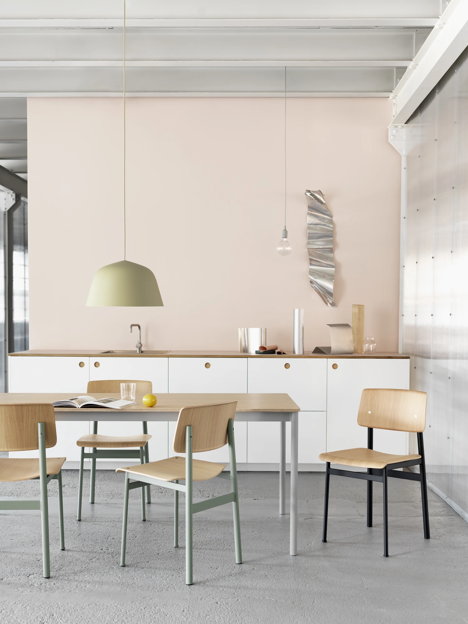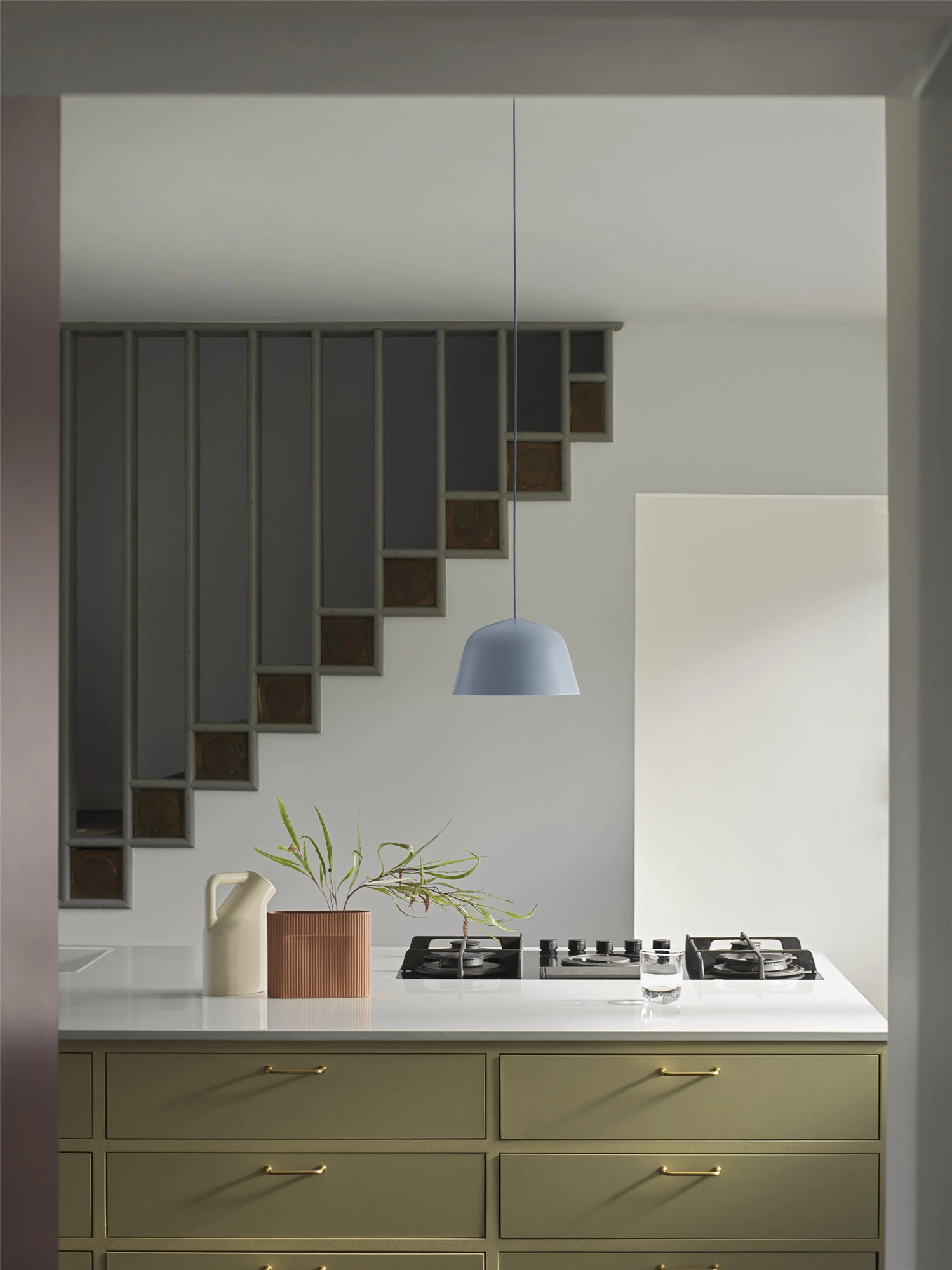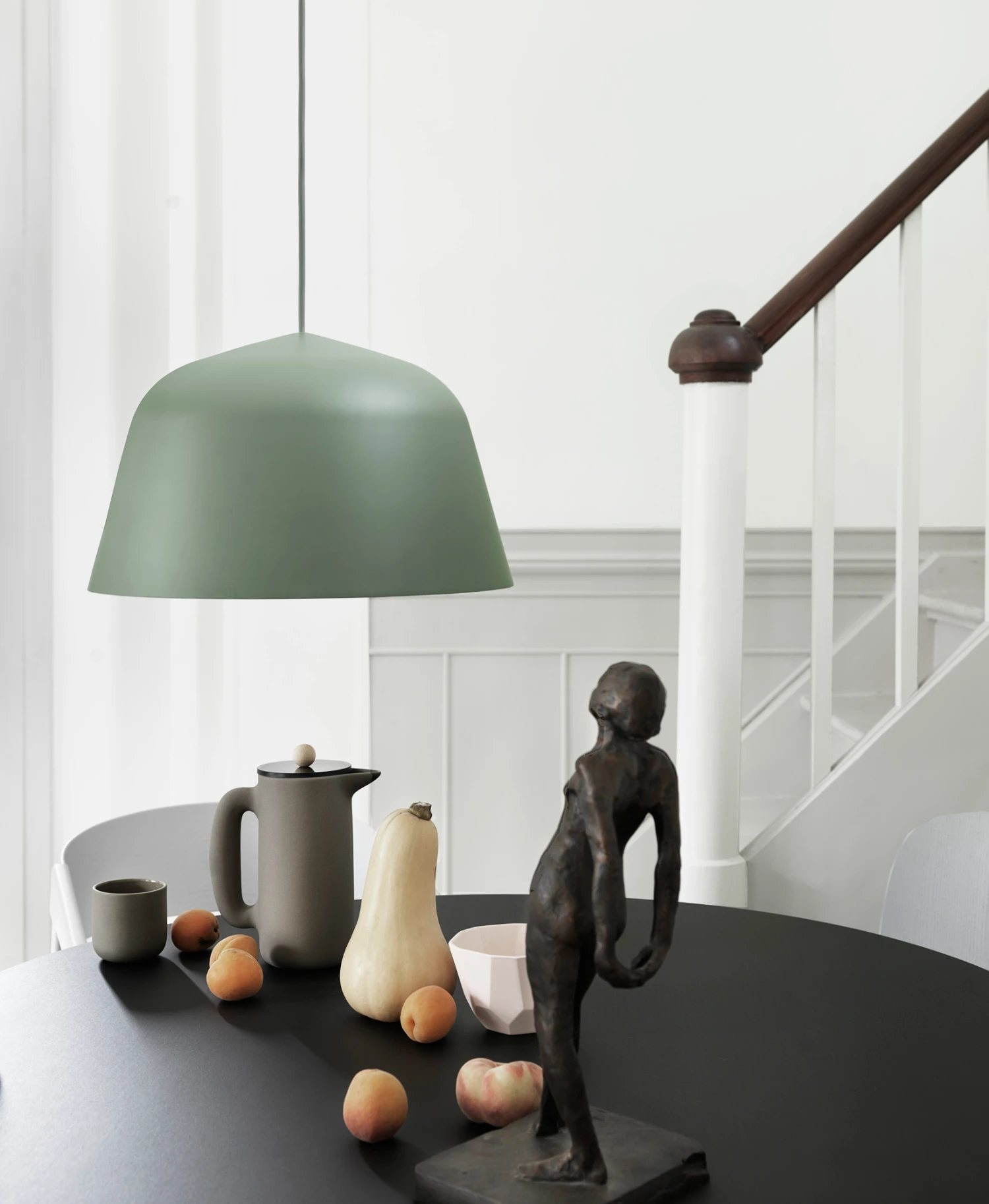 The Ambit Pendant, both timeless and contemporary, features a hand-painted, hand-spun aluminum shade with a white interior to heighten contrasts with the outside of the shade and enhance the light.