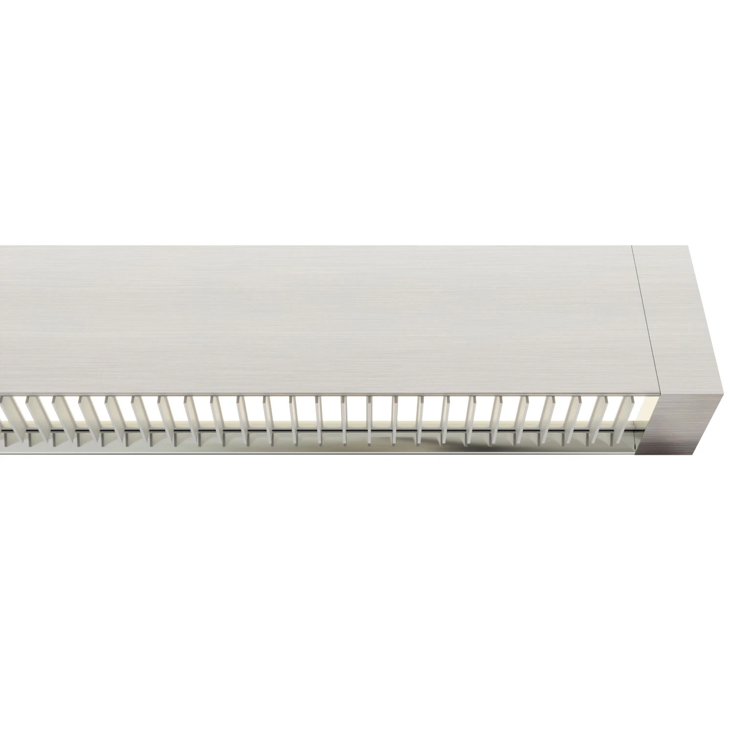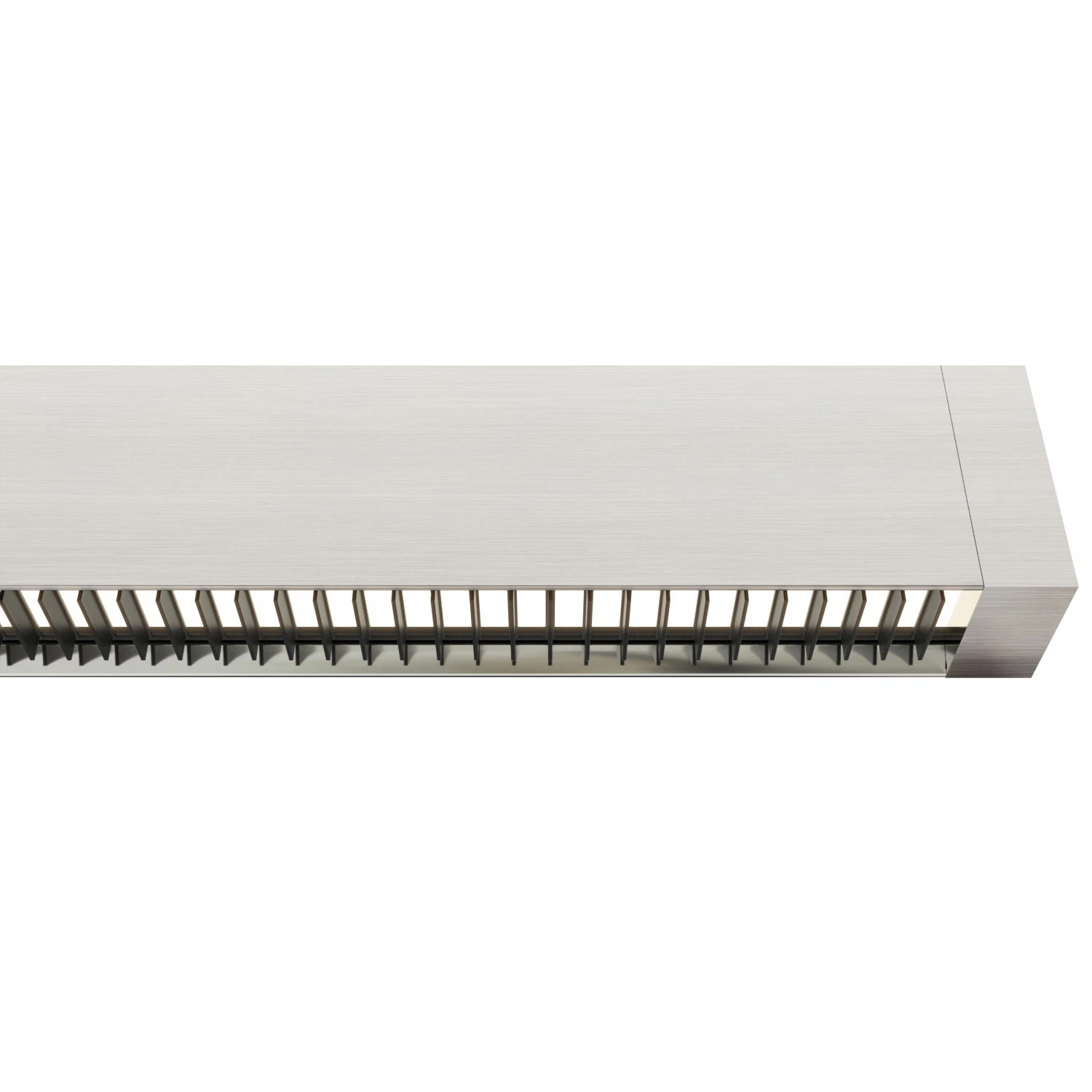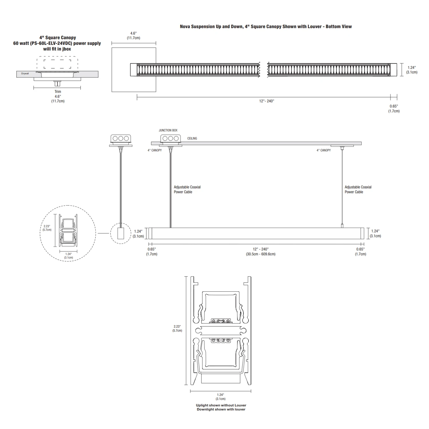 Nova Remote Power Up/Down Suspension with End Feed is a linear LED fixture that offers both direct and indirect light in a clean, LED dot-free smooth line of light in a contemporary style. Nova is available in various increments from 36 to 240 inches and features a diffused white 100 degree lens or clear frosted 60 degree downlight lens, optional black or white louver, 60 degree clear frost uplight lens, multiple finishes, three wattage options, and a spectrum of color temperatures. ETL listed. Title 24 compliant when used with Universal (UNI) power supply. Fixture includes a 5 year warranty.