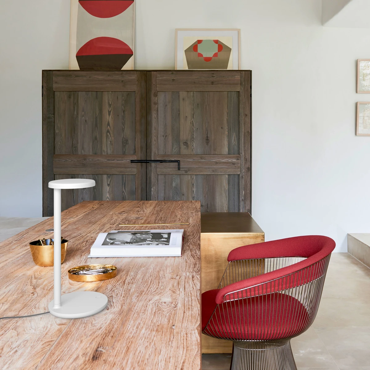 The Oblique Desk Lamp has a robust, compact and minimalist design, yet produces powerful and controlled light making it perfect for workspaces. Includes an integrated USB-C port for charging devices. An optional wireless charging base allows Qi-enabled devices to be charged wirelessly when placed on the base of the lamp. The round flat head can rotate up to 355 degrees. On/off-dimmer switch on the base of the lamp.