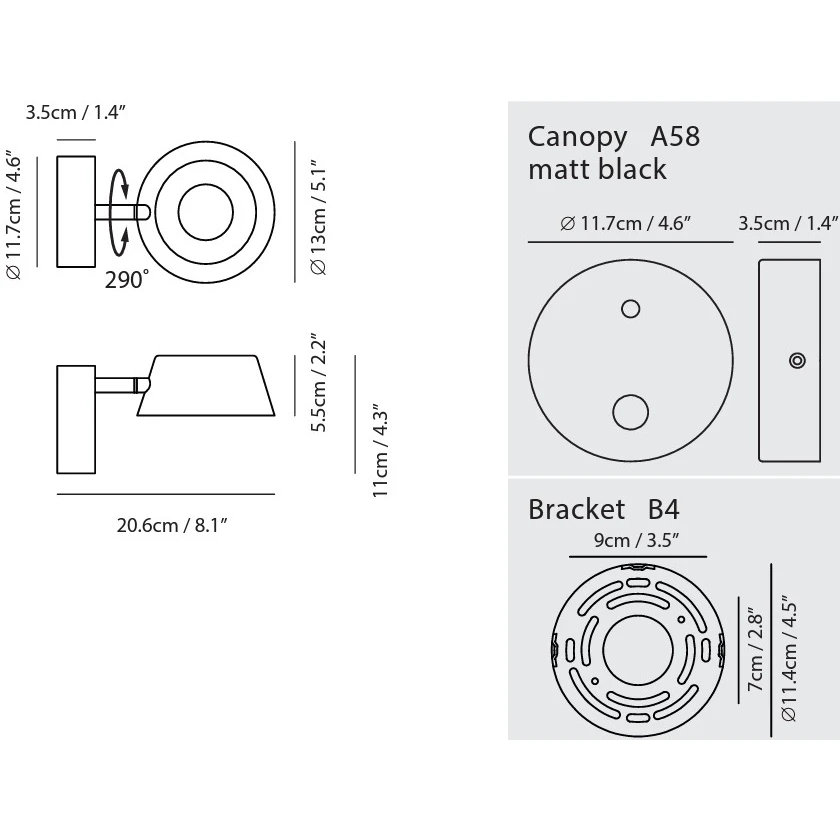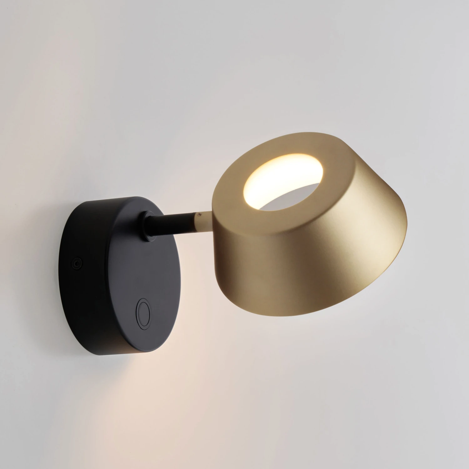 The Olo Wall Sconce uses the basic shapes of circles and lines to create a versatile, modern fixture. The round backplate supports a hollow shade with an integrated glare-free LED. The shade can be rotated 290 degrees, allowing light to be directed where it is needed most. Includes a built in touch dimmer on the backplate.