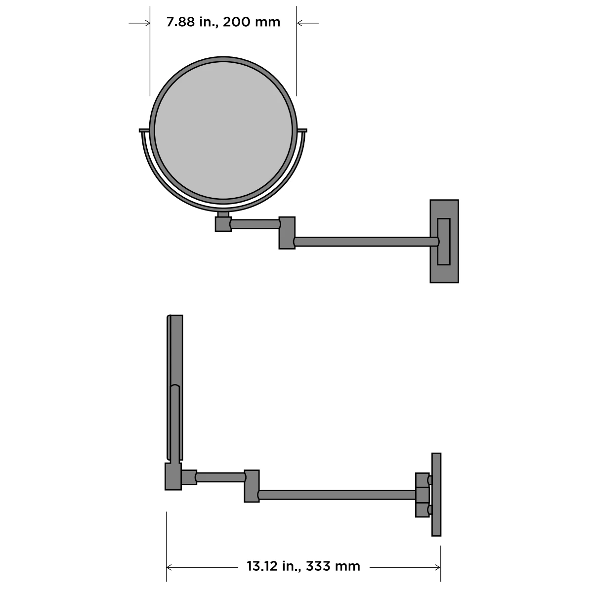 The Palette Wall Mount Makeup Mirror features 5X magnification on one side, and a normal reflection on the other, with an adjustable view angle. Side to side swivel with full pivot, up and down tilt, and double arm to flatten close to the wall.