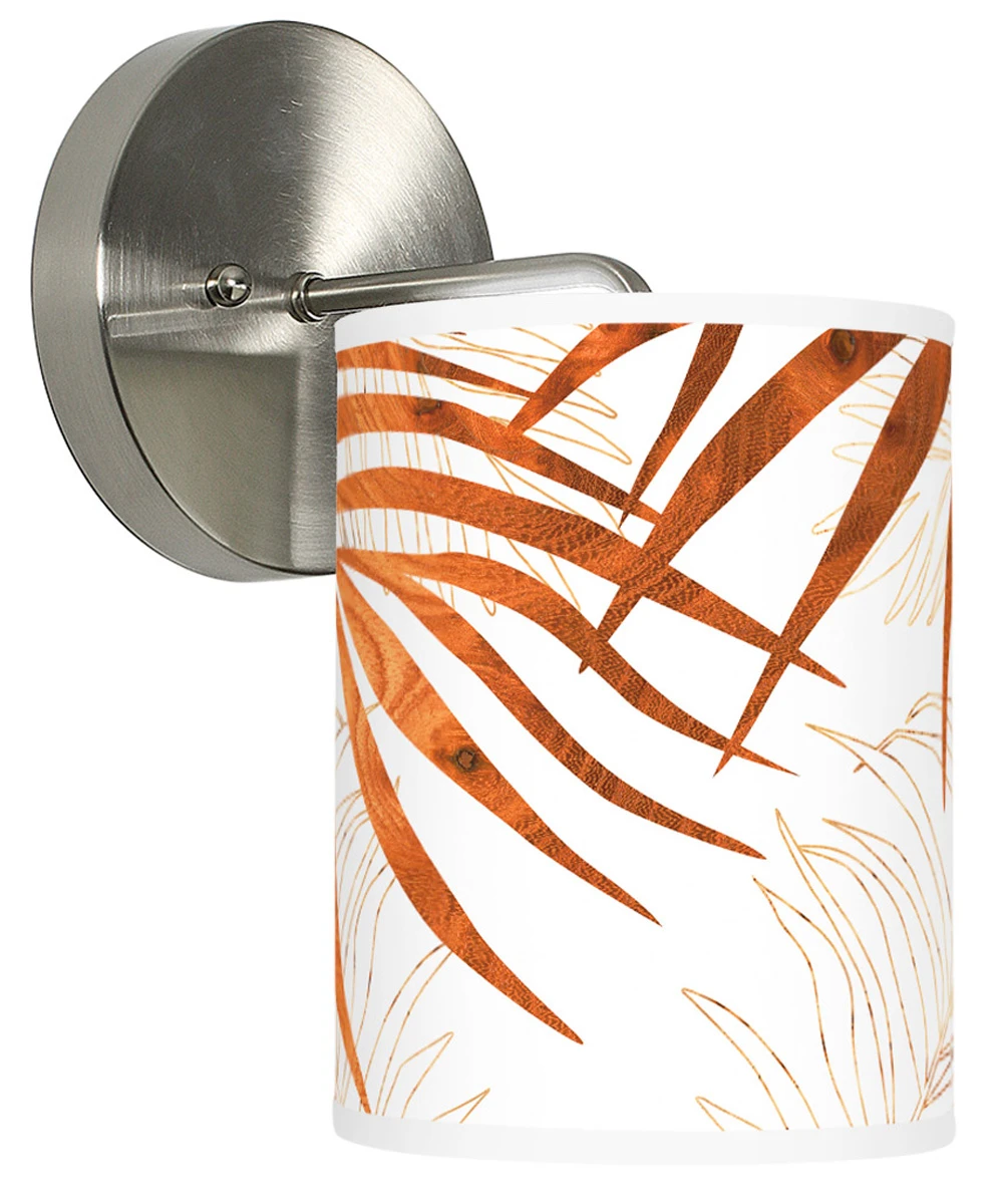 The Palm Hanging Wall Sconce brings a touch of nature into your home. The light filters through the lush palm fronds printed on the cylinder shaped White linen shade, casting warm shadows across your room. Custom made in the USA.