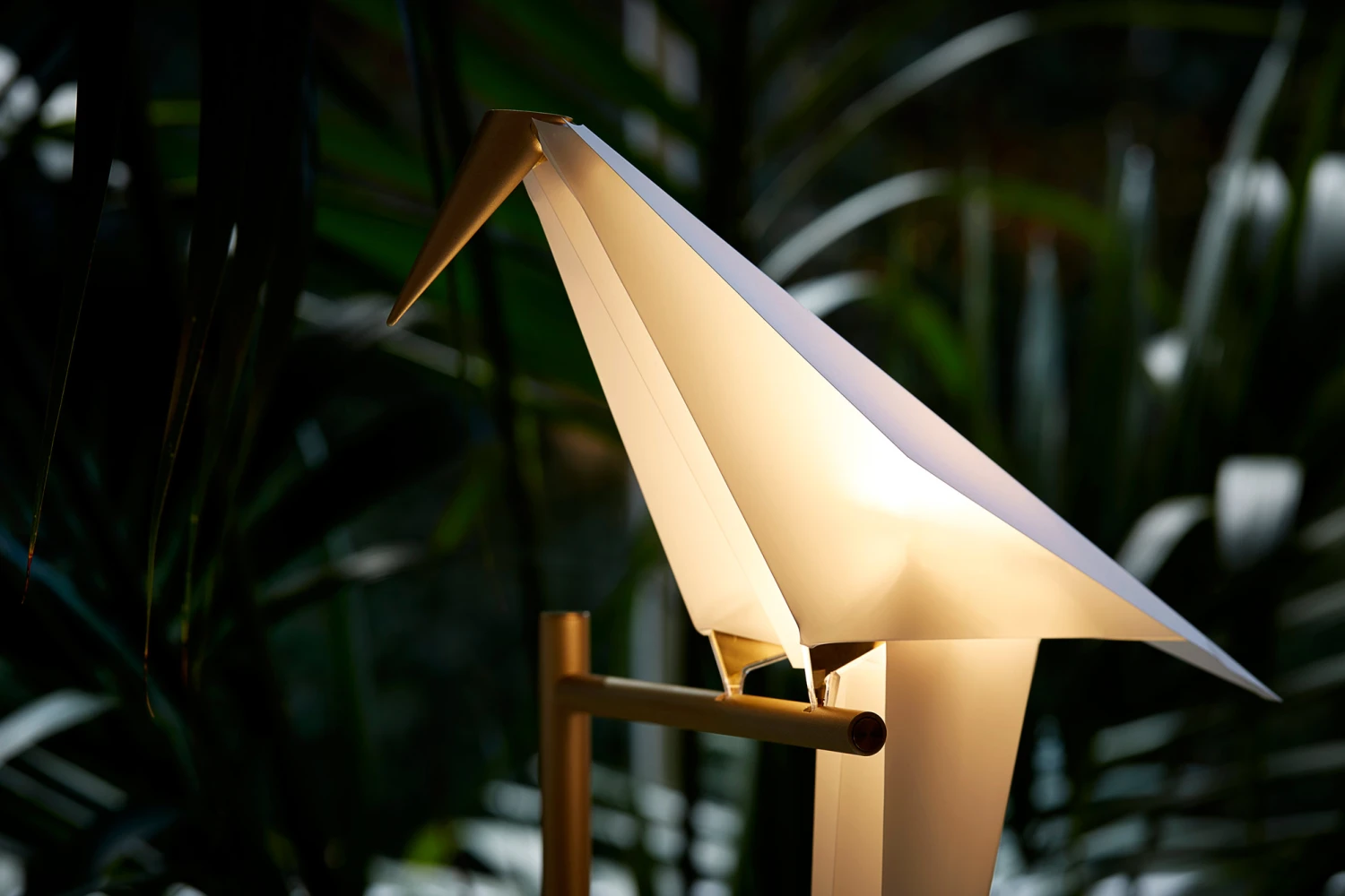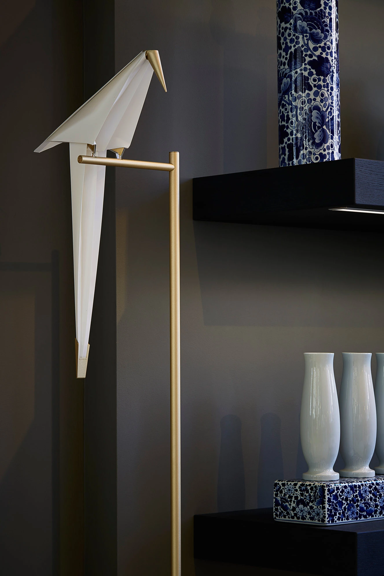 The Perch Light Floor Lamp, designed by Umut Yamac, has a poetically elegant White bird perched atop a Brass frame. This stunning piece is sure to be a conversation starter, as you admire this triumph of nature and beauty. In-line on/off switch.