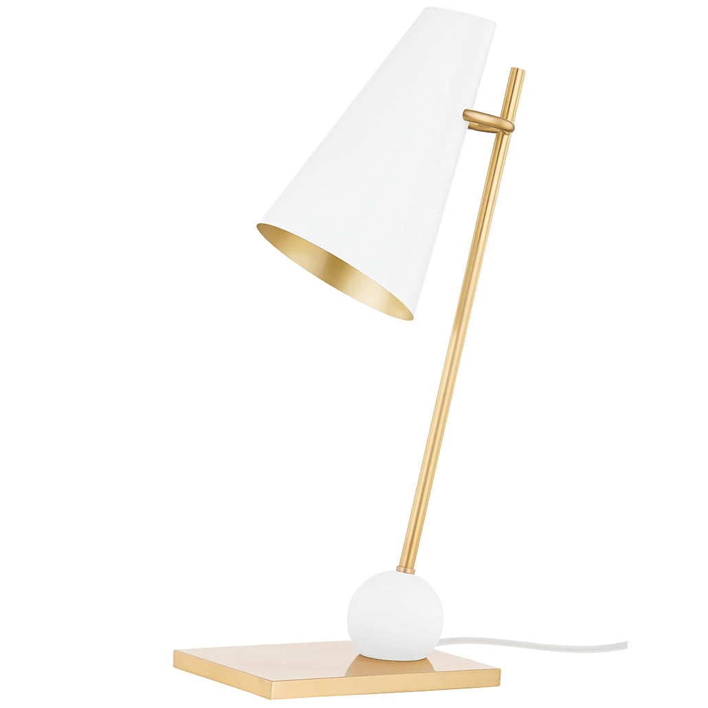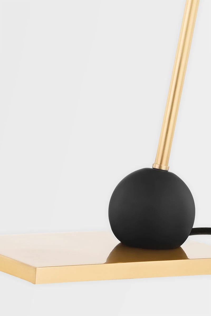 The Piton Table Lamp features a round ball rests atop a rectangular aged brass base. The slanted aged brass arm holds an equally askew conical shade that coordinates with the round ball on the outside and the arm on the inside. Dimmer on cord.
