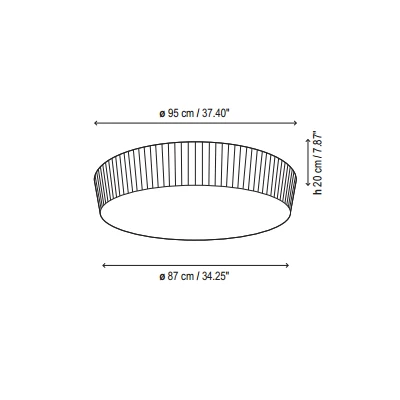 Plafonet 03 Ceiling Flush Mount features a hand wrapped White or Cream translucent polyester blend ribbon shade, or a White cotton shade. Finish in Stainless Steel. Includes frosted polycarbonate injection-molded diffuser. Requires six 20 watt 120 volt T4 medium base compact fluorescent lamps, not included. Dimensions: 34.25 inch diameter x 7.87 inch height. UL listed.