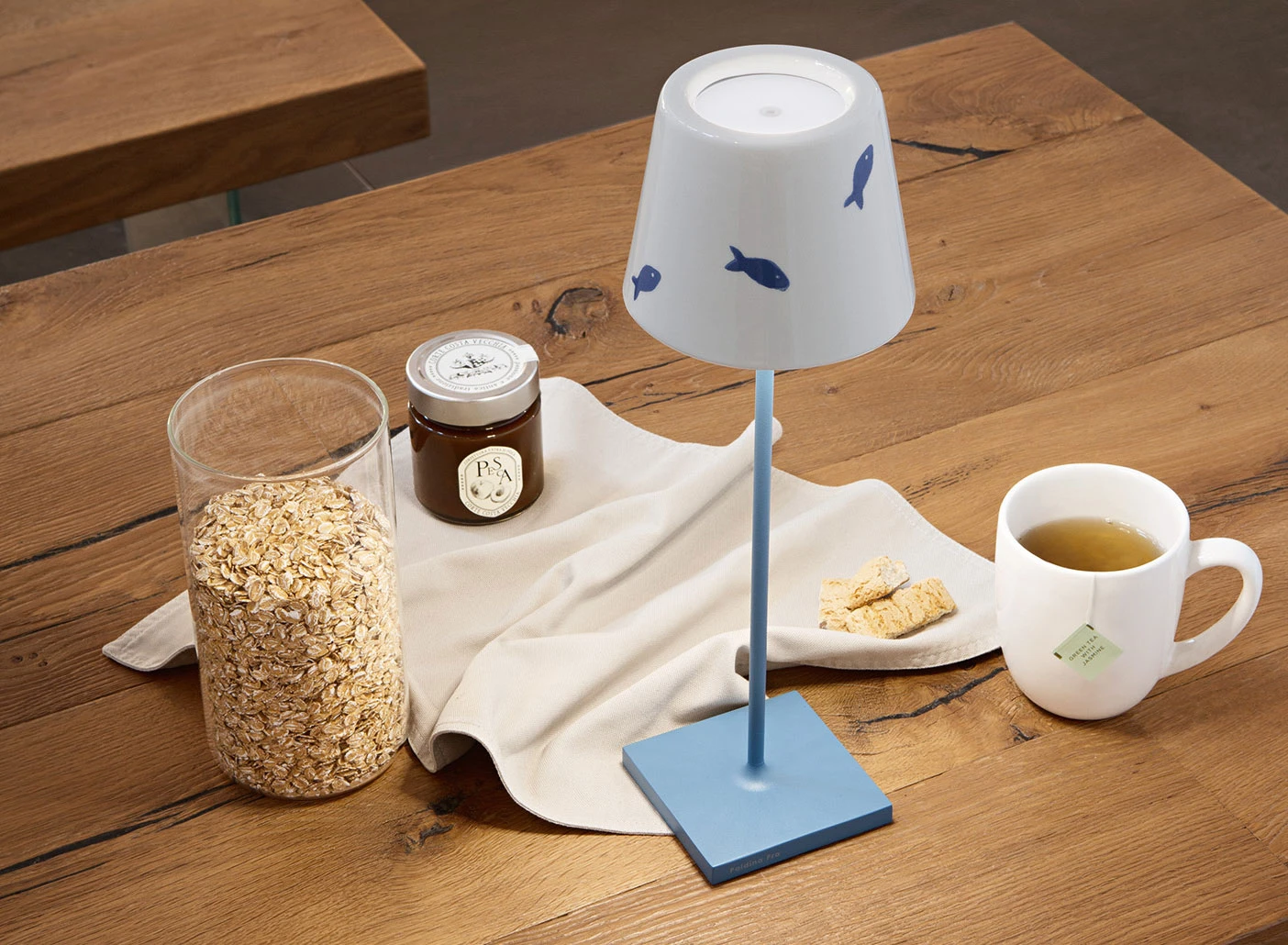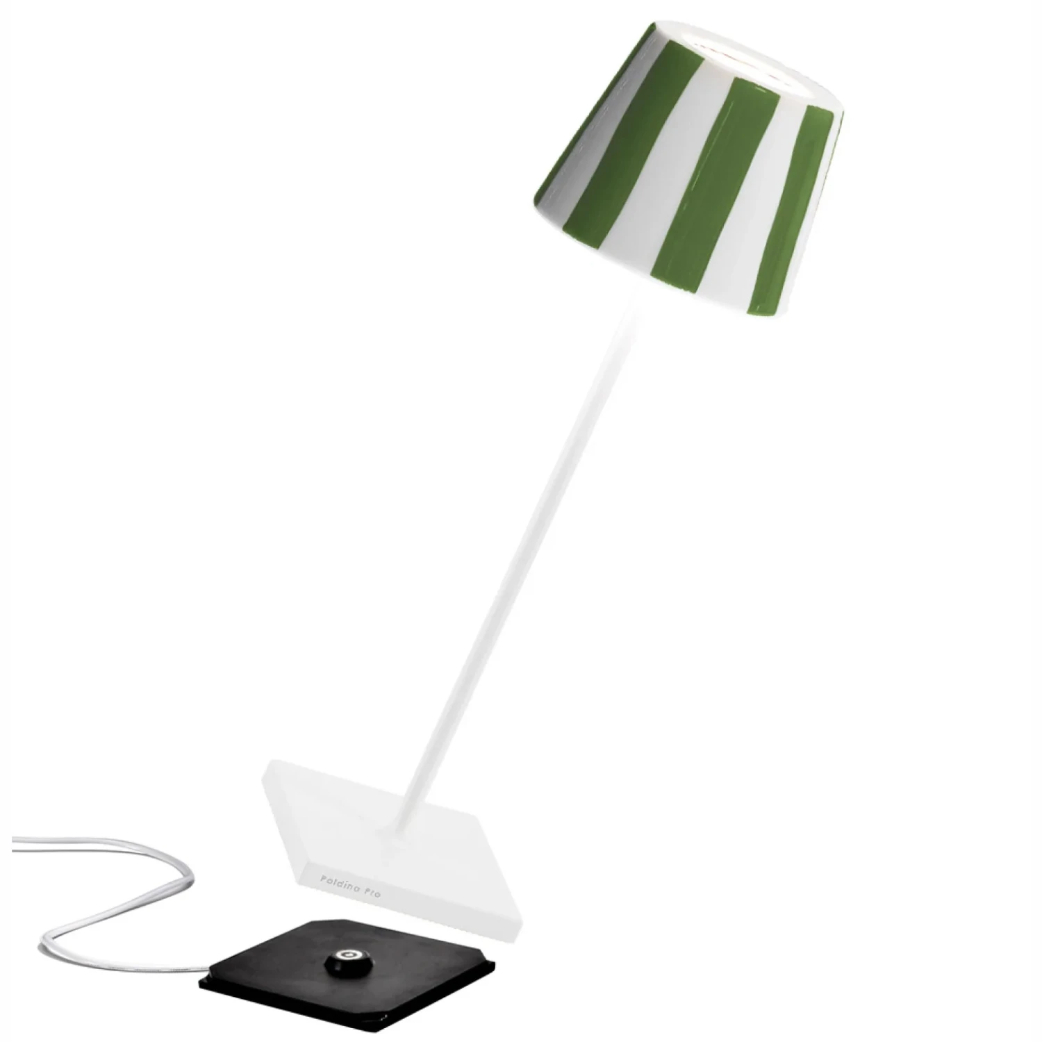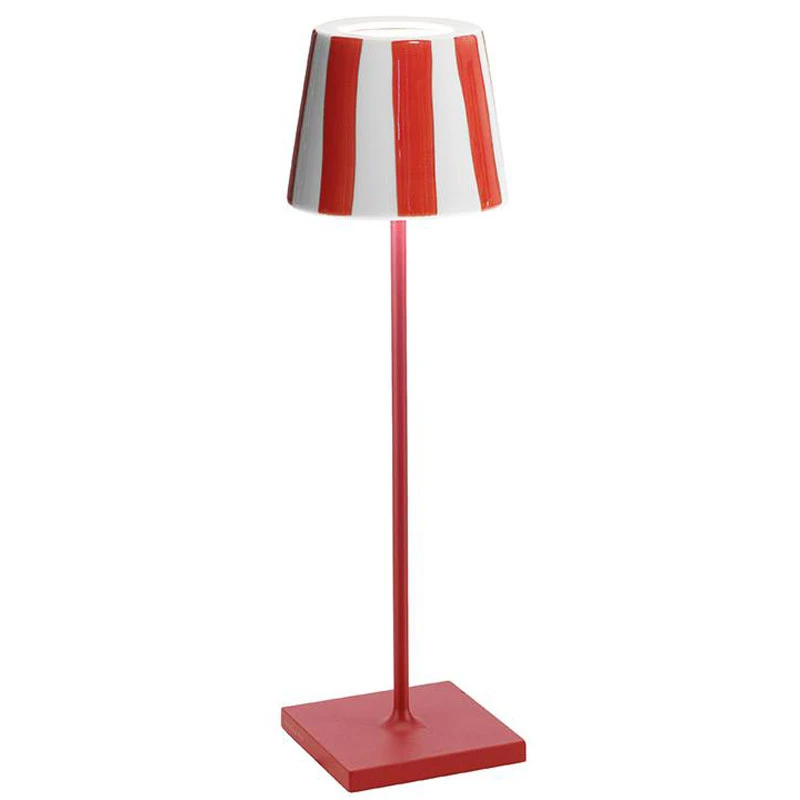 The Poldina Lido Rechargeable Table Lamp offers playful colors and patterns inspired by summertime trips to the beach. The tapered shade is crafted from ceramic with a polycarbonate diffuser to softly disperse light from the integrated LED. A rechargeable battery powers the lamp, allowing it to be easily relocated wherever additional lighting is needed.