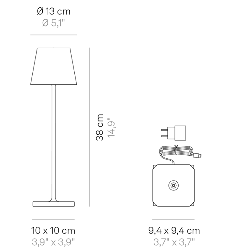 A 0-100% touch dimmer switch is located on the top of the lamp. Quickly tapping the button allows the lamp’s color temperature to be switched between 2200K, 2700K and 3000K (234-251-256 lumens). Battery life about 12 hours at full chargeCharging time approximately 6-7 hours. Contact charging base and cord are included. Suitable for indoor/outdoor (IP65) use.