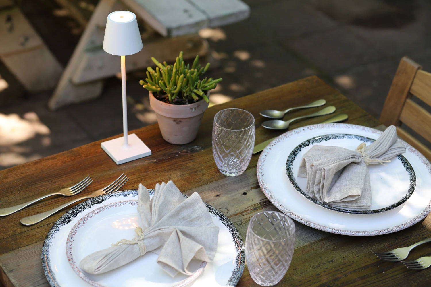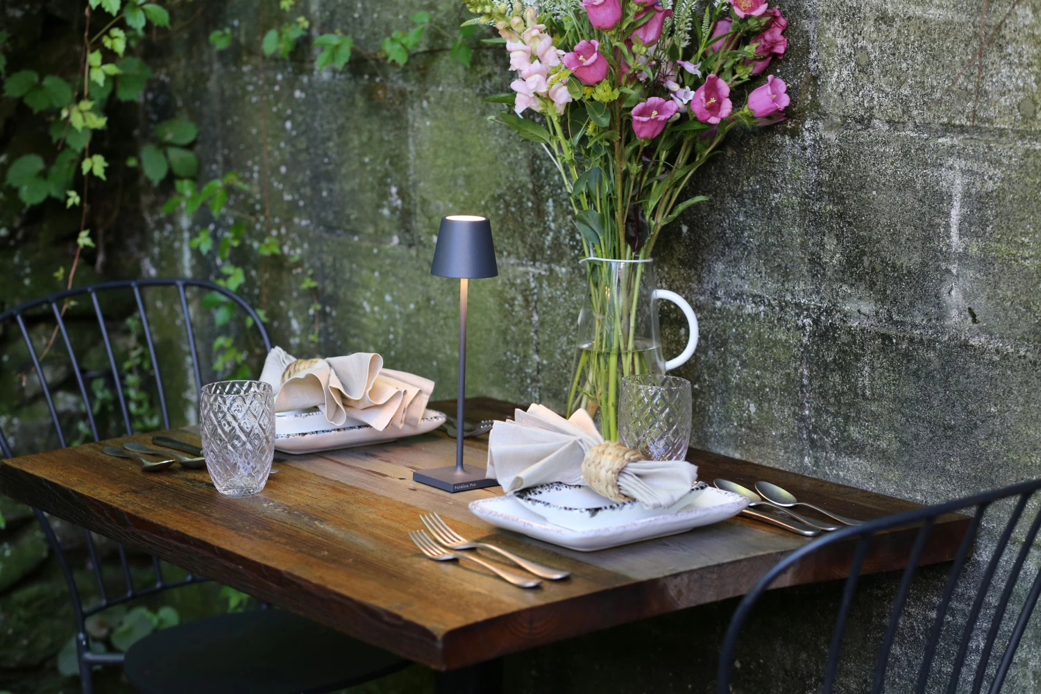 7-8 hour battery life with a 3-4 hour charge time. Rechargeable battery and contact charging base included. Features touch dimmer. Suitable for indoor/outdoor (IP65) use. Note: Glossy Gold and Glossy Chrome finishes may tarnish or peel if left outdoors for extended time periods.