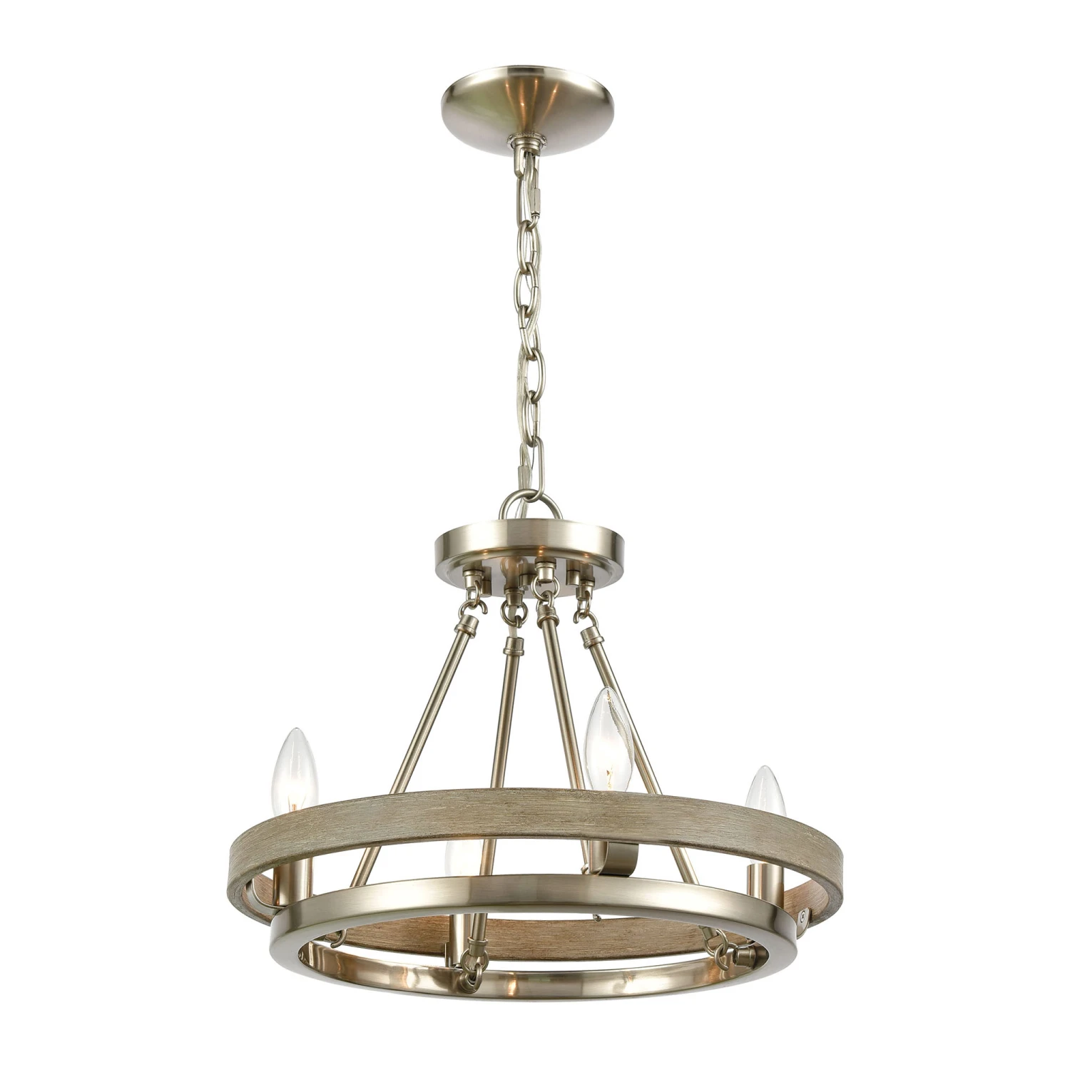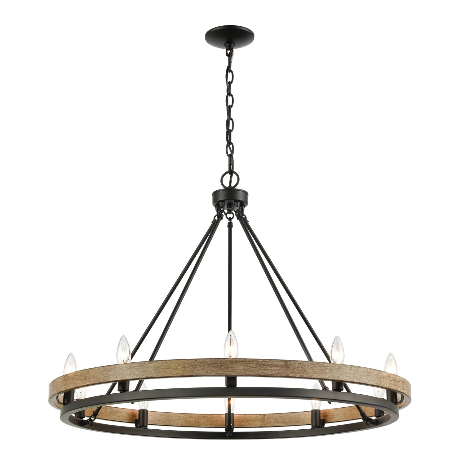 The Ramsey Chandelier offers a modern stylish design that will complement a variety of decors and applications. Features a double ring design with sockets nestled within the outer ring. Finished in Matte Black with an Aspen finished outer ring or Satin Nickel with Beech Wood finished outer ring. Choose from four, six or ten light option. Canopy: 5 inch diameter. UL listed.