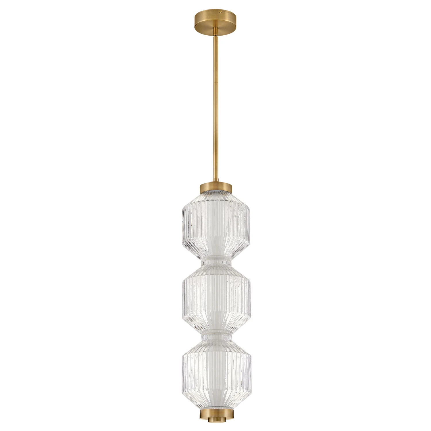 The Reign Convertible Pendant’s glamorous silhouette combines textural interest and transitional elements for a vibrant and versatile collection. Clear ribbed glass shades and a gleaming Lacquered Brass finish present a captivating form from any angle. Illuminated by integrated LED lighting. Can be convertible from pendant to wall sconce. Includes a universal 120-277V driver.