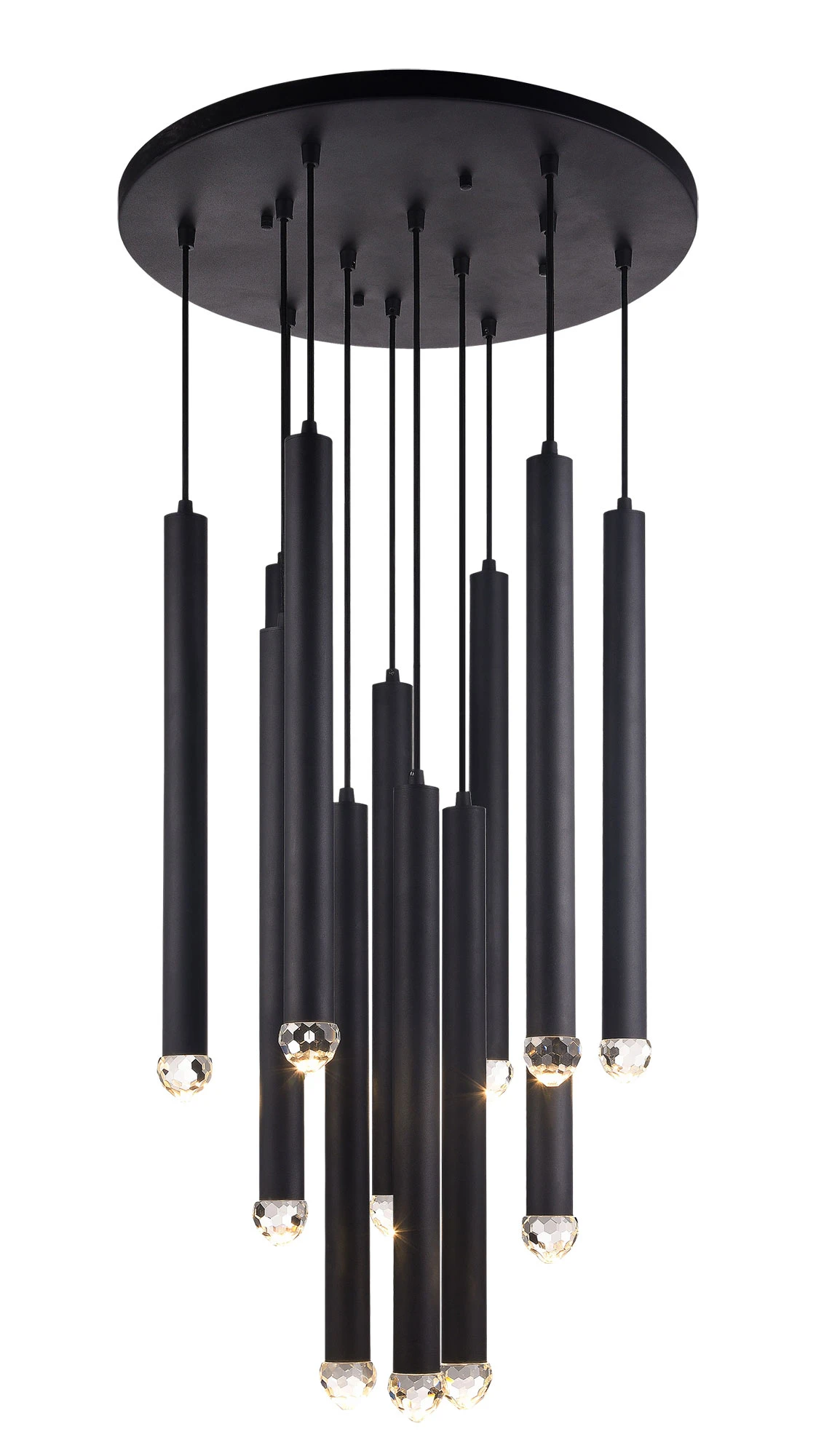 Reign Multi Light Pendant is inspired by traditional windchimes, perfect in any room of your home. Crystal Clear, gem-like glass is complimented by a Matte Black, Aged Gold Brass, or Chrome finish. Includes 12 feet of Black fabric cord to customize length.