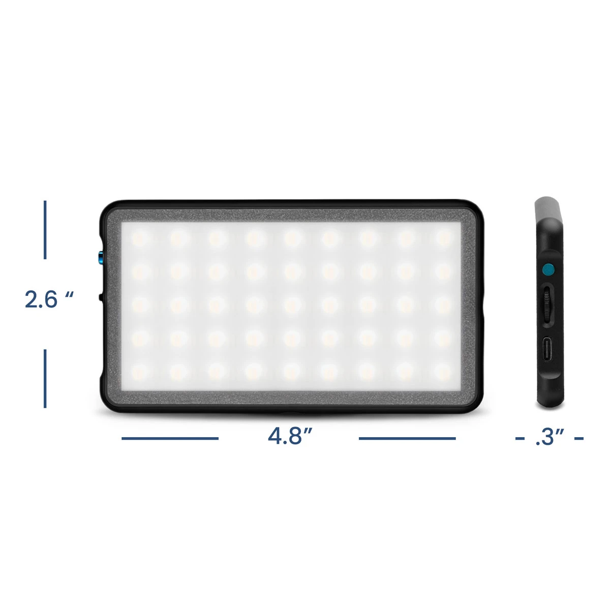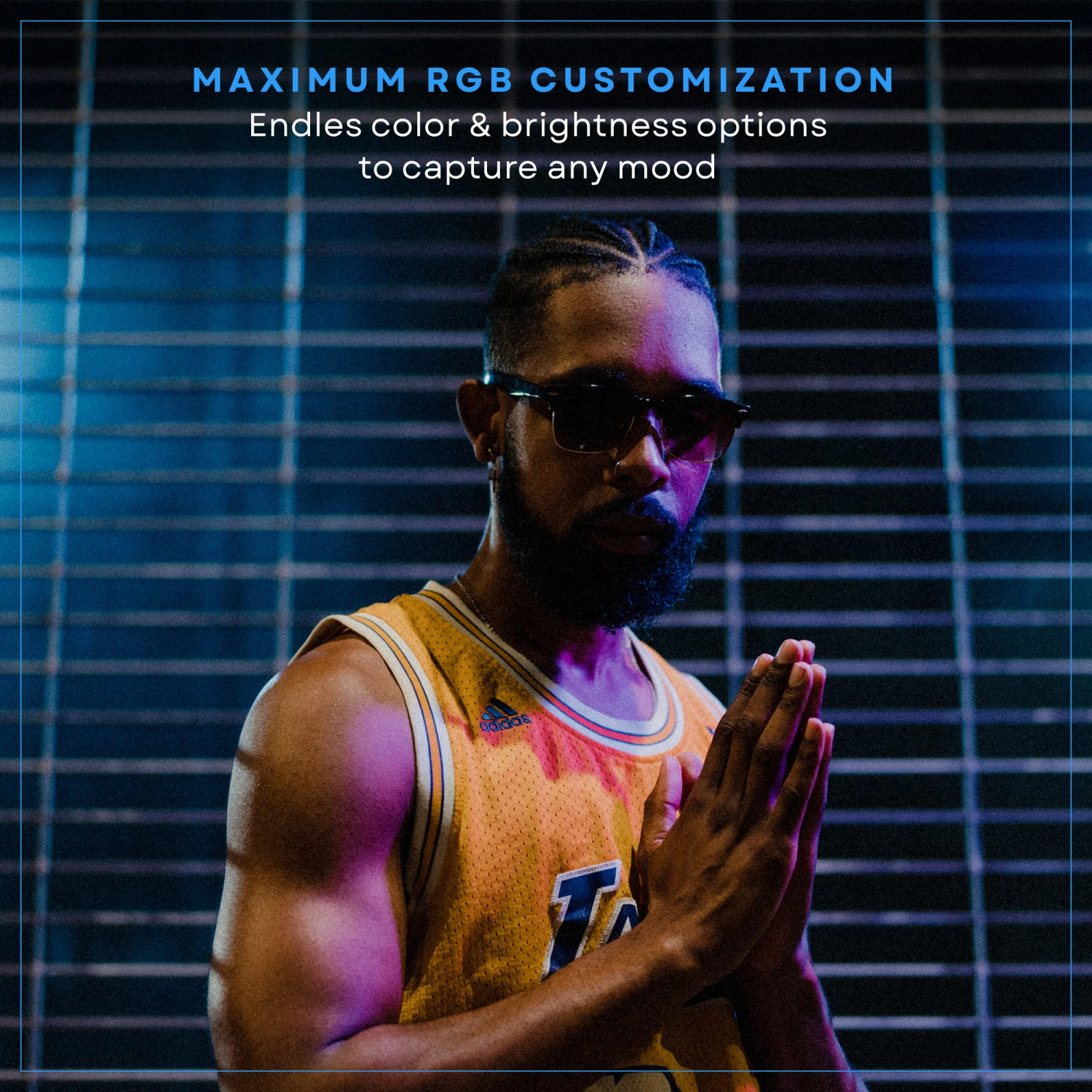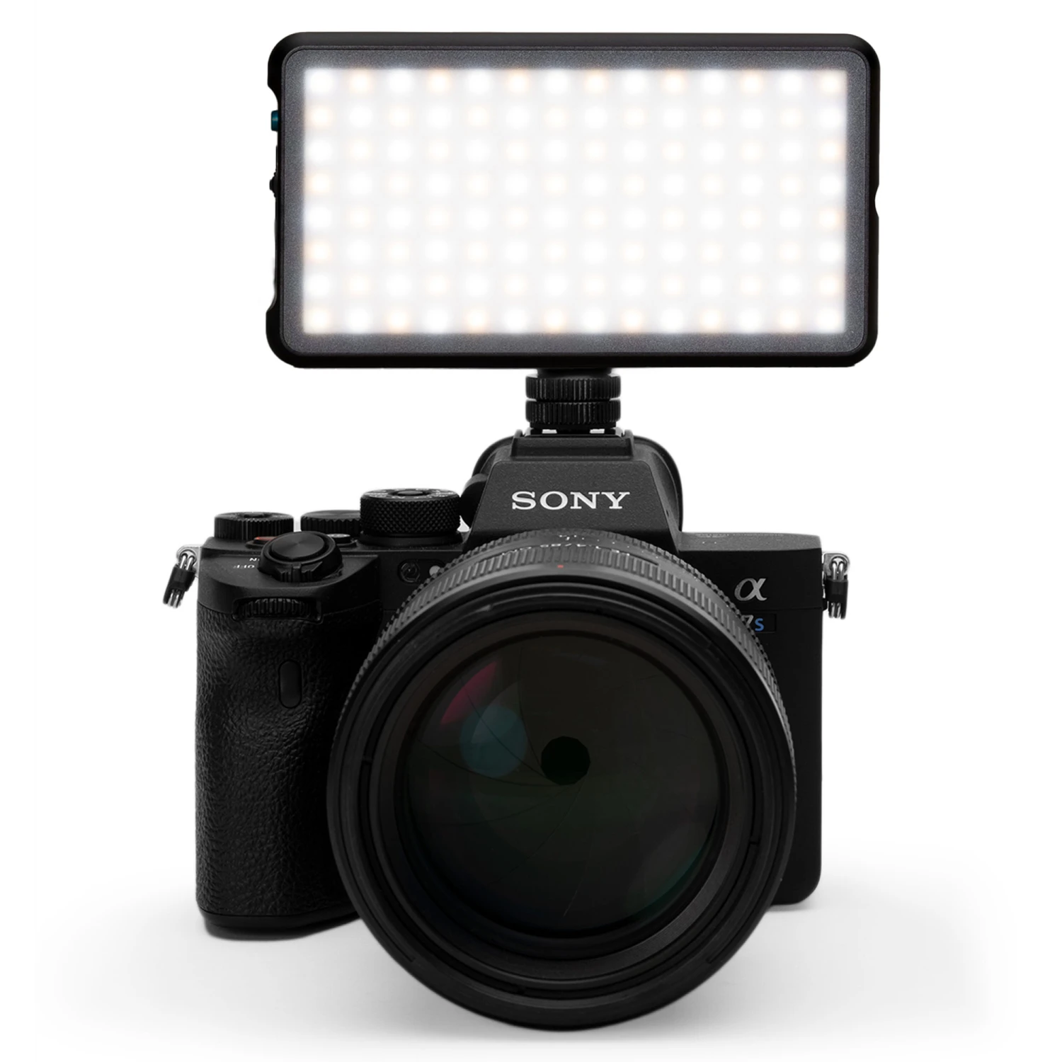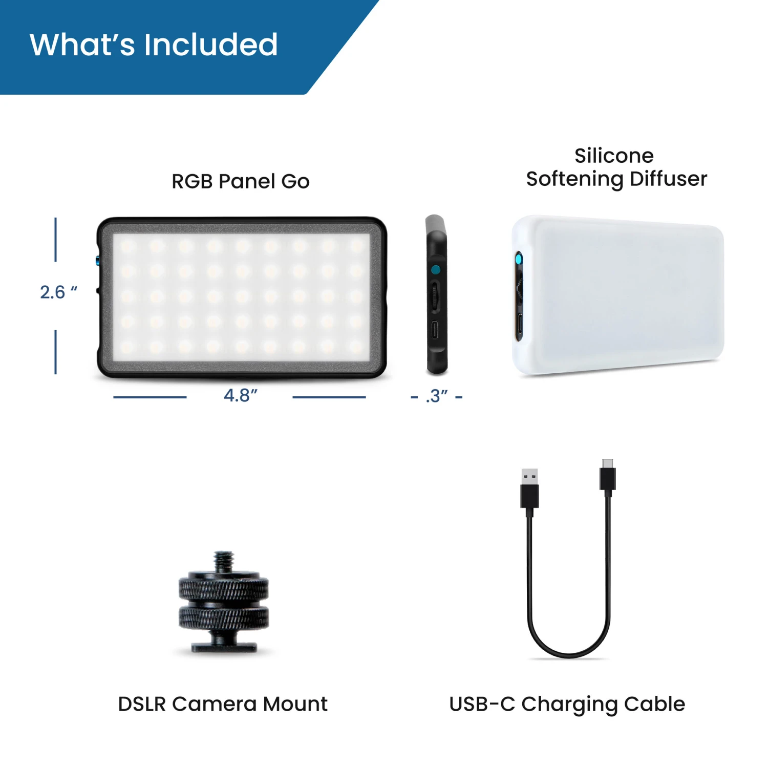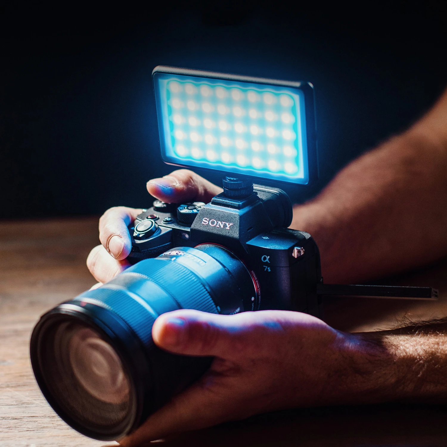 A perfect blend of portability and functionality, the RGB Panel Go offers full-color customization for cinematic moods and an output capable of illuminating entire night scenes. This workhorse camera light does it all in a conveniently portable mid-size. With preprogrammed scenes, strobe, versatile mounting, and an impressive battery lasting 78 minutes at max output, the only limit is your imagination.
