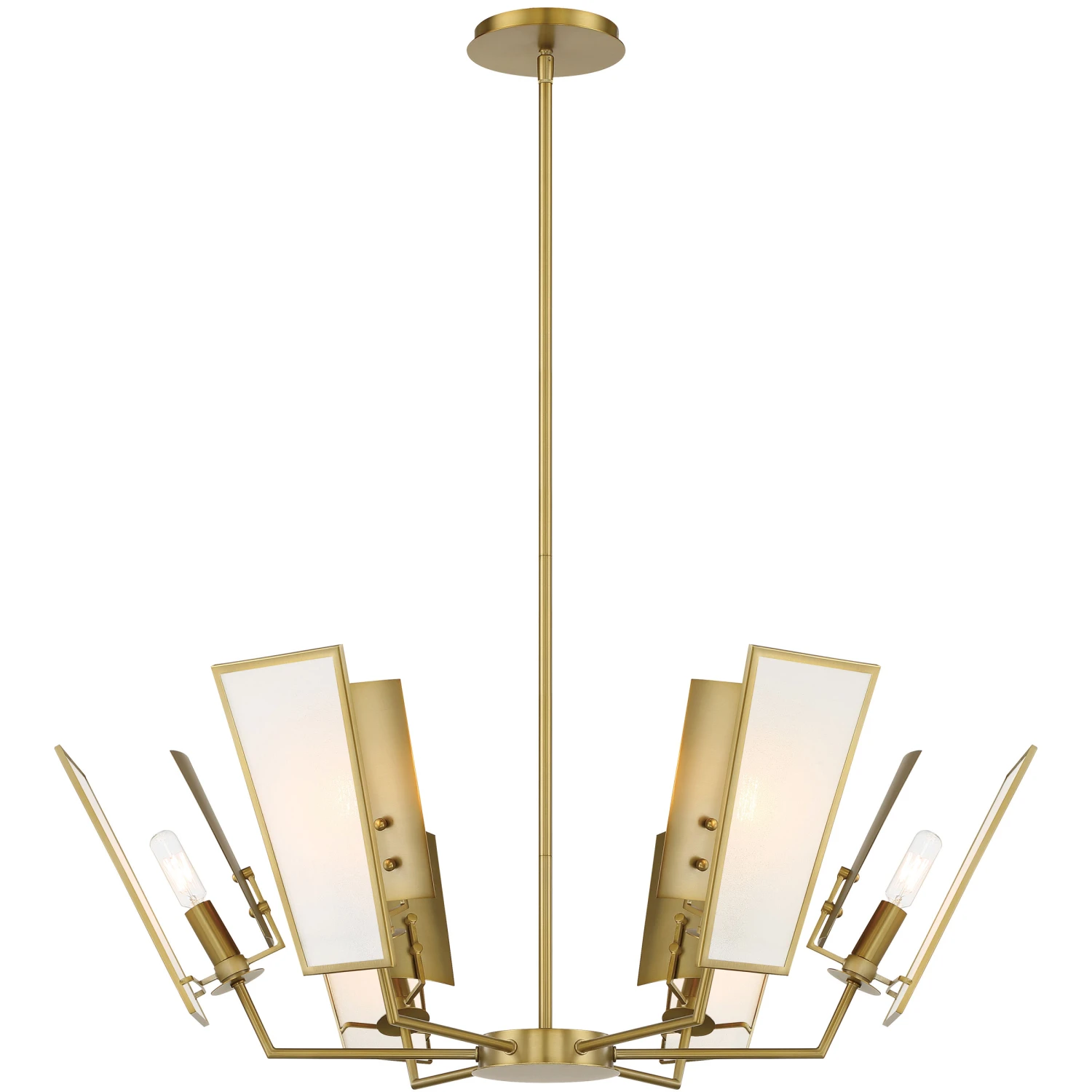 The unique design of the Ricochet Chandelier is sure to make a bold statement in your interior. The bulbs are obscured by tapered, white textured glass panels with a soft brass trim. Rectangular metal plates behind the bulbs help to reflect light outwards. The fixture’s open sides help to create a light, airy look with a modern expression.