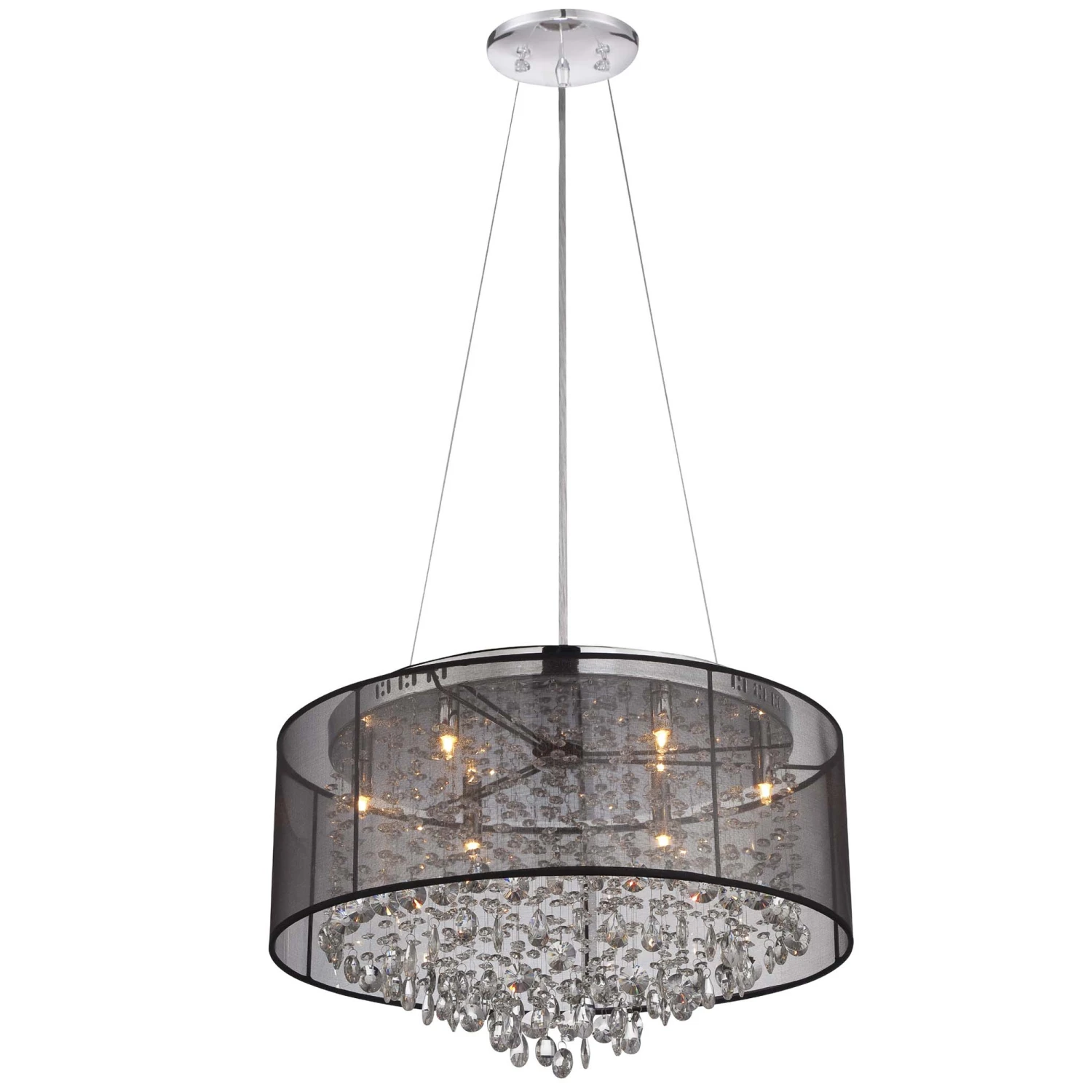 The Riverside Drive Pendant features cut and polished crystals and a Black or Silver translucent organza shade. Four/six 40 watt 120 volt G9 halogen base bulbs required, but not included. Able to be mounted as a Semi Flush Mount or a Pendant. Four light: 16.5 inch width x 14.5 inch height. Six light: 23.5 inch width x 15 inch height.