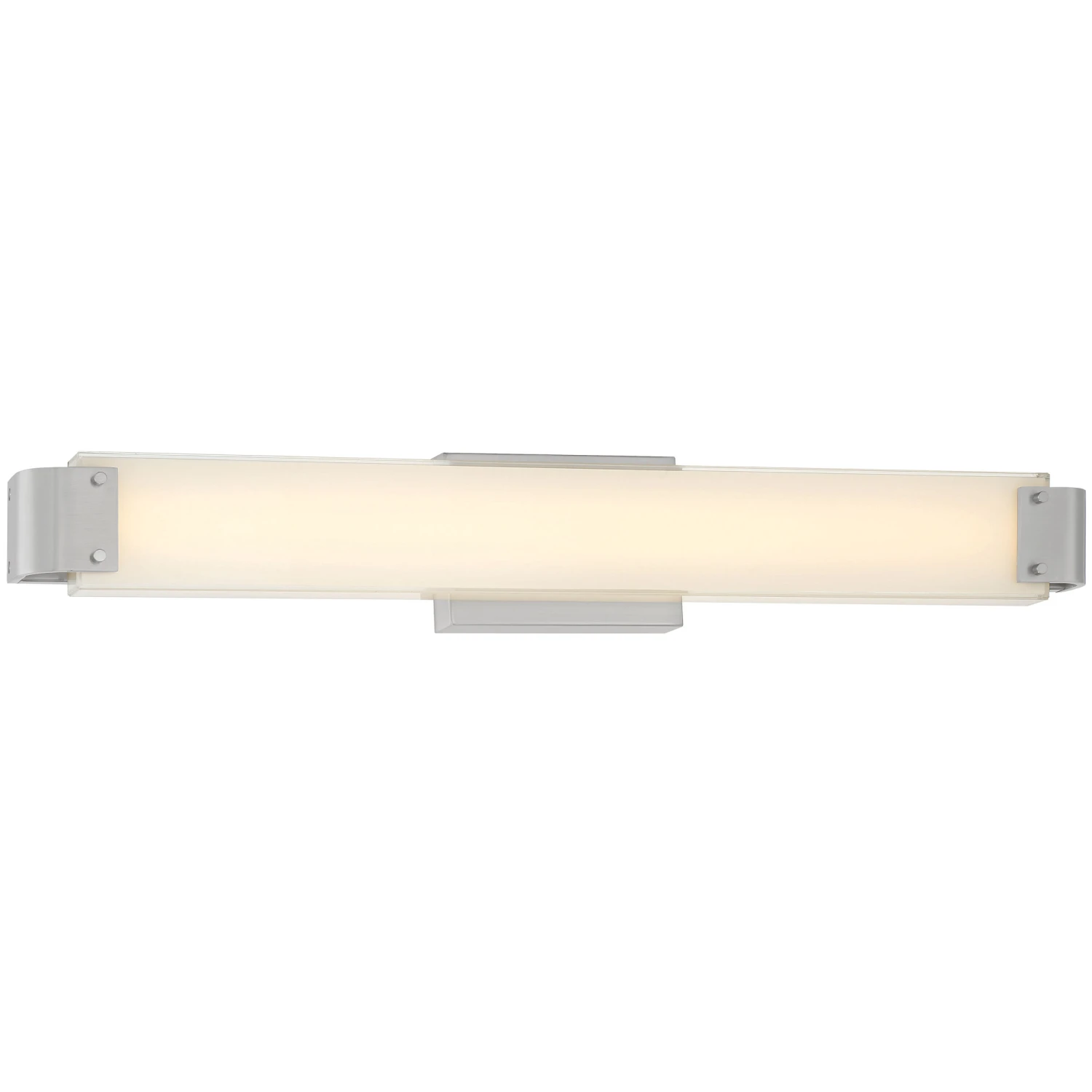 The Round-A-Bout Bathroom Vanity Light is a perfect lighting solution for a contemporary bathroom with its slim profile and sleek design. An integrated LED light source sits behind a frosted glass shade that softly diffuses light. Brushed nickel hardware supports the diffuser and provides a modern, metallic accent.
