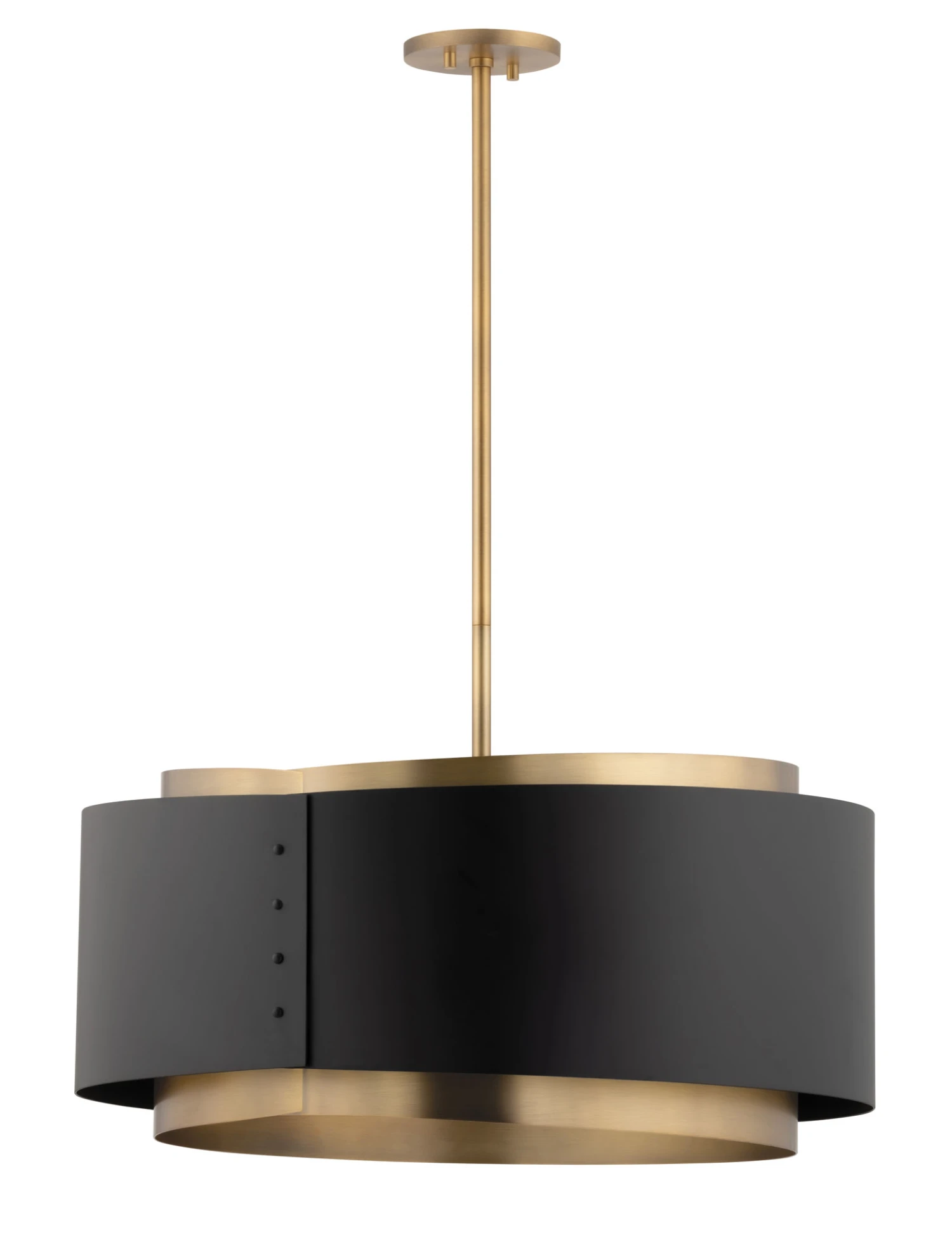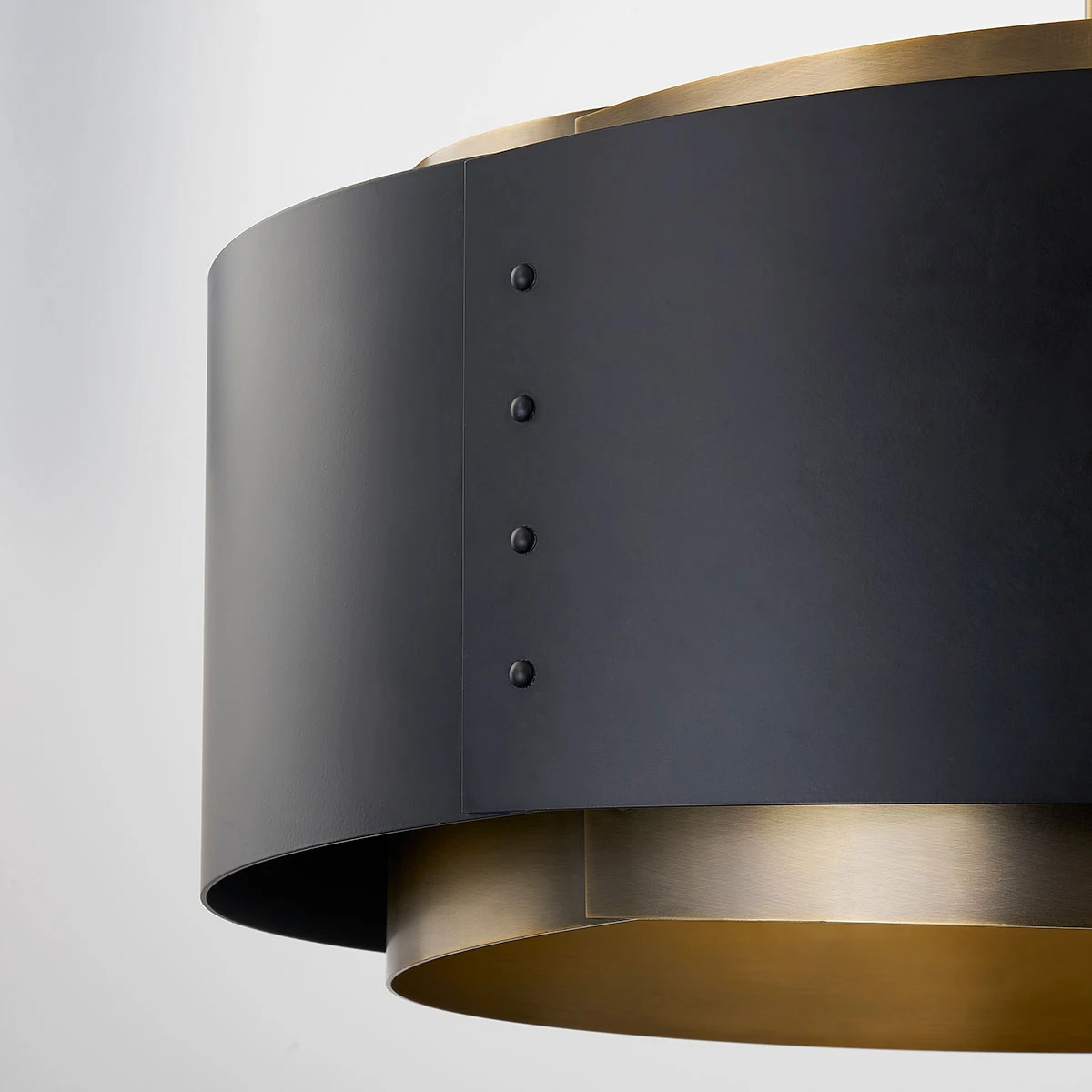 The Roux Pendant is a modern, artistic update on the traditional drum shade. Metal bands with perfectly imperfect lines wrap around each other creating a sleek layered look and a feeling of movement. The two-tone pendant features Patina Brass wrapped in Soft Black with industrial detailing.