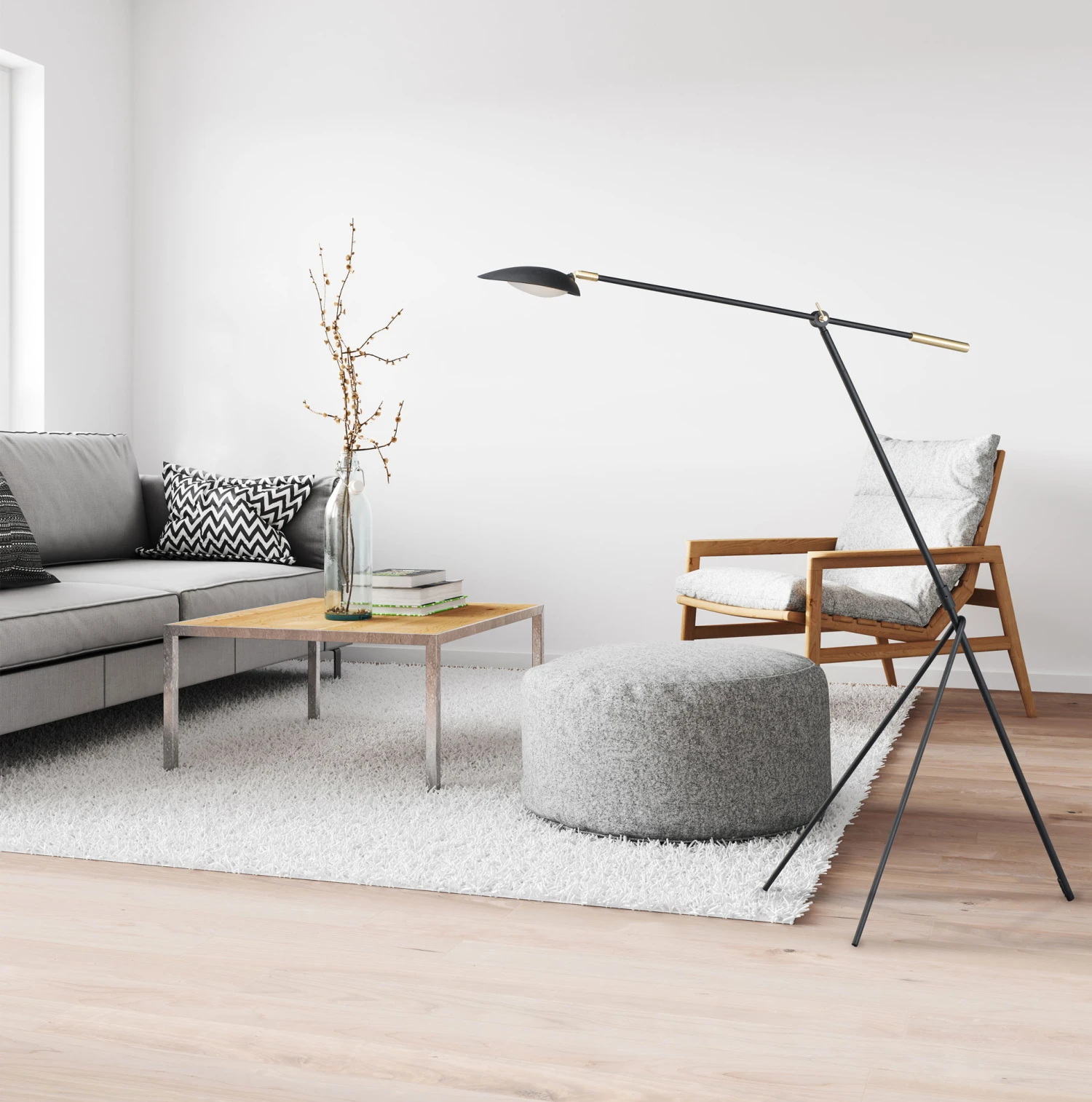 Scan Floor Lamp is inspired by mid-century designs and sleek simple lines. Features a tapered hood with a white acrylic diffuser that can be adjusted to direct light. Finished in black with contrasting satin brass accents to soften the look. Perfect in any room of your home. Comes with a 10 foot cord. UL listed.