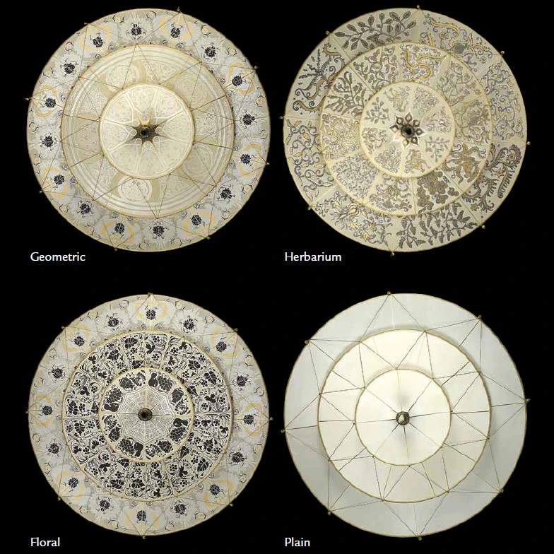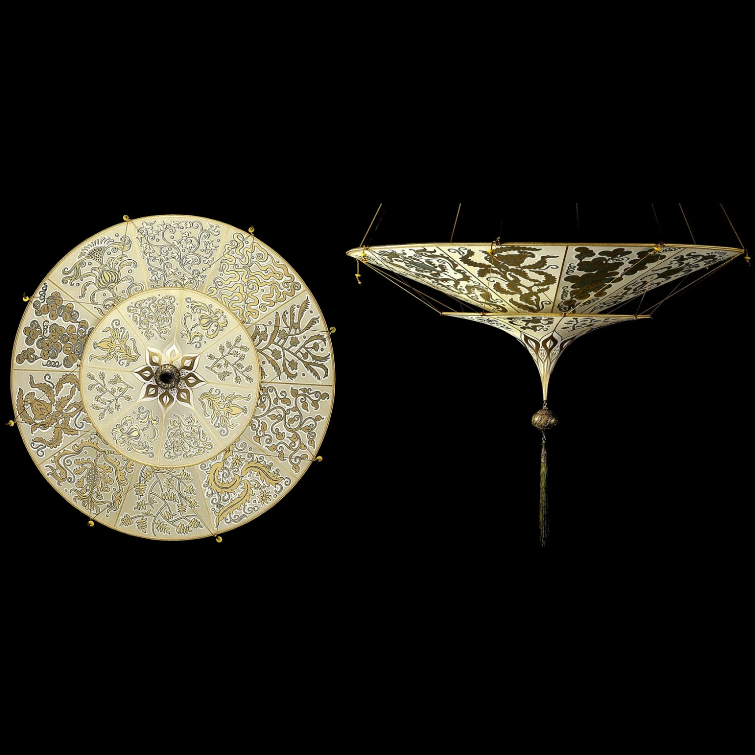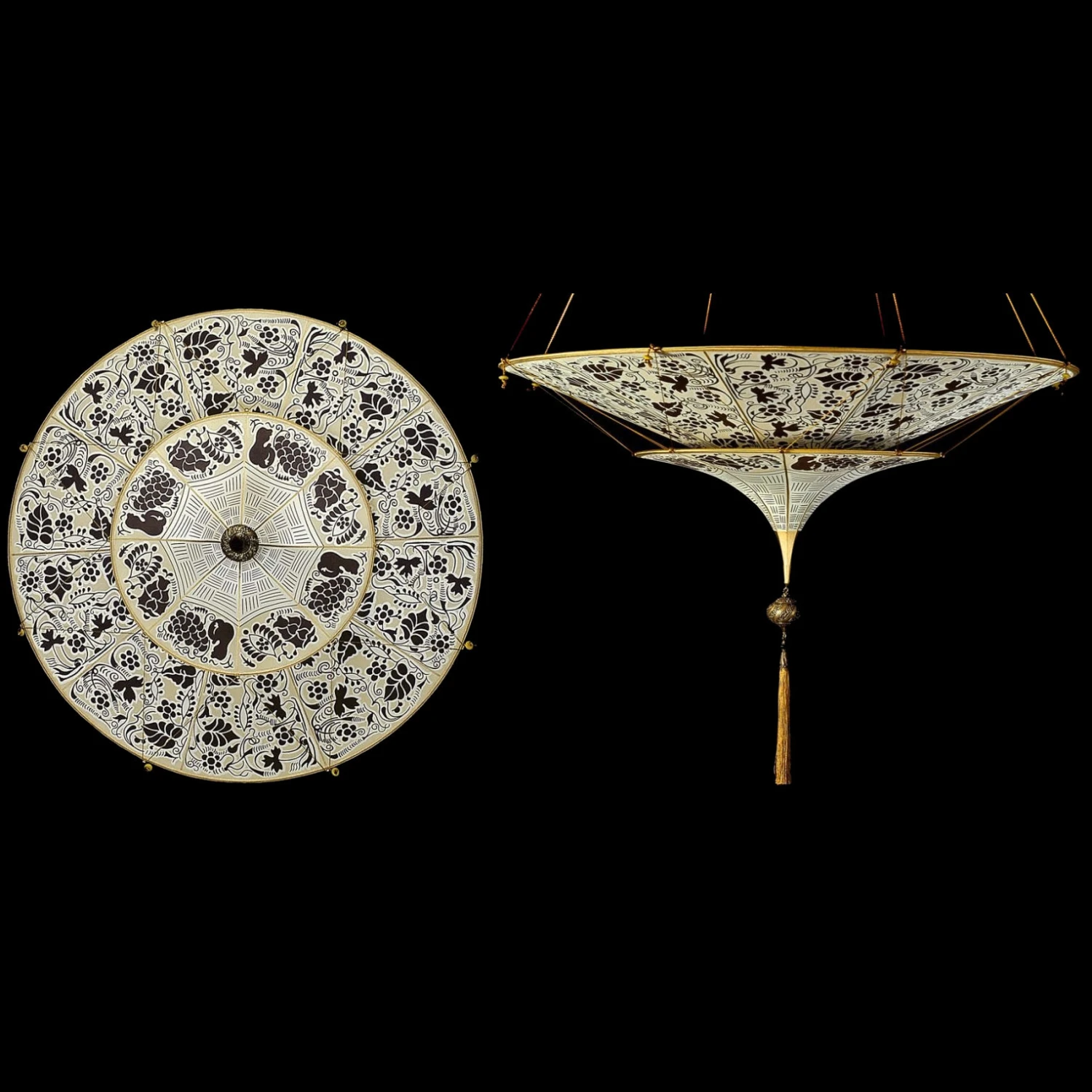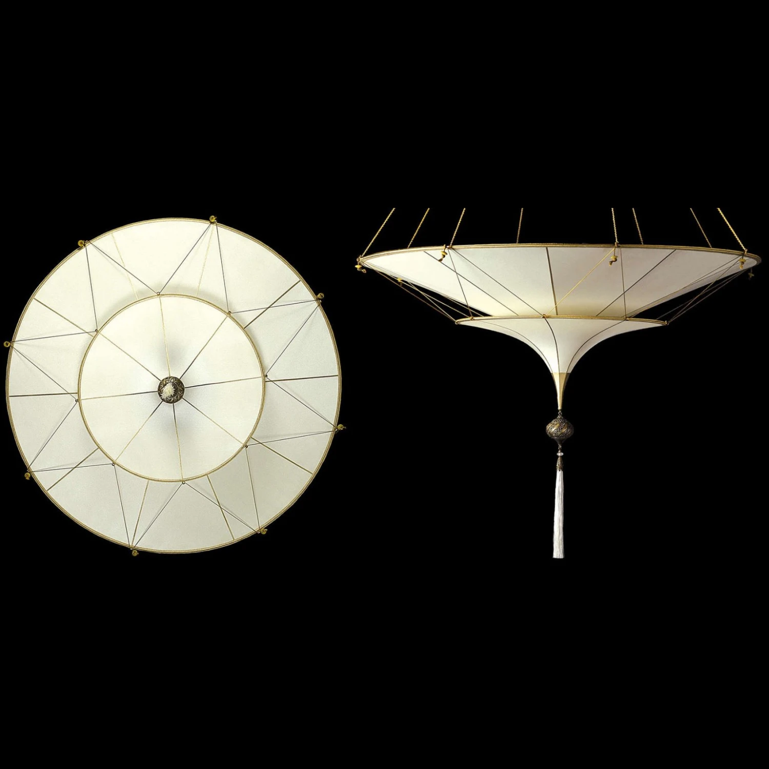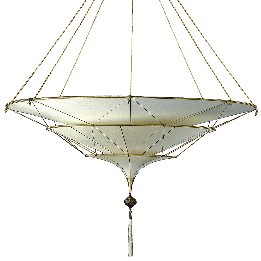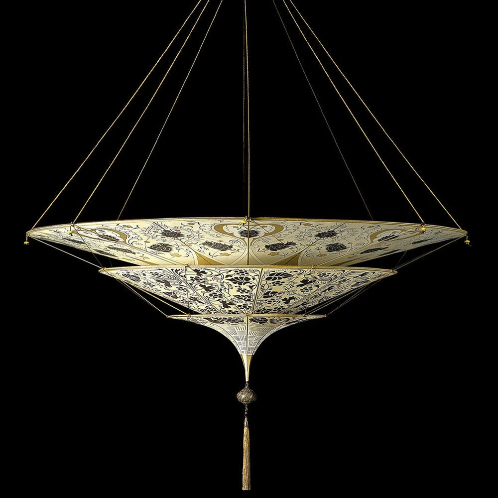 Scheherazade Multi Tier suspension features a pure silk shade, brass structure and a dark brown canopy. Available in hand painted brown geometric, green herbarium, brown floral or an ivory plain silk shade. Available in a 2-tier with one bulb and a 3-tier option with three bulbs. Made in Italy.