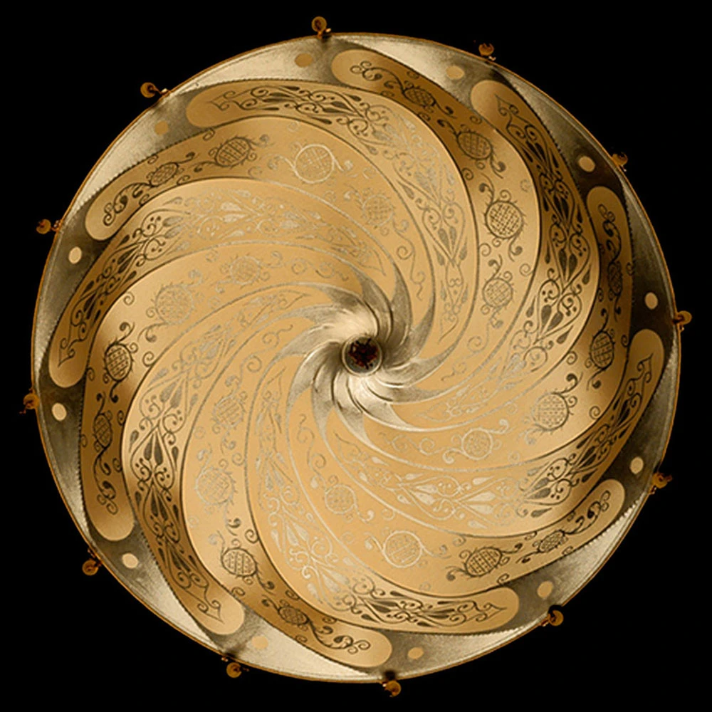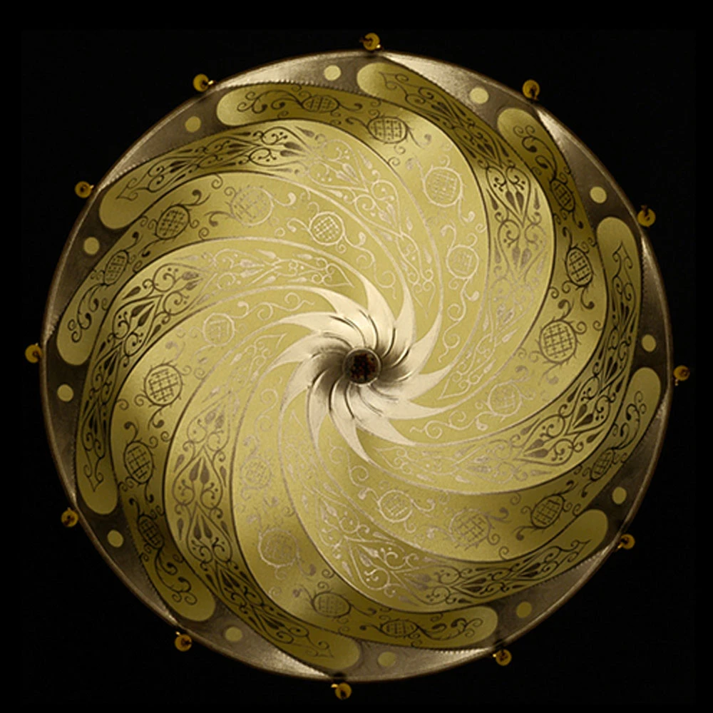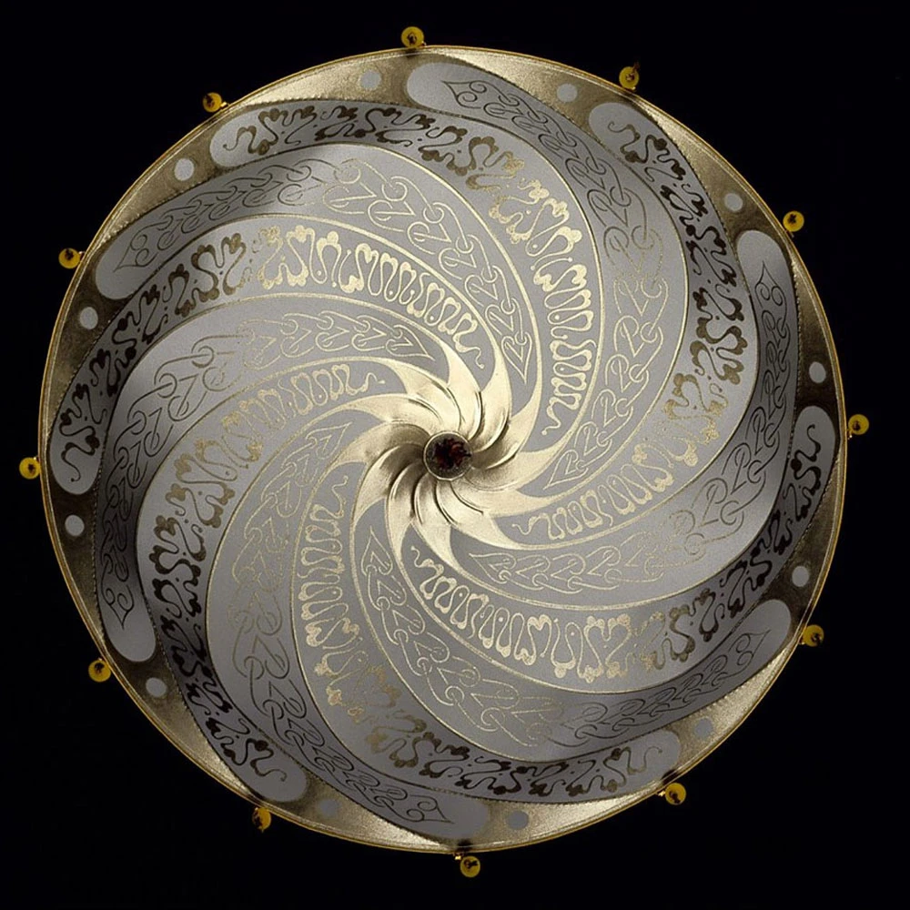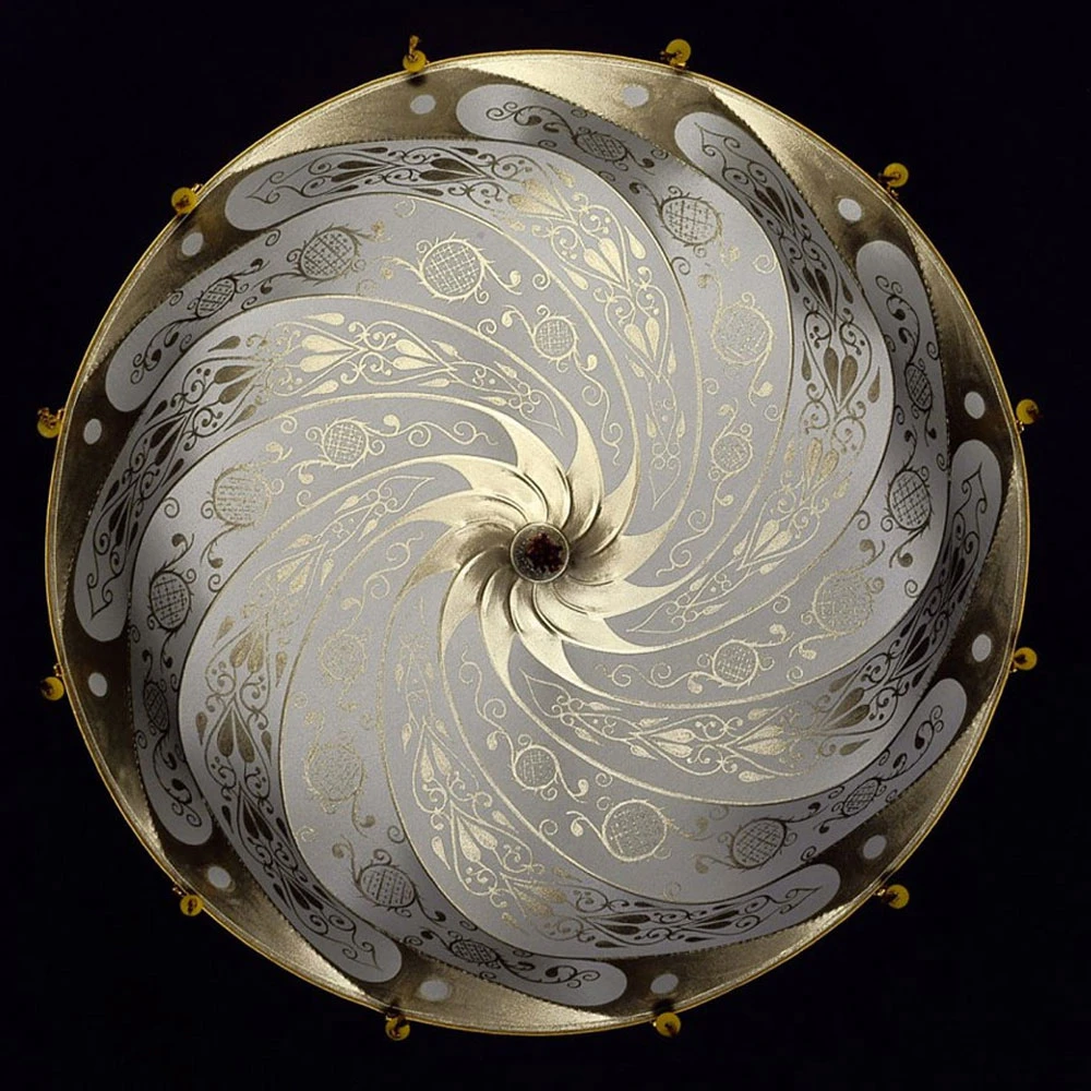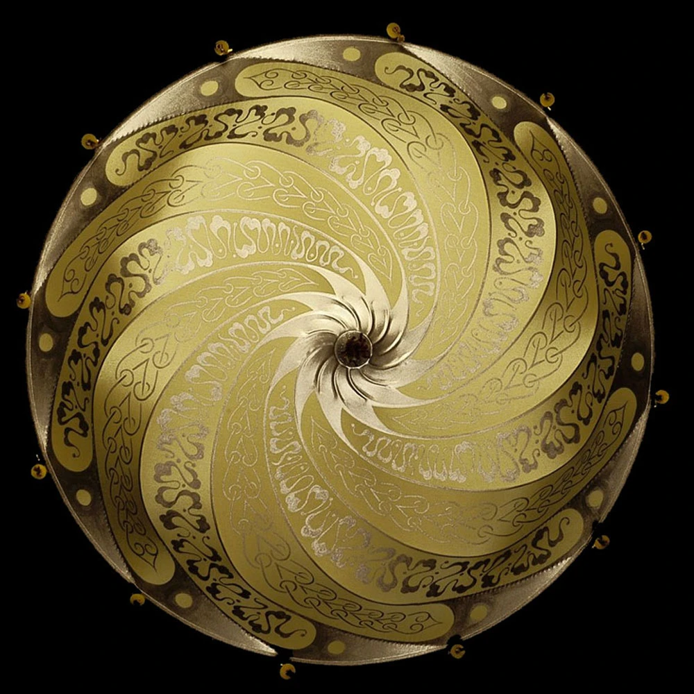 The Scudo Saraceno Silk Ceiling Light is inspired by the Saraceno Shield from Medieval times. The delicate silk is complemented by striking details including Murano beads with a brass structure finish and a dark brown canopy in a stylistic Turkish -Venetian motif. Patterns available in Classic or Serpentine in Gold, Salmon, Sage Grey, Ivory or Light Blue, or Plain in Ivory. Made in Italy.