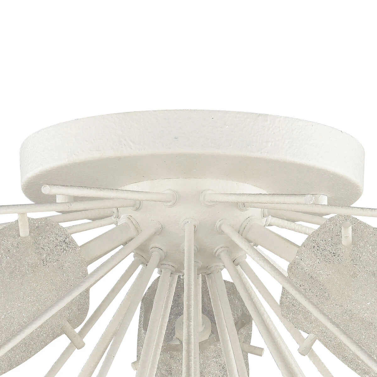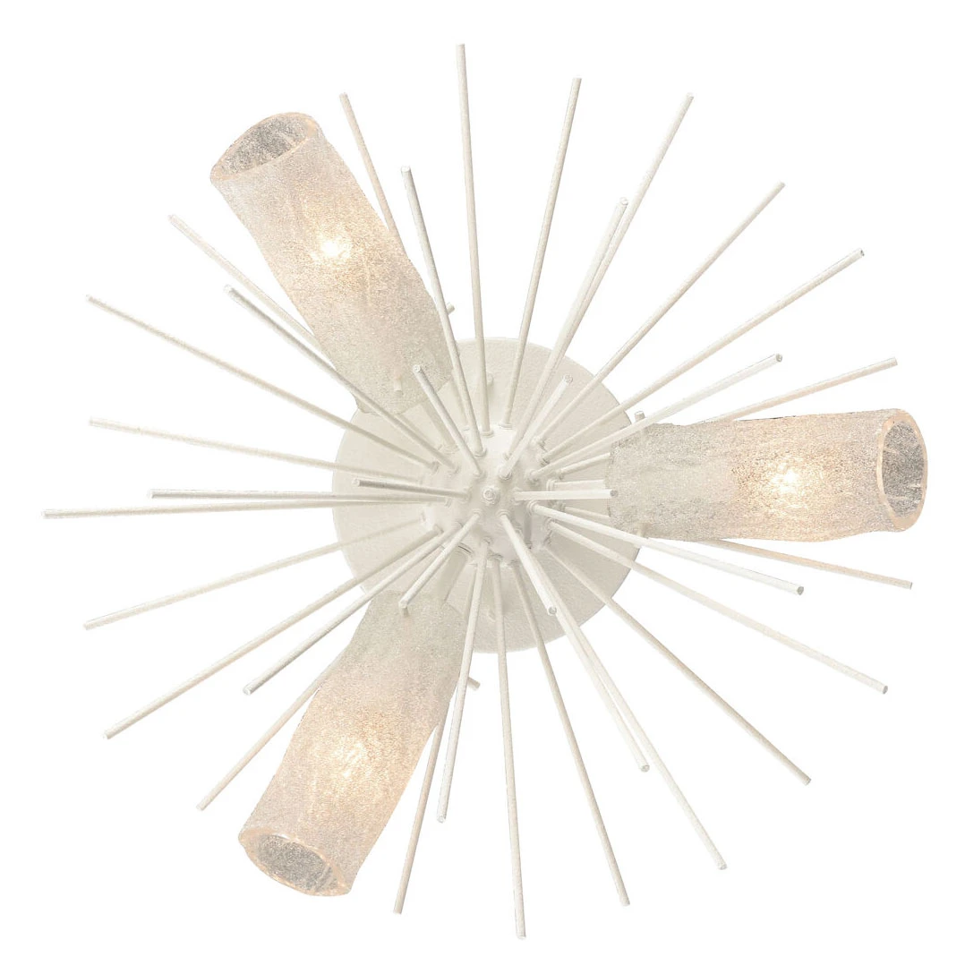 The Sea Urchin Ceiling Light represents a unique twist on the starburst style by infusing coastal elements into the design. The White Coral finish adds texture to the spiked metalwork while hand-formed scavo glass reminds us of sand and sparkling seas.