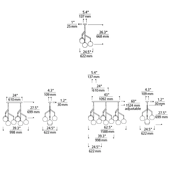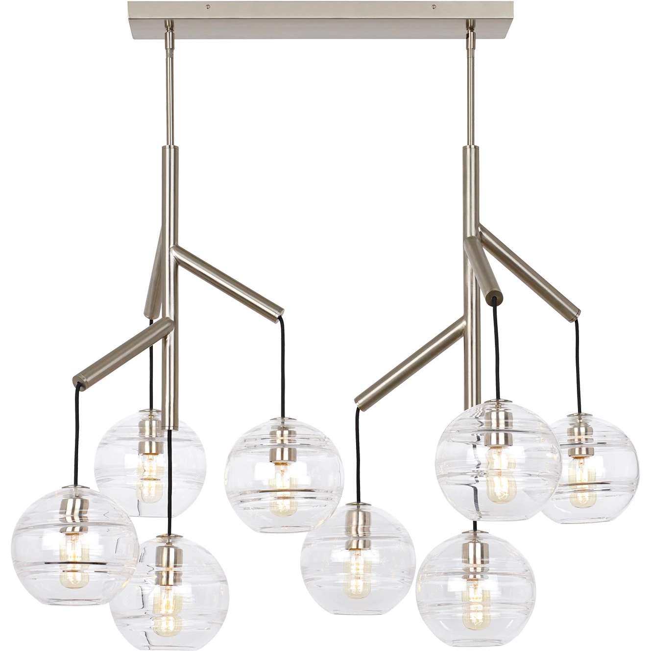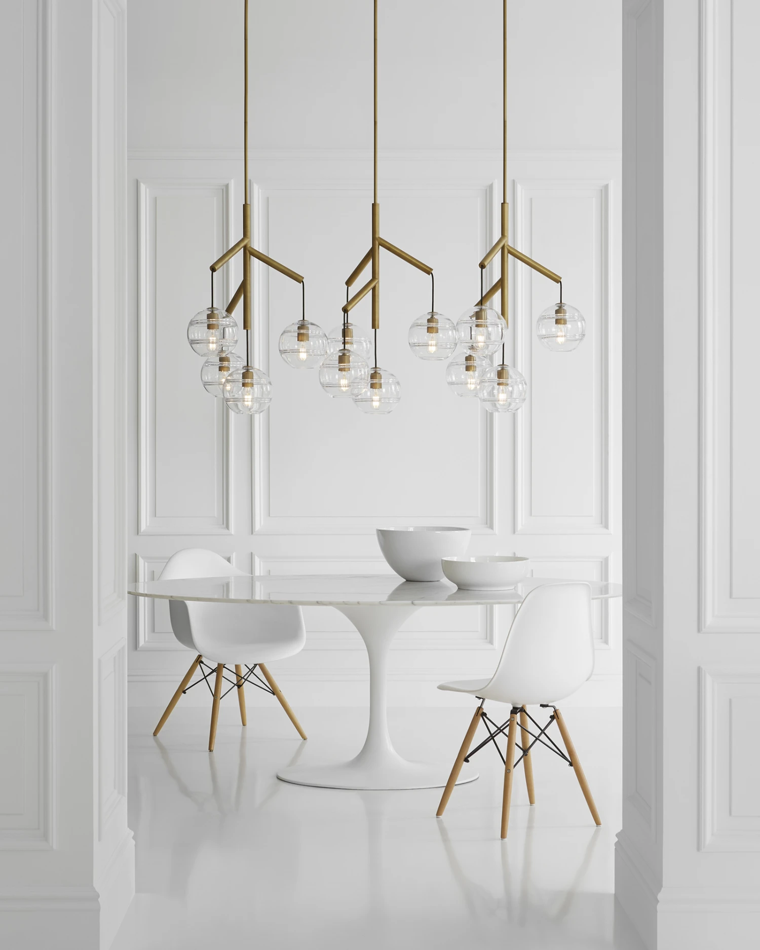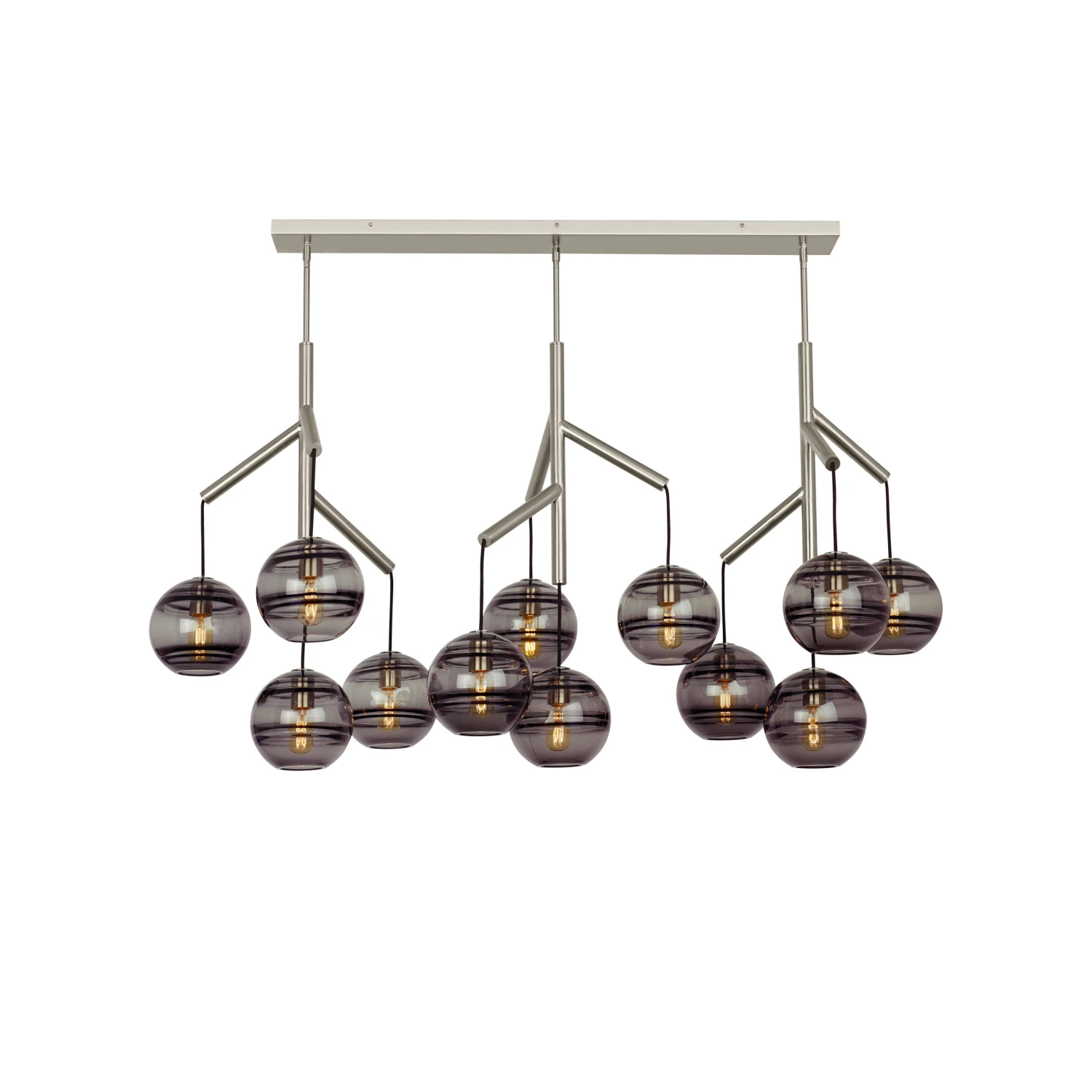 The Sedona Chandelier is best described as a deconstructed modern chandelier, where glass orbs are each suspended from a branchlike central hub via contrasting textured cloth covered cords. Each transparent Clear or transparent Smoke glass orb is spherical and smooth on the exterior surface while the interior surface features thickening bands of glass artfully crafted. Finish in Aged Brass or Satin Nickel. Available in a single, double or triple chandelier option with incandescent and LED lamp options. Ships with one foot of field cuttable black cloth cord and five feet of variable rigid stems (includes four 12 inch and two 6 inch). ETL listed. Suitable for damp locations. LED dimmable with an LED compatible or Triac dimmer, sold separately.