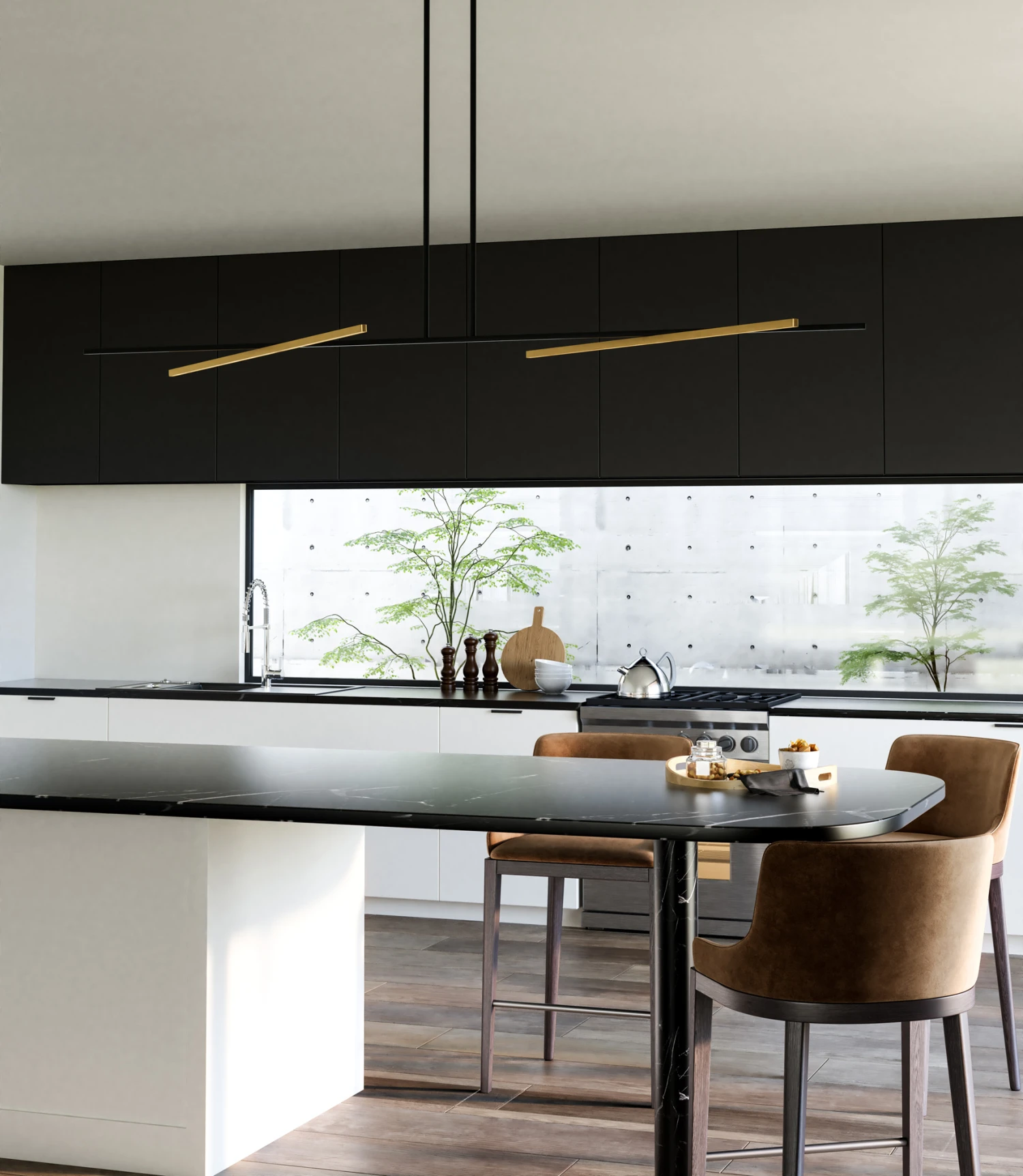 The Shift Linear Pendant brings a sleek, minimalist look to your interior space. The streamlined design, with two fully adjustable light bars, casts warm shadows across your room. Suitable for Sloped Ceilings up to 45 degrees.