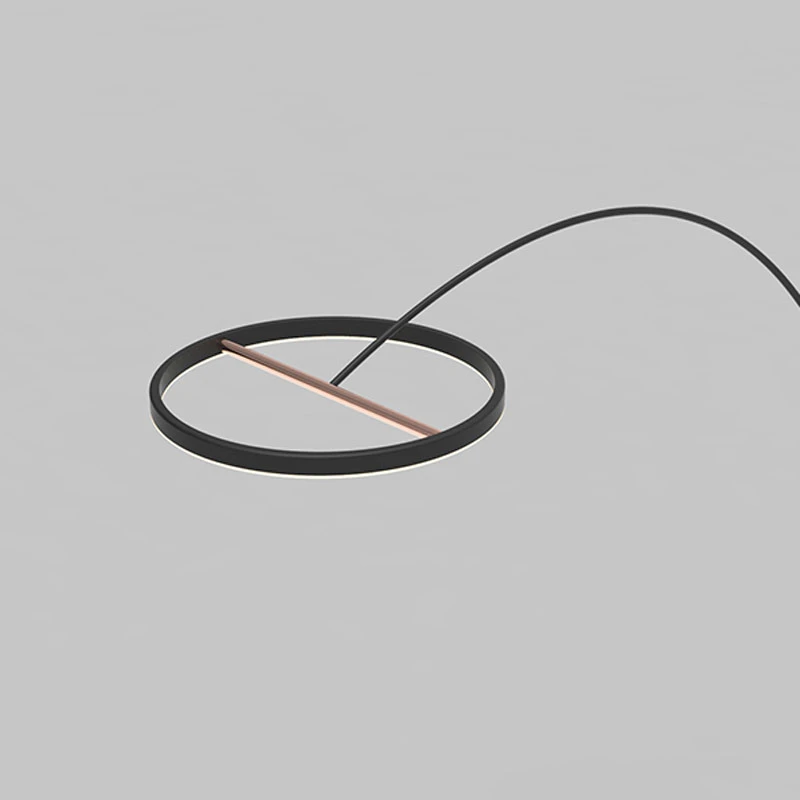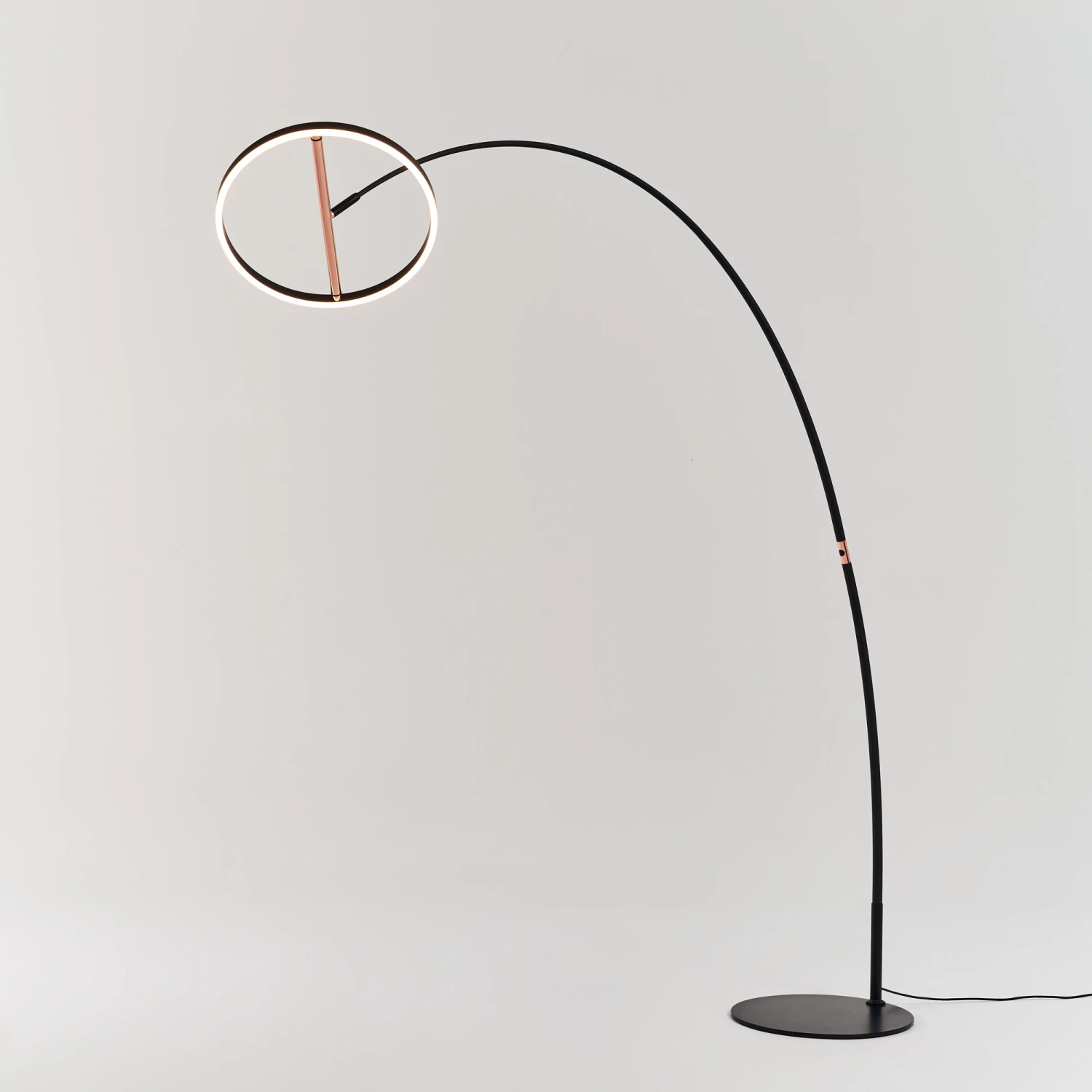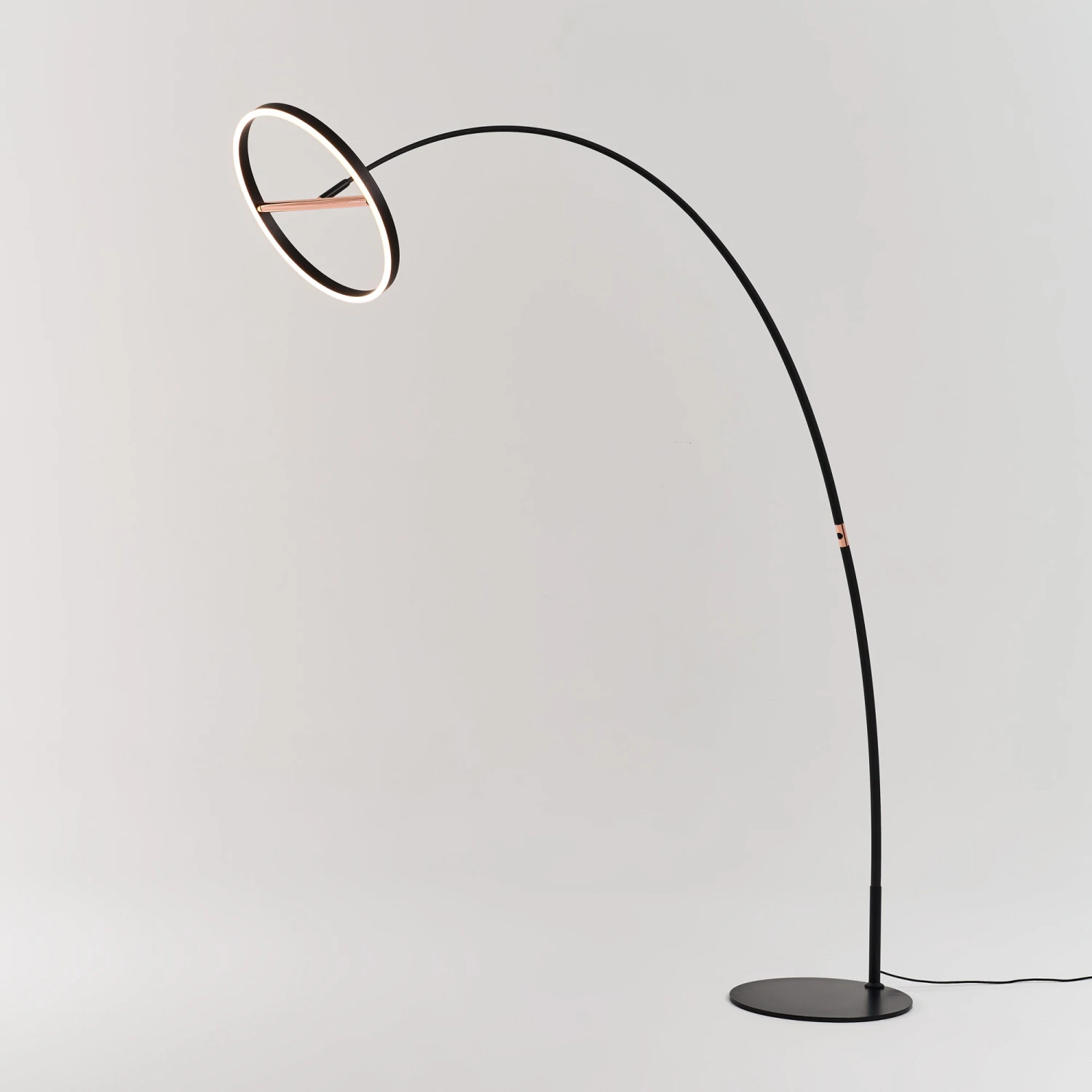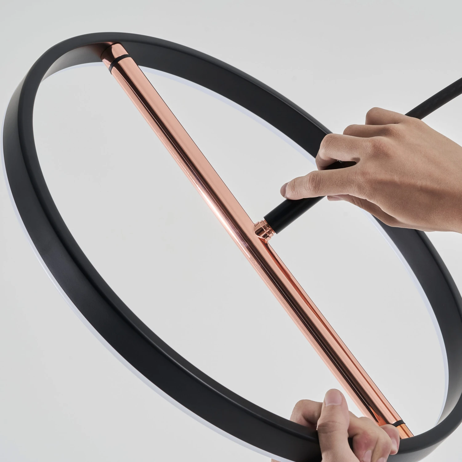 The SOL Mega Floor Lamp has a low-key design with elaborate consideration. The ring like shade is finely affixed to a metallic luster balance bar, demonstrating the definition of understated luxury. The adjustable ring tilt allows the pendant to function almost like a planet floating around stars. The invisible LED strip makes the light source impeccable, with a gradual dimming capability, rendering it possible for you to re-create your own personal sunrise and sunset. Available in Matte Black with Shiny Copper with a black textile cord. ETL listed.
